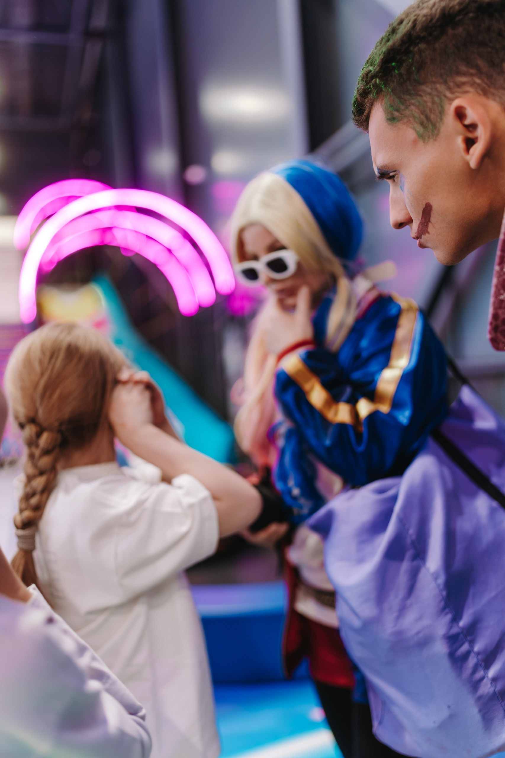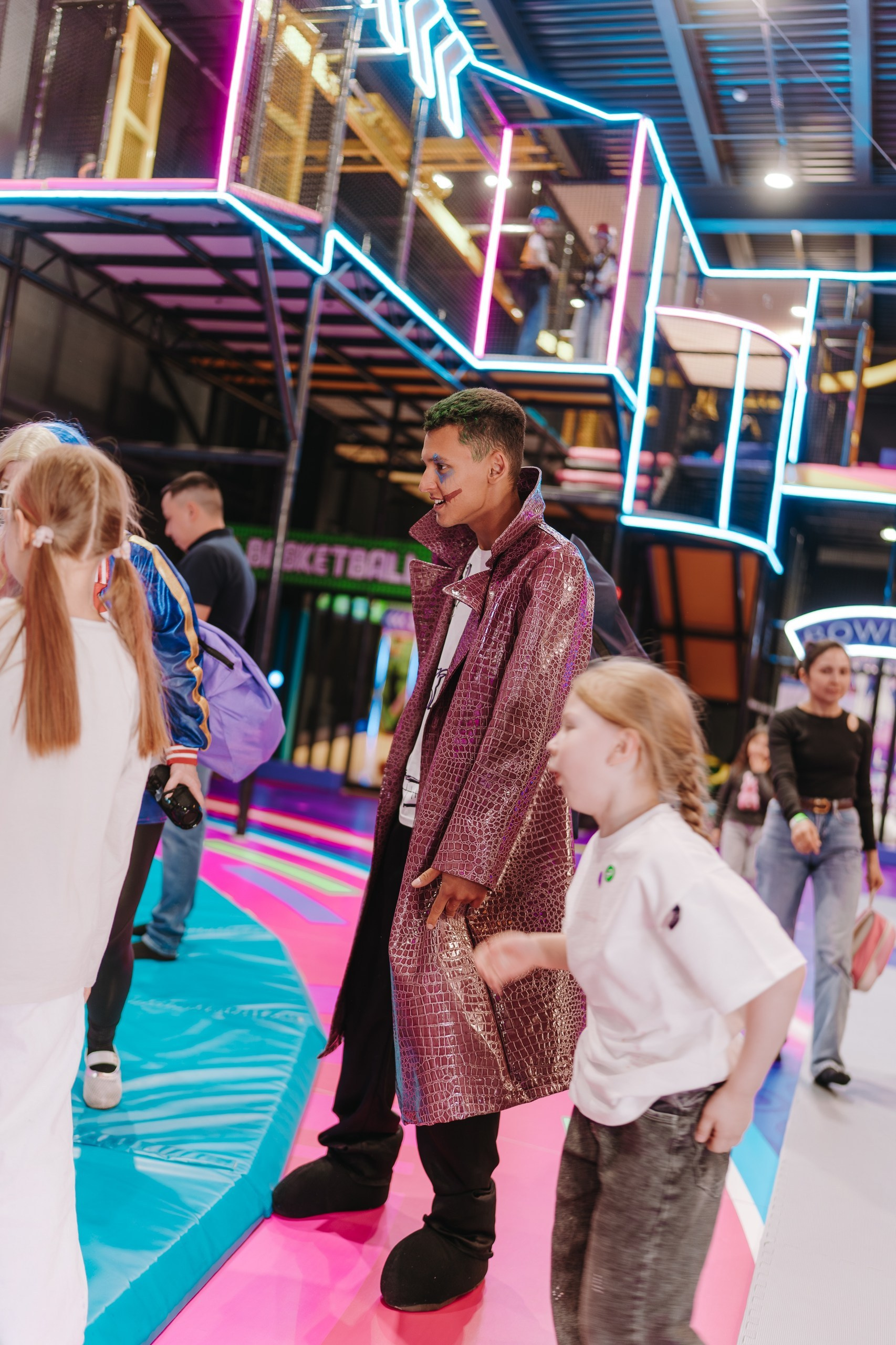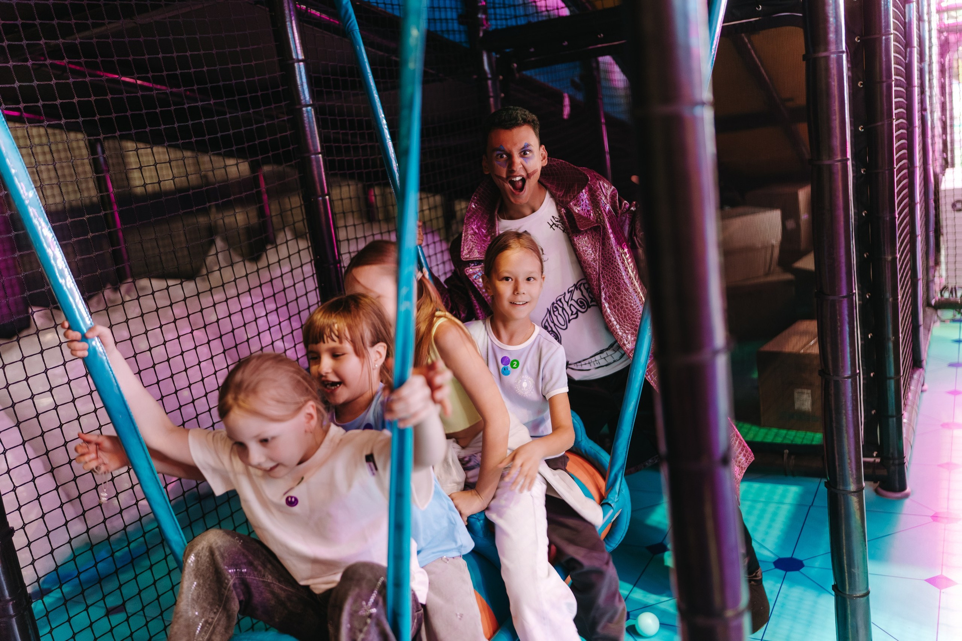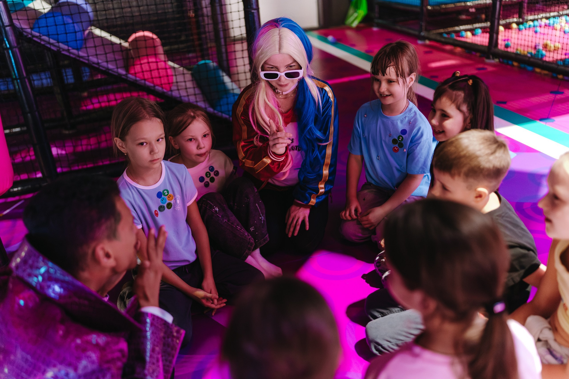 Дальше подключается анимация — в этот раз были персонажи Харли Квинн из вселенной DC, и вся основная съёмка переходит в репортажный формат. Я снимаю не «программу», а эмоции детей: смех, реакции, игры, живое общение.