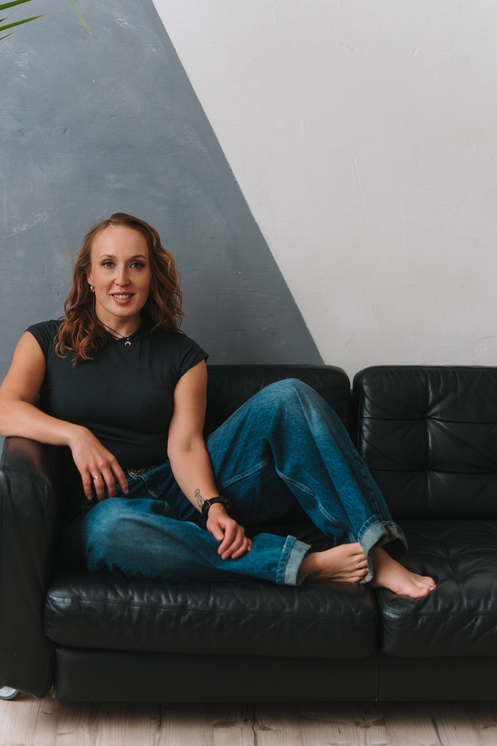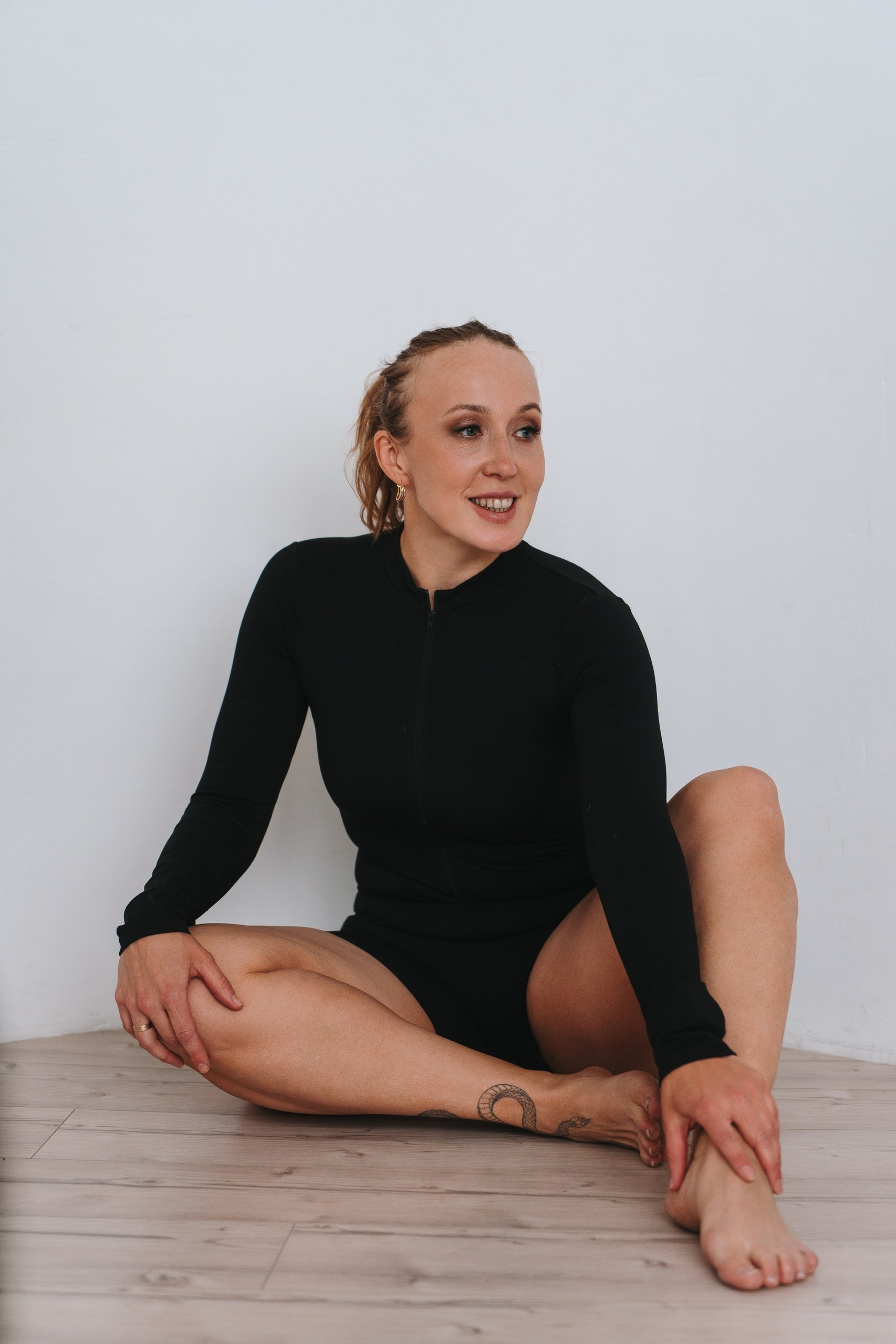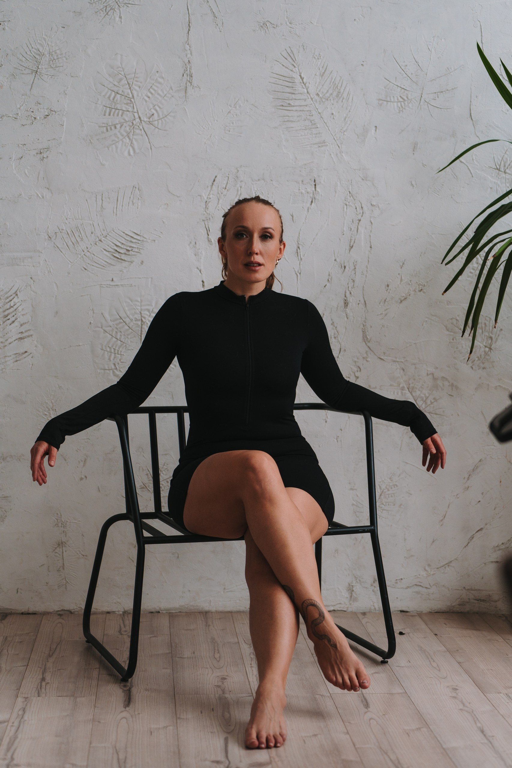 Второй образ — стильный и лаконичный: чёрный комбинезон, спортивный характер, более собранная эстетика. Катя — триатлонистка и предприниматель, поэтому такой образ отлично передал её характер.