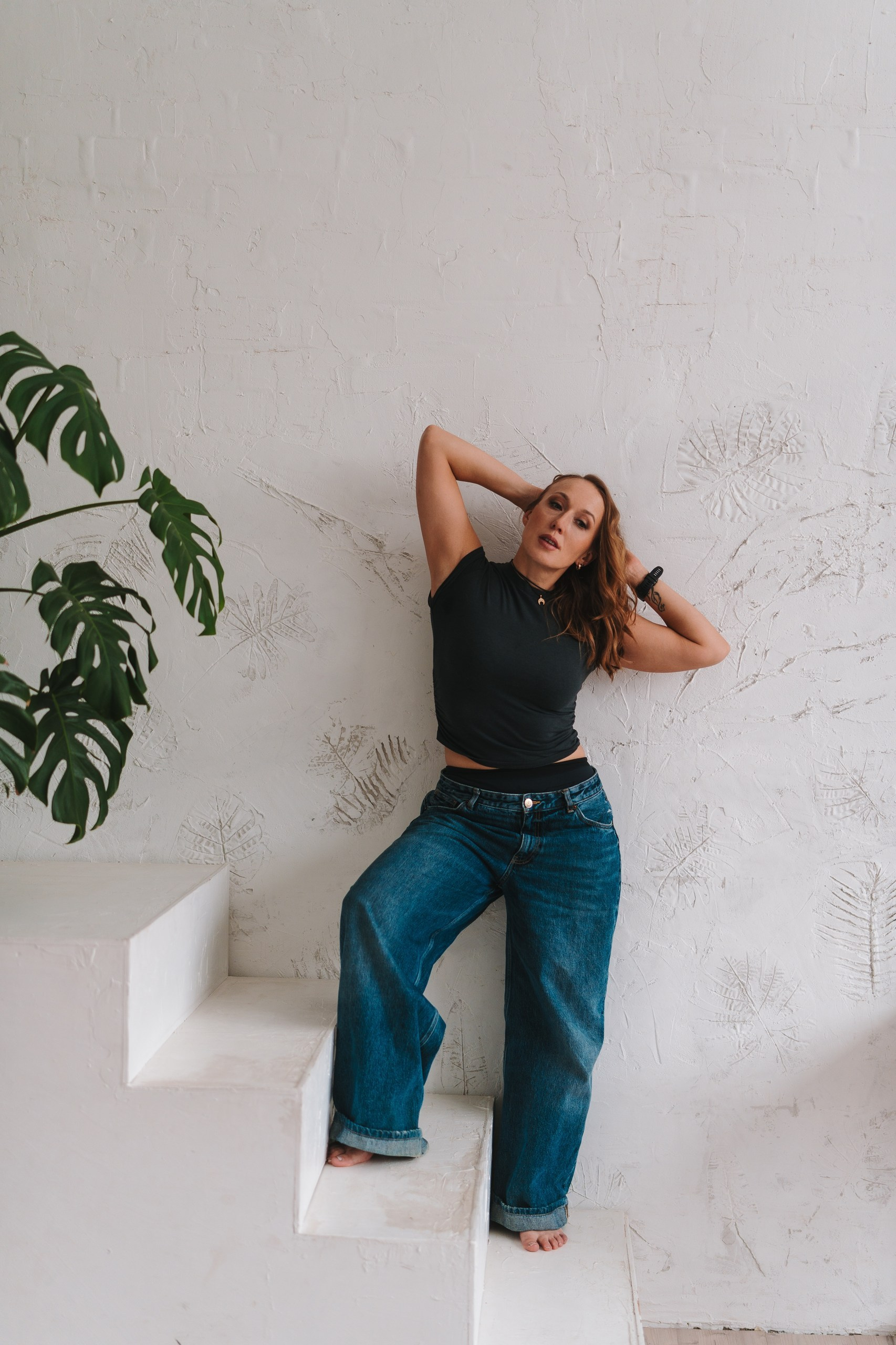 Первый — более повседневный и живой: чёрная майка, широкие джинсы и много естественных кадров с Барни. Я снимал их вместе — взаимодействие, эмоции, движение, и отдельно портреты Кати. Получилась очень живая серия.