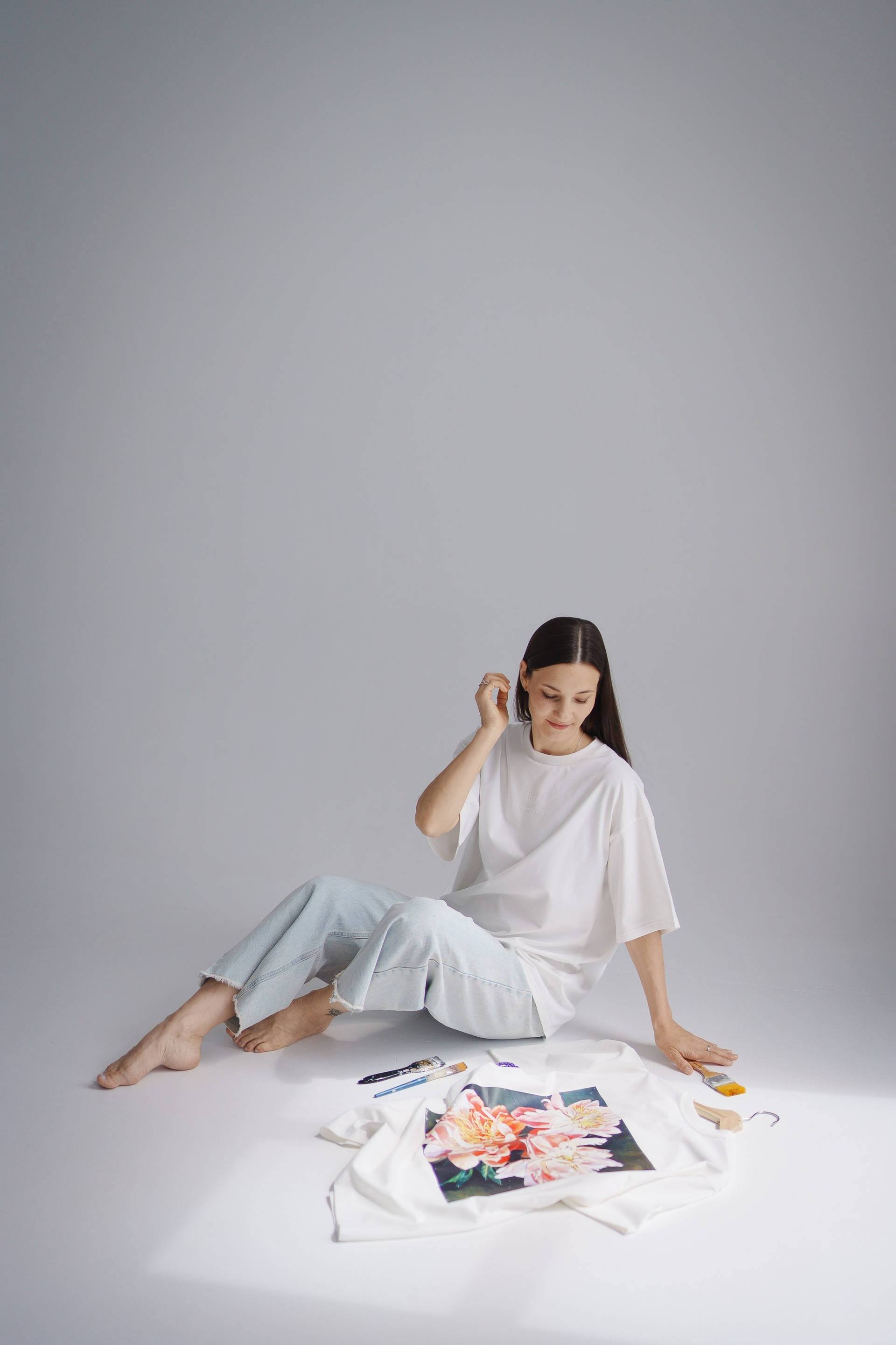 Июнь, лето, свет и студийная съёмка — ко мне написала Аня, с которой мы давно знакомы. Аня работает с искусством в Уфе, занимается картинами и хорошо известна в творческой среде. Она рассказала идею: есть четыре классные девушки, одна из них — дизайнер одежды, и они запускают лимитированную коллекцию оверсайз-футболок. Принты — это реальные картины, аккуратно переработанные и перенесённые на ткань. Бренд называется Item Ministry.