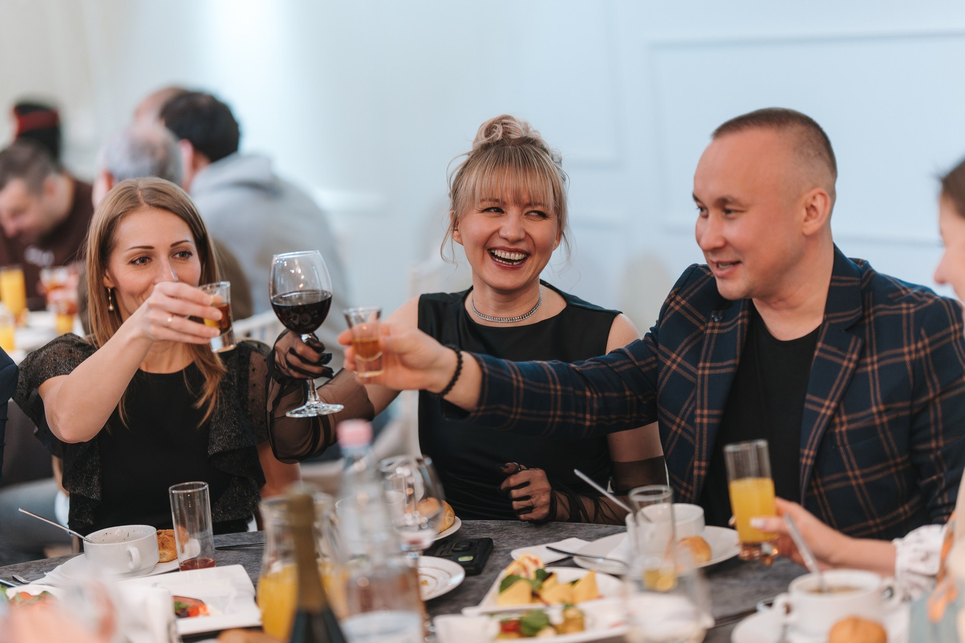 Место выбрали уютное и правильное для формата — банкетный зал Art Hall, который находится в Гостинном Дворе. Формат вечера — спокойный, разговорный, с фотозоной и интерактивами за столами. С живыми эмоциями, улыбками, диалогами и тем самым корпоративным вайбом, ради которого и нужна нормальная съёмка мероприятий.