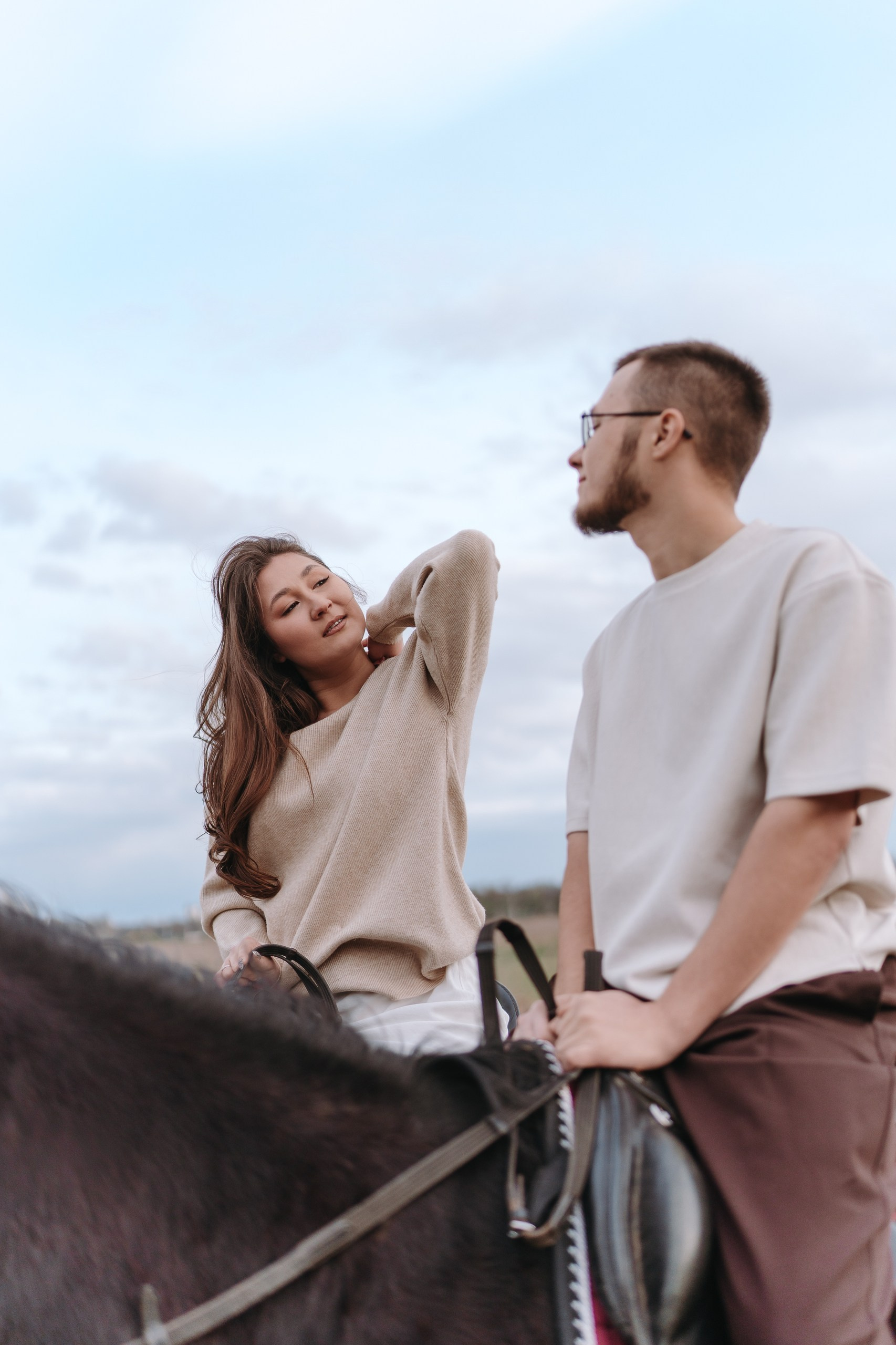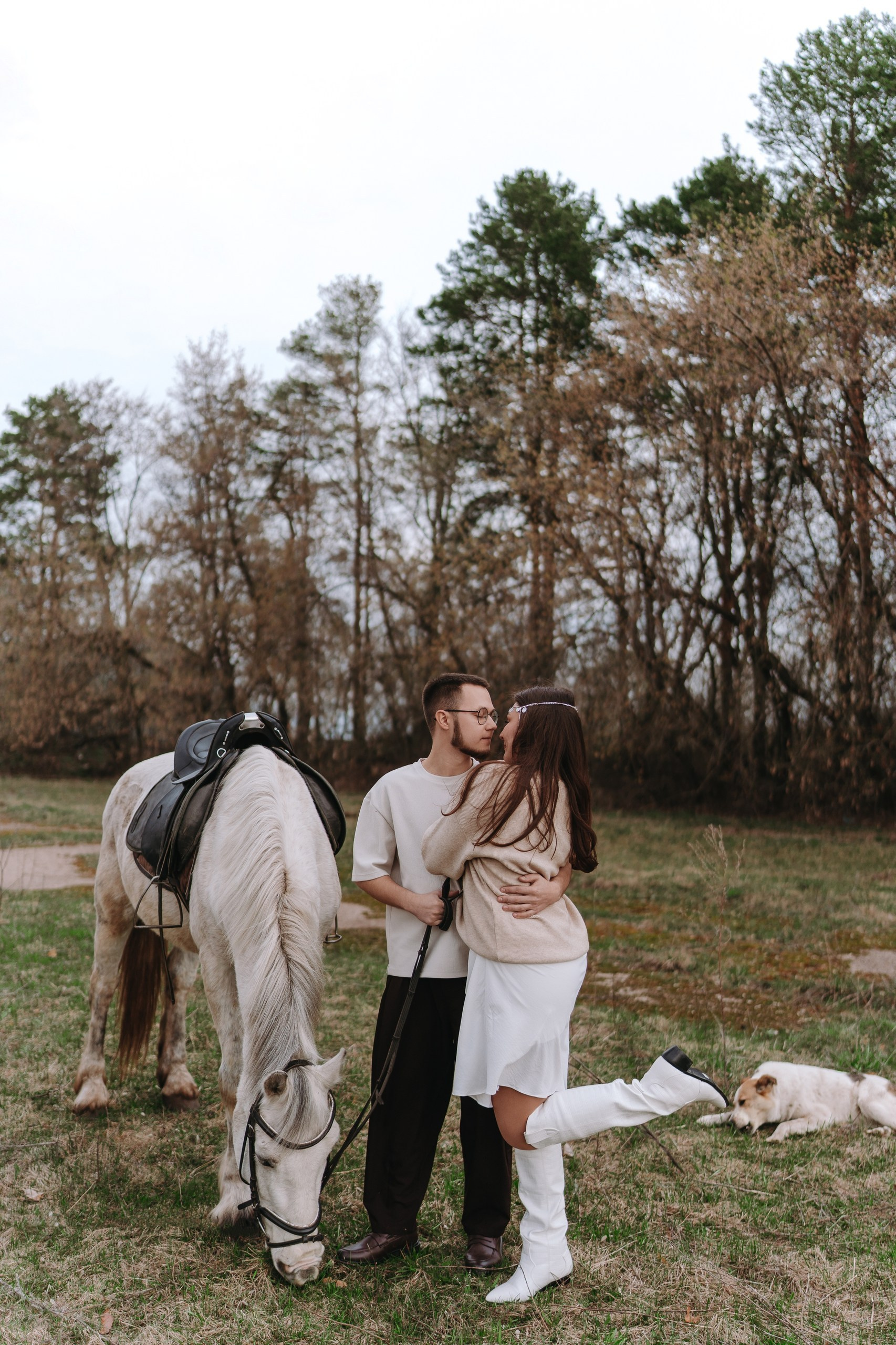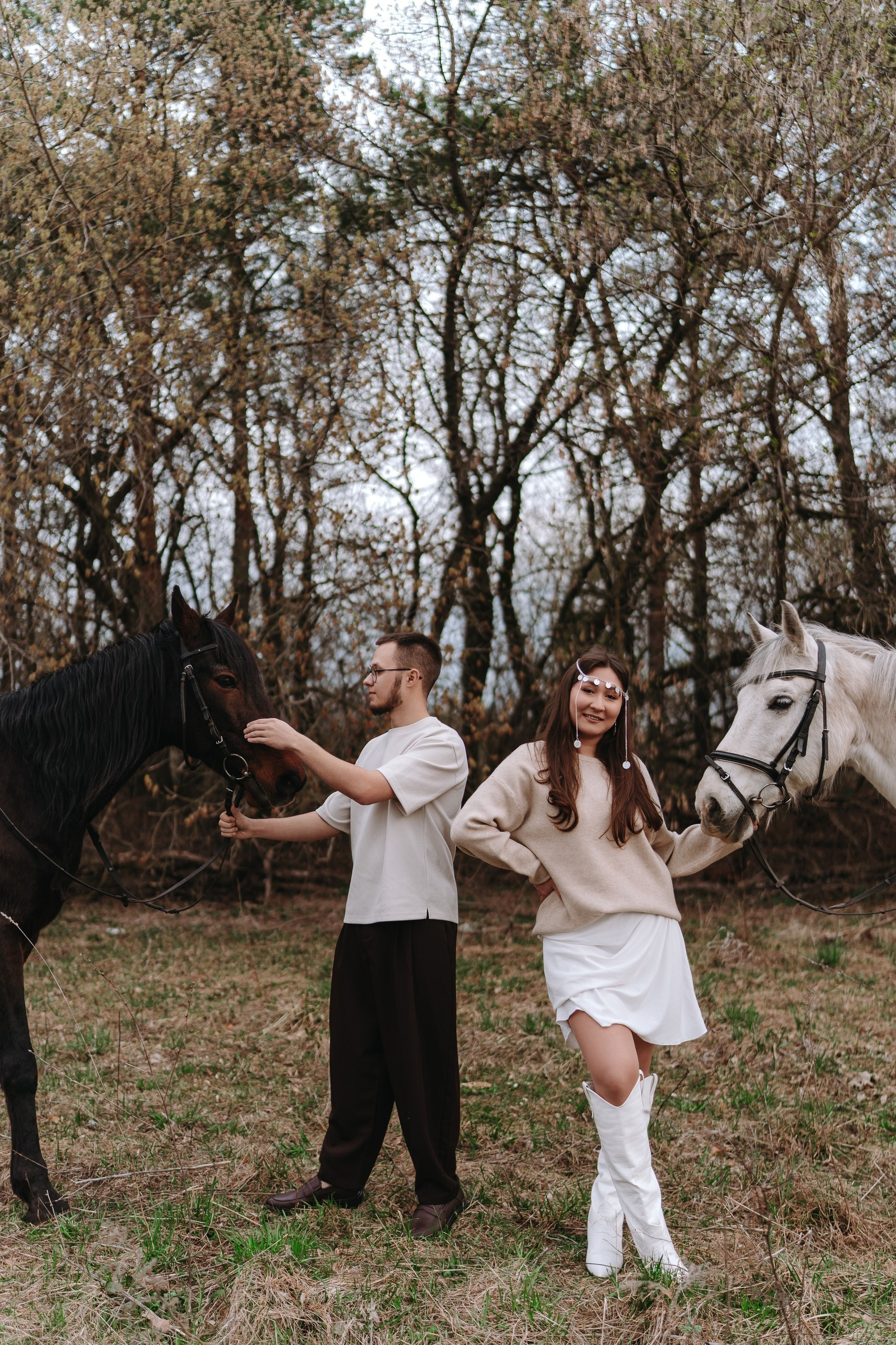 Эта лавстори в Уфе как раз такая — почти +5 градусов, апрель, ветер, и мы едем в Миловский конный клуб снимать предсвадебную фотосессию.