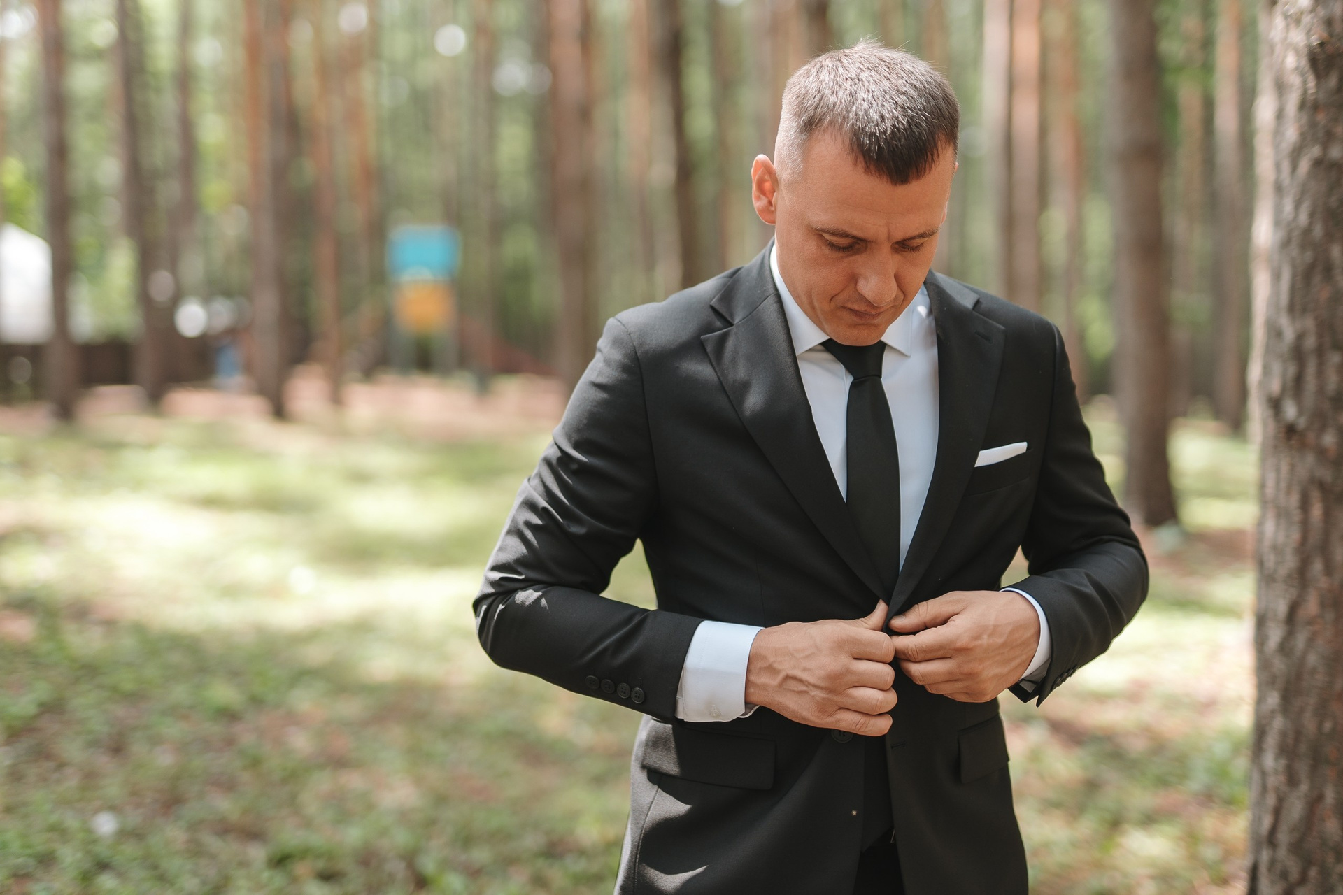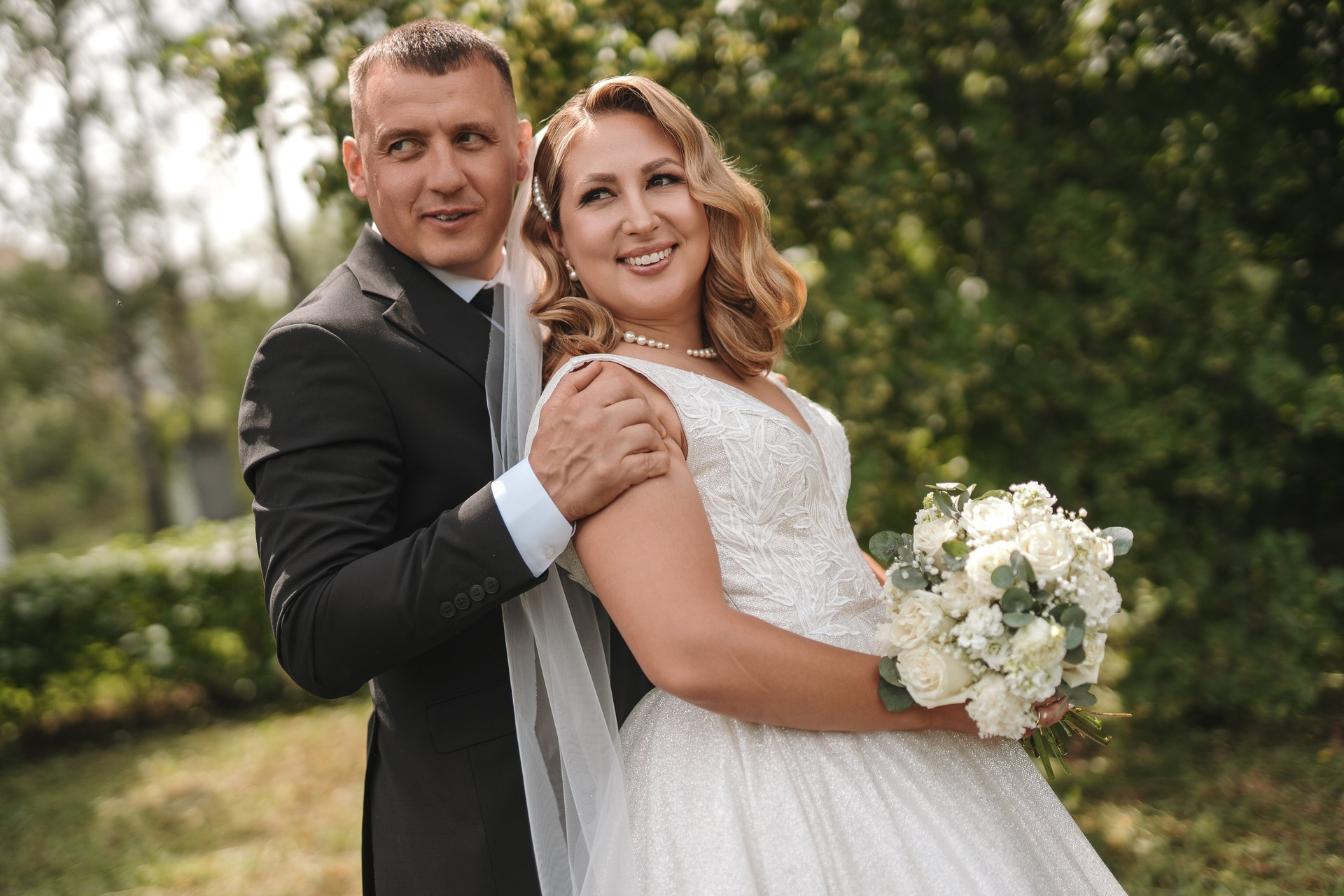 Далее отправились в Президент Отель — сосны, тень, мягкий свет. Это идеальное место для свадебной фотосессии в Уфе на природе, особенно в жаркую погоду.