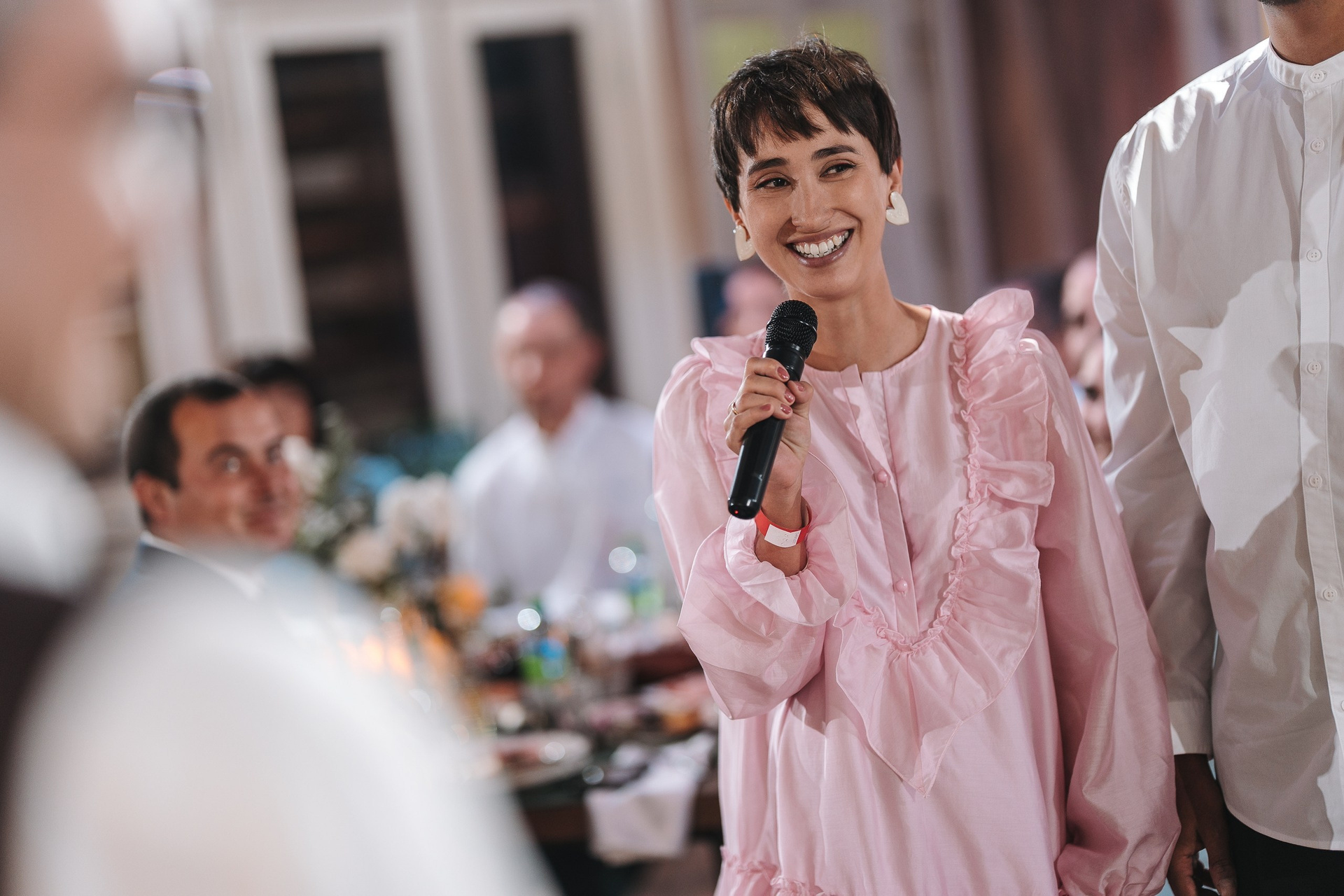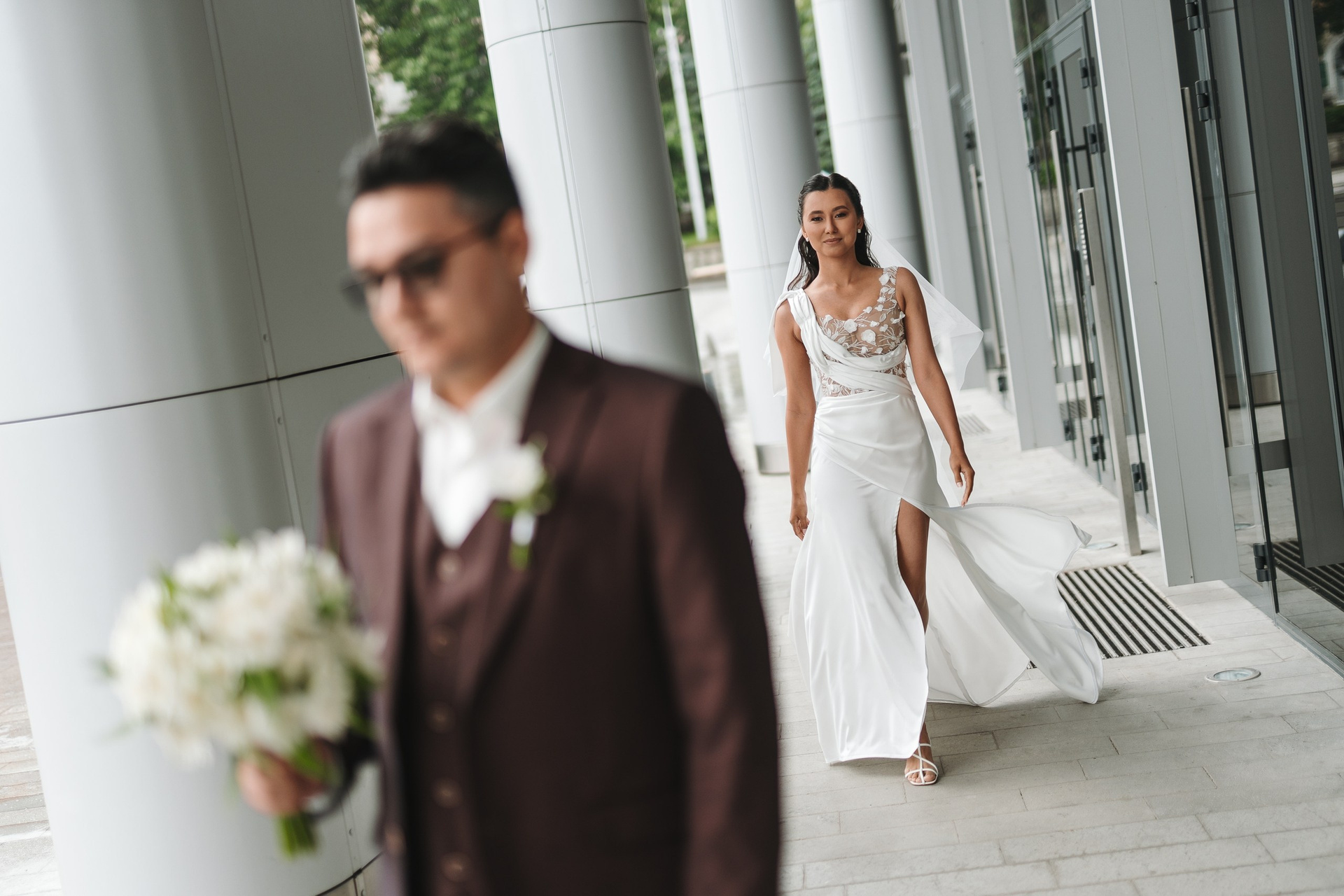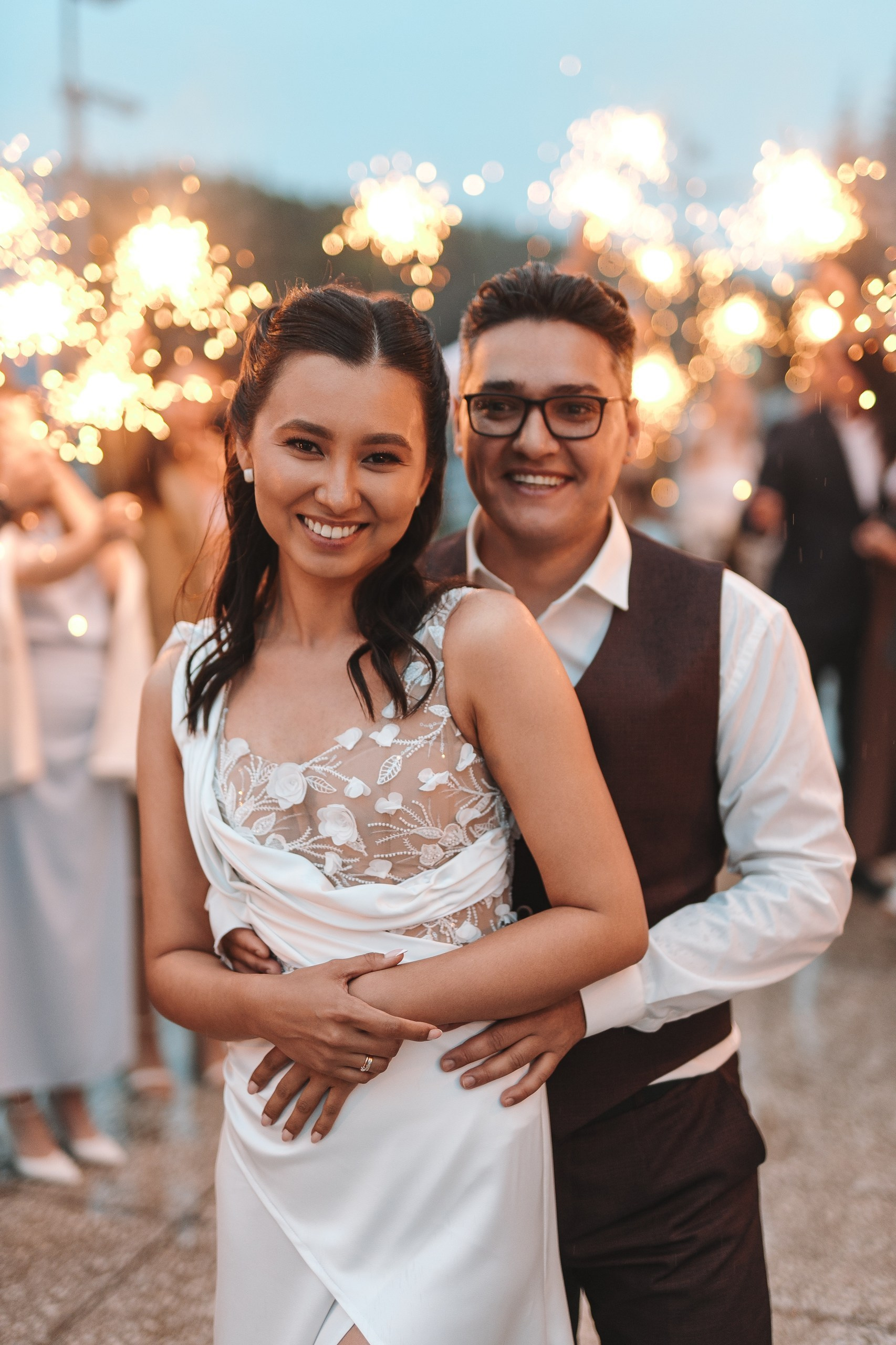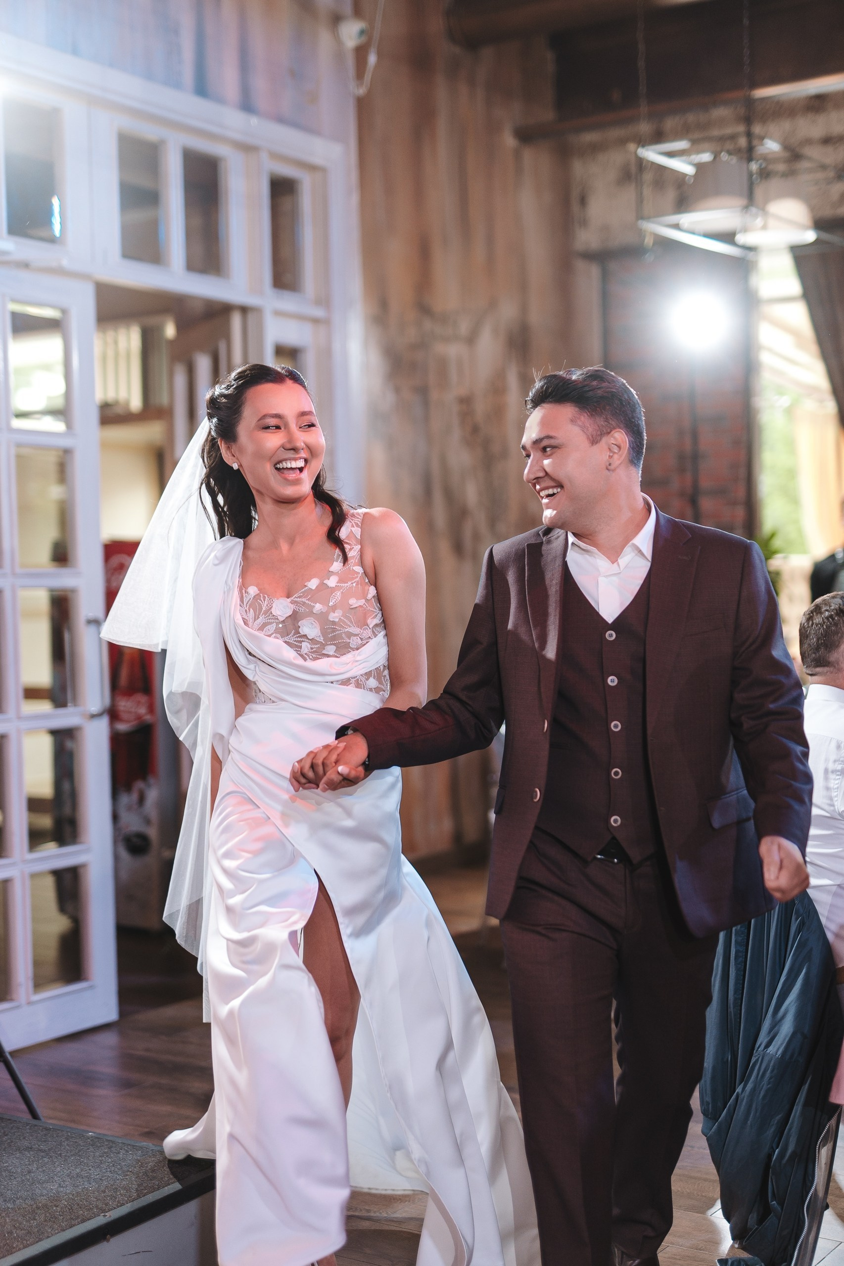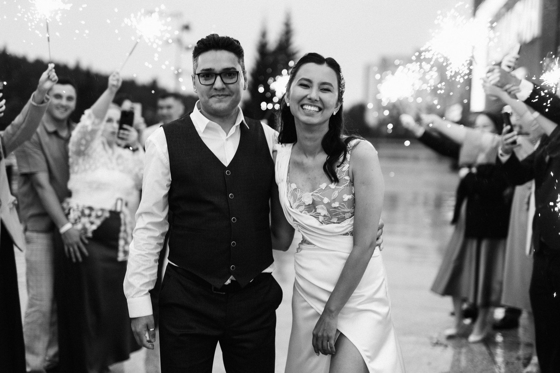 Невеста по ходу вечера сменила образ на более короткое коктейльное платье — это всегда круто работает, добавляет динамики и разнообразия в серию.