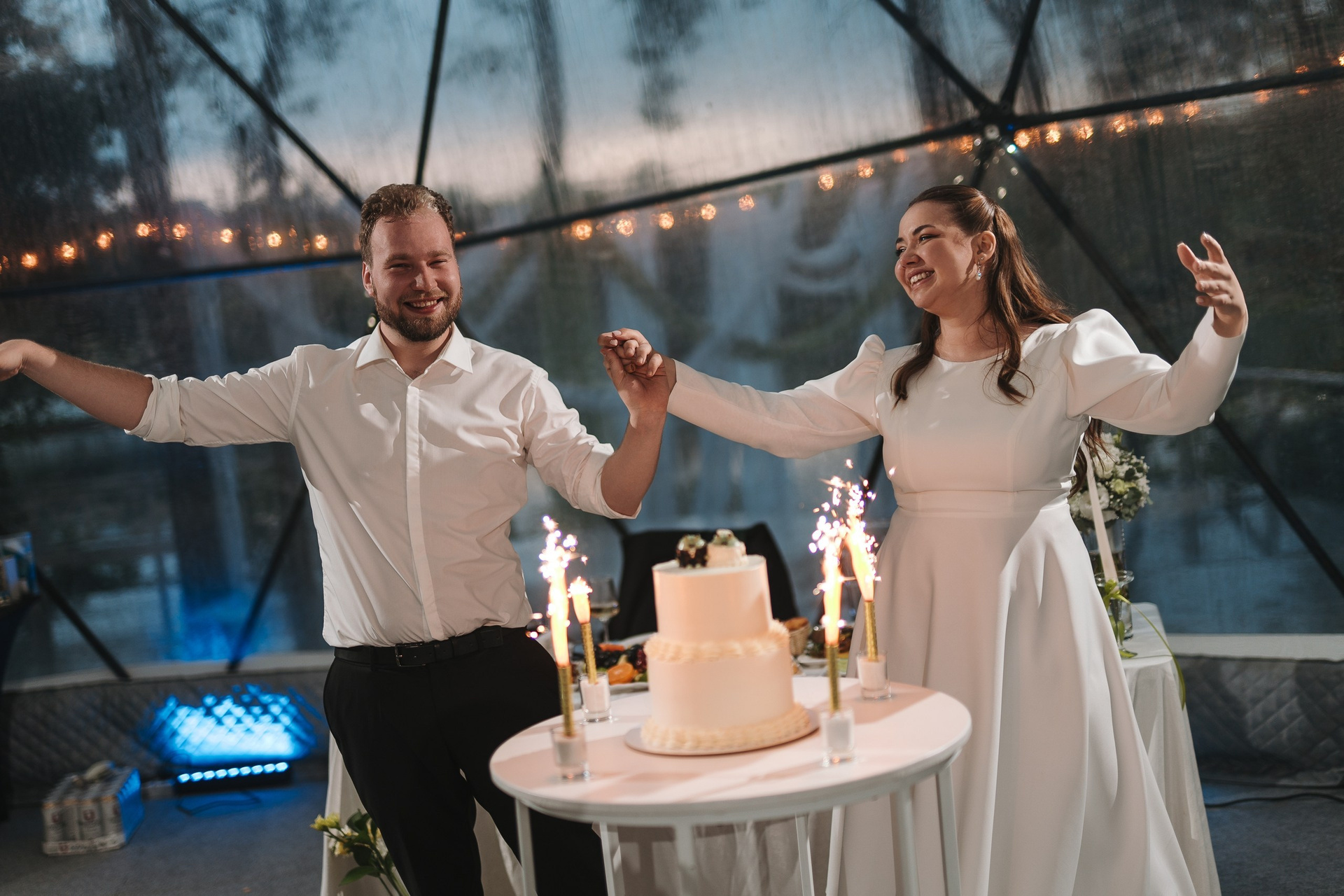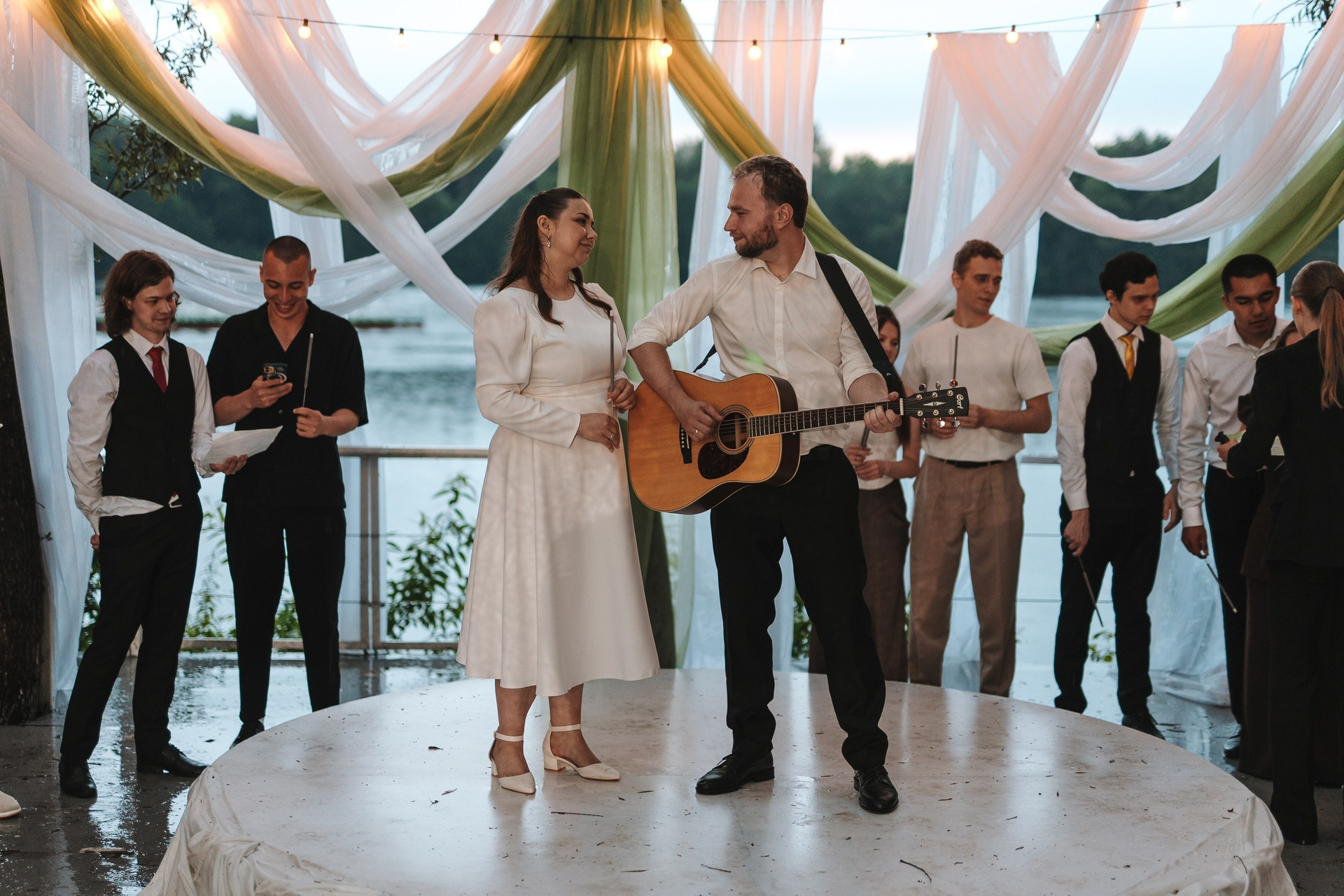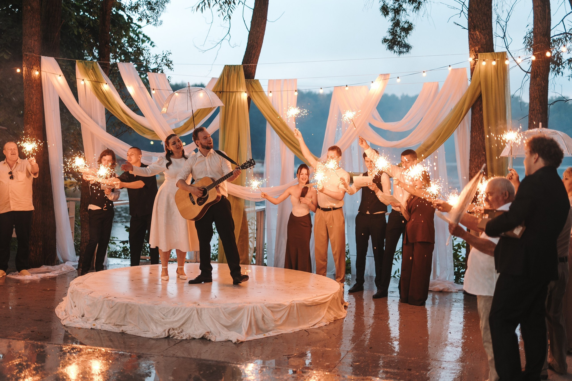 бенгальские огни на берегу пирса и живая музыка: жених играл на гитаре песню «Мы желаем счастья вам». Очень тёплое завершение дня.