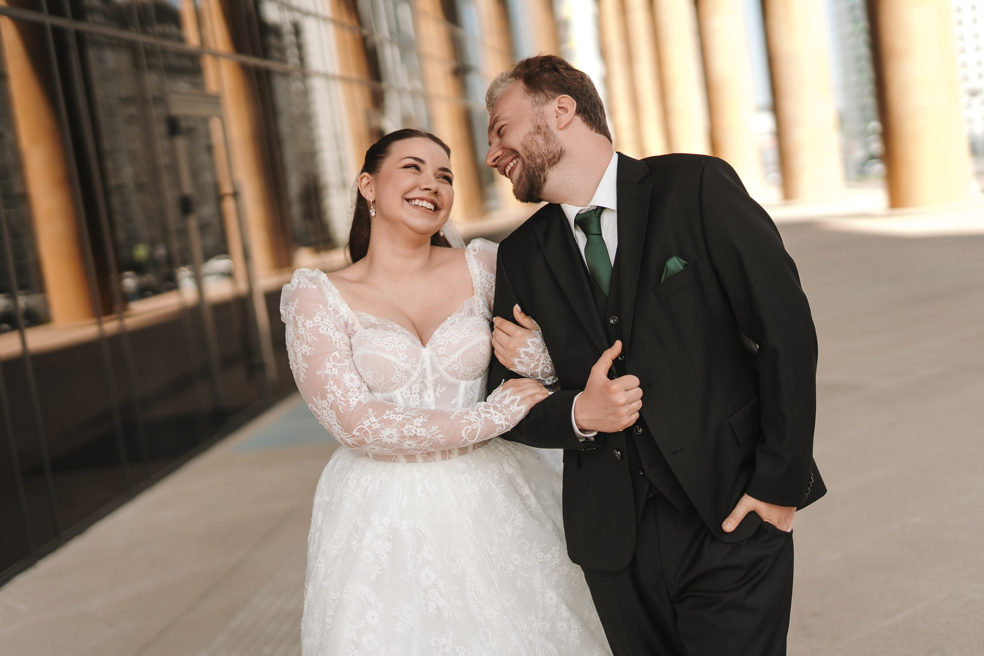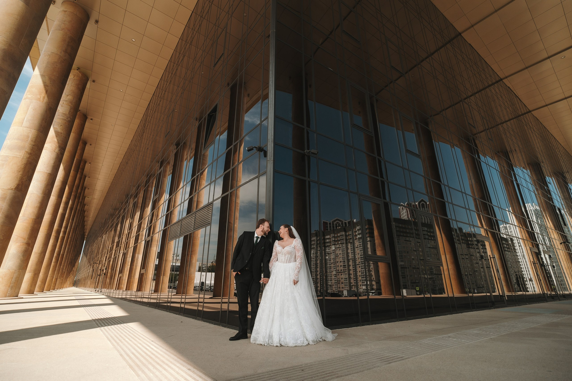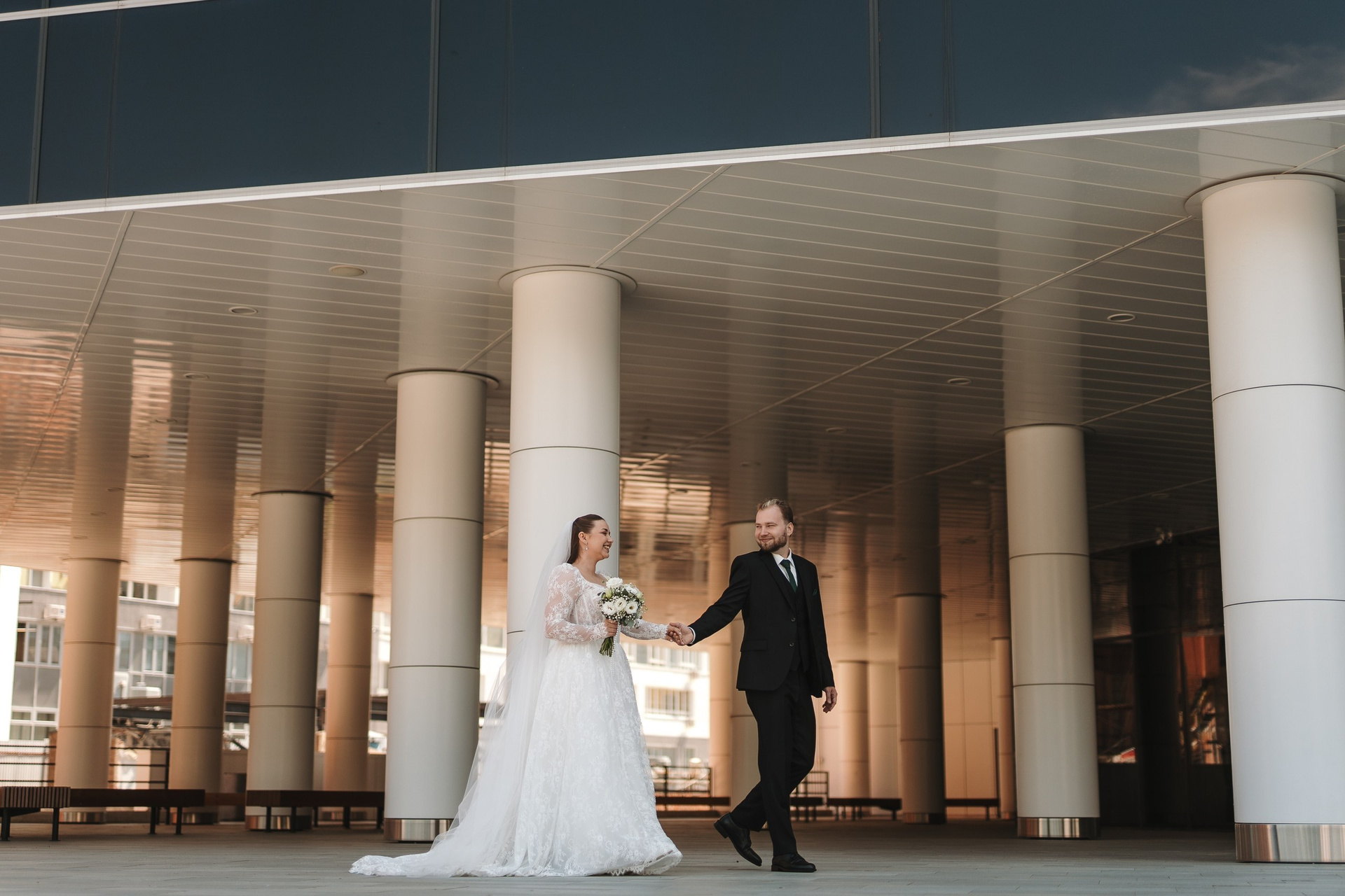Дальше поехали к Дворцу борьбы — это одна из самых сильных архитектурных локаций в Уфе. Колонны, масштаб, геометрия — идеально для свадебной фотосессии с характером.