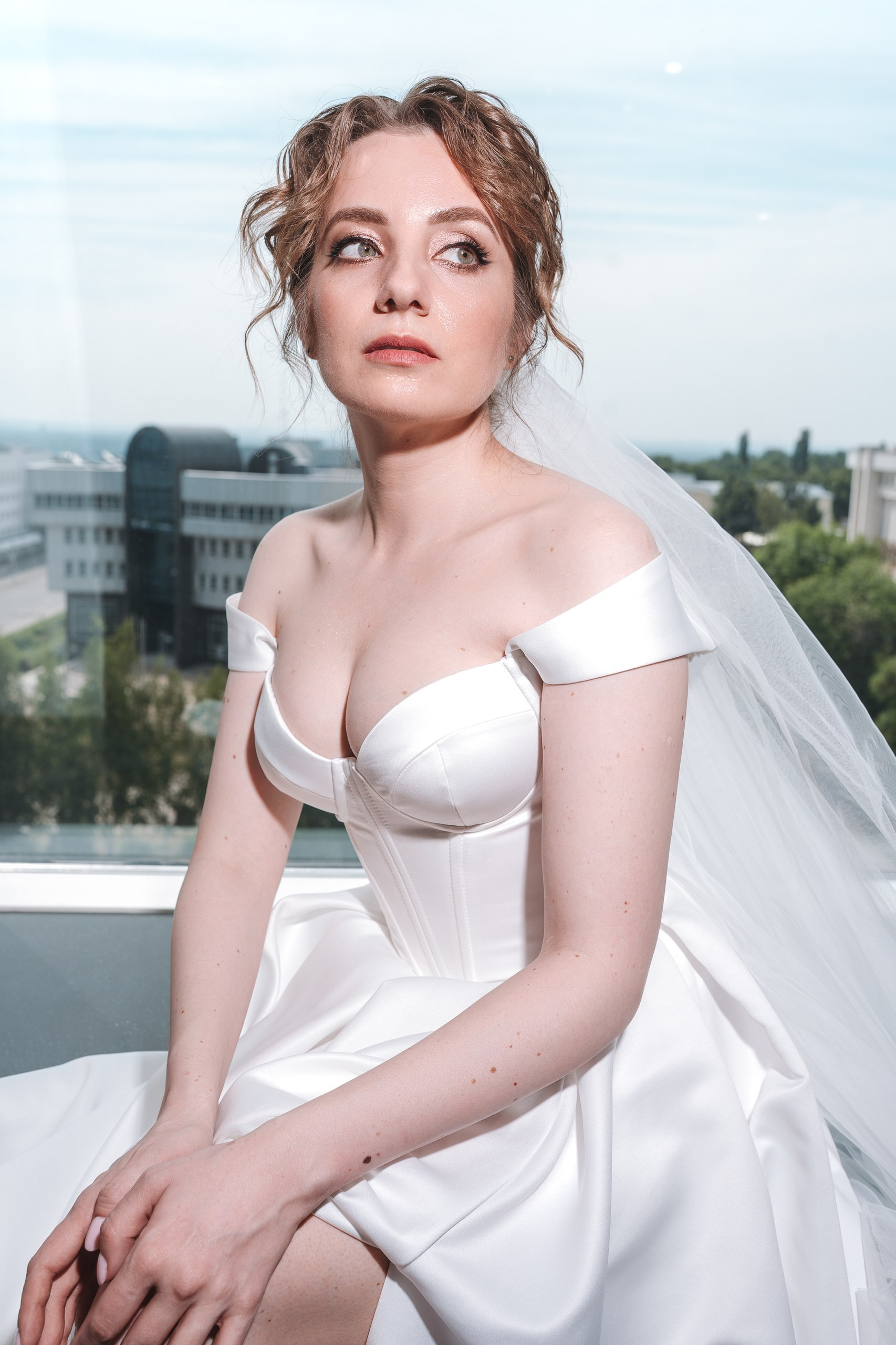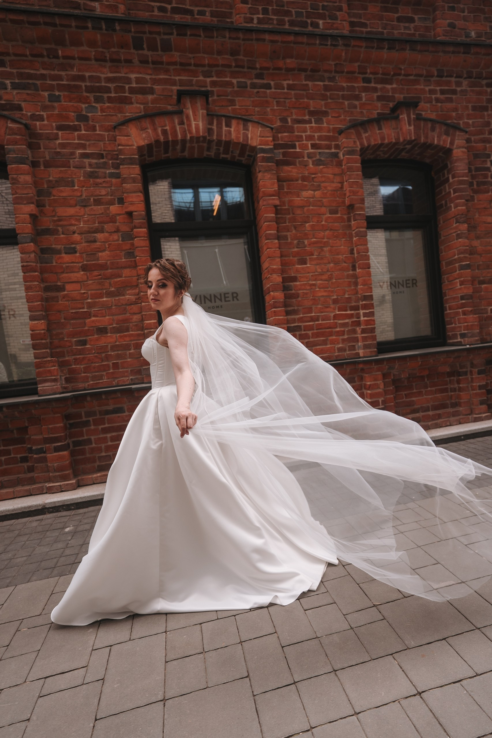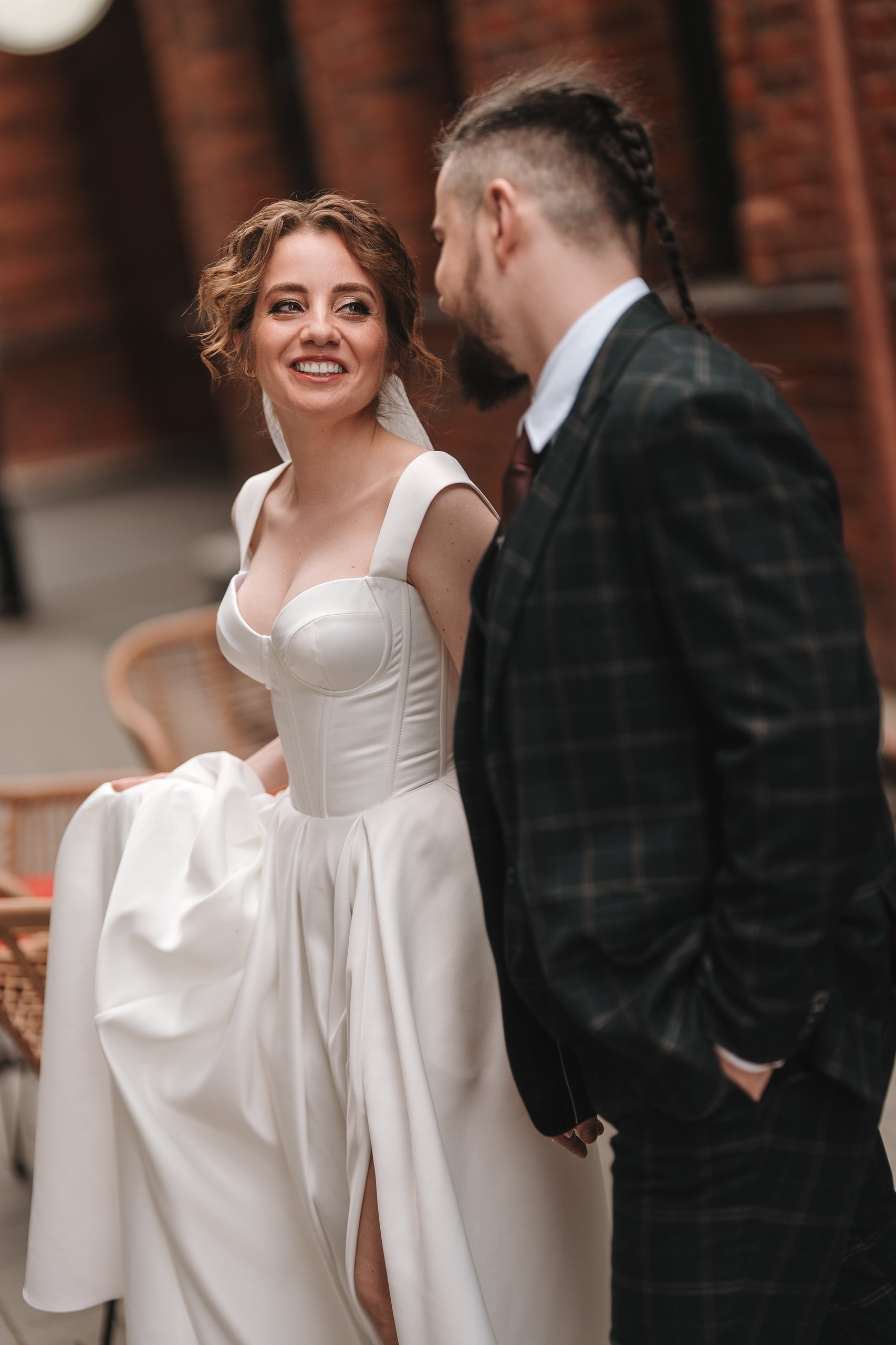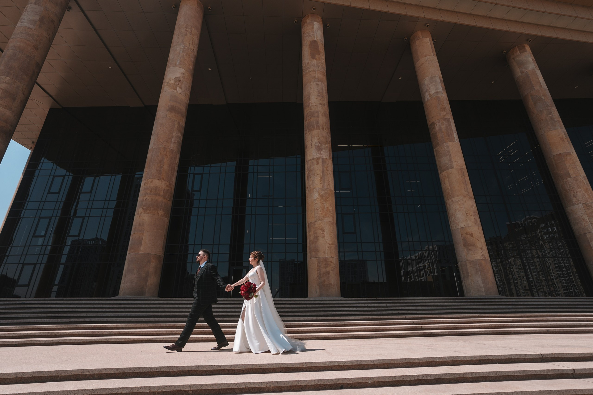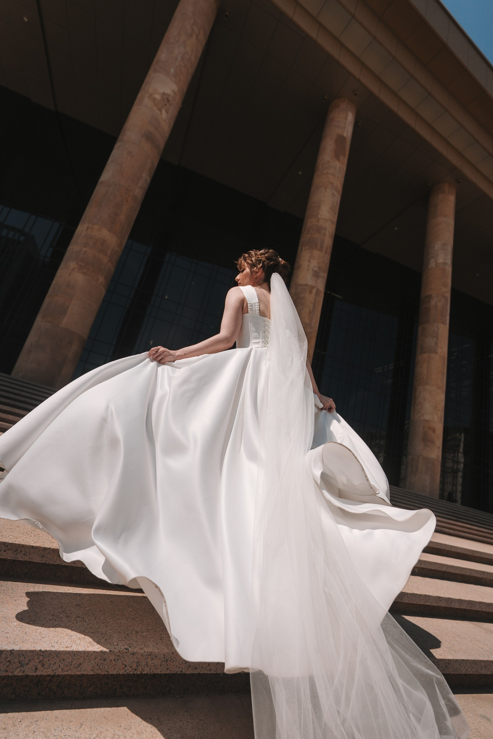Дальше отправились на фотосессию в ЖК «Империал» — это отличное место для свадебной фотосессии в Уфе: современная архитектура, чистые линии и разнообразные фоны. После этого заехали в Дворец борьбы, где сделали более масштабные и графичные кадры.