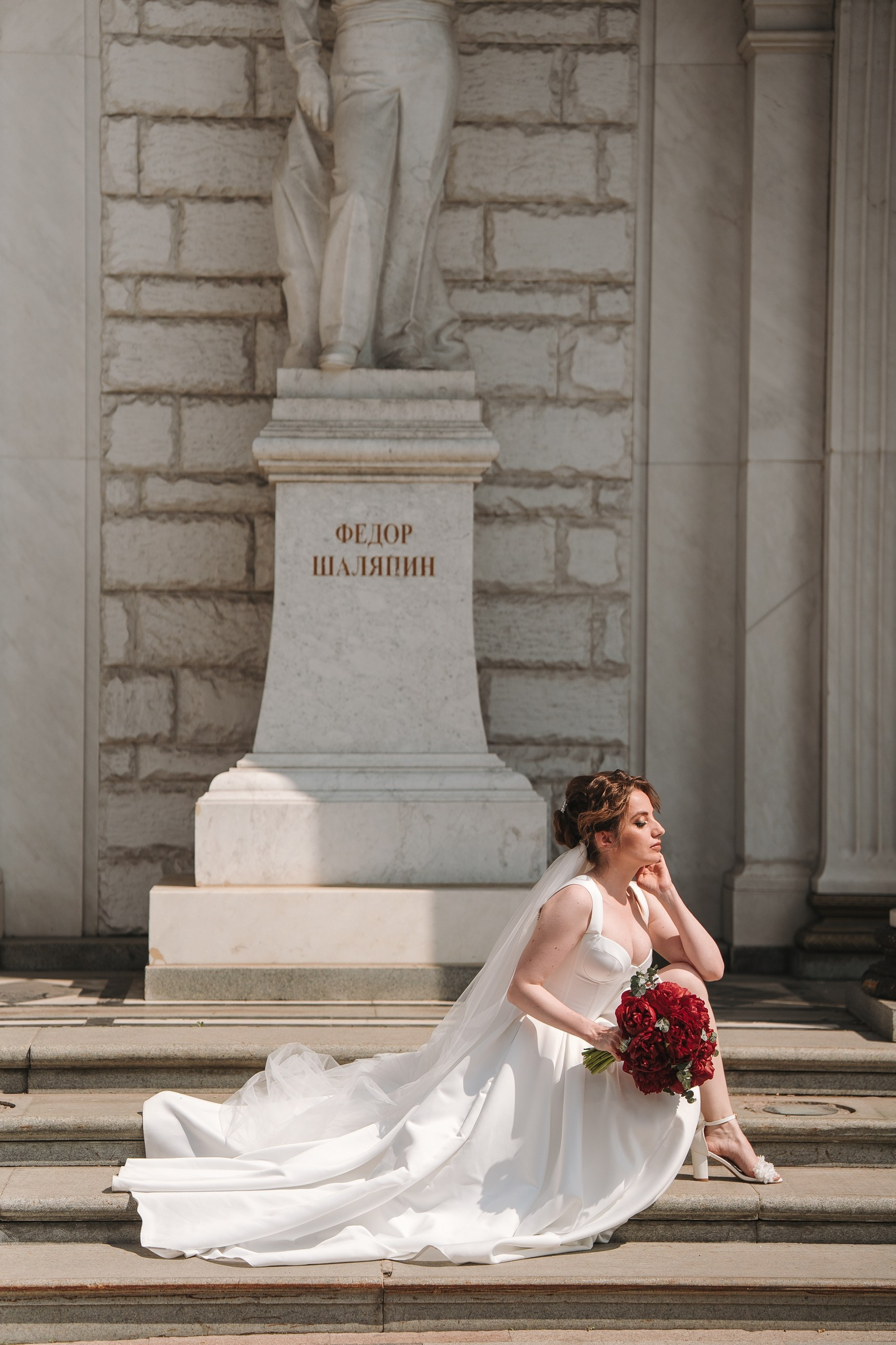 Затем поехали на регистрацию в ЗАГС на Рихарда Зорге. После церемонии сделали фотографии у памятника Шаляпину, что добавило серии классическую атмосферу центра города.