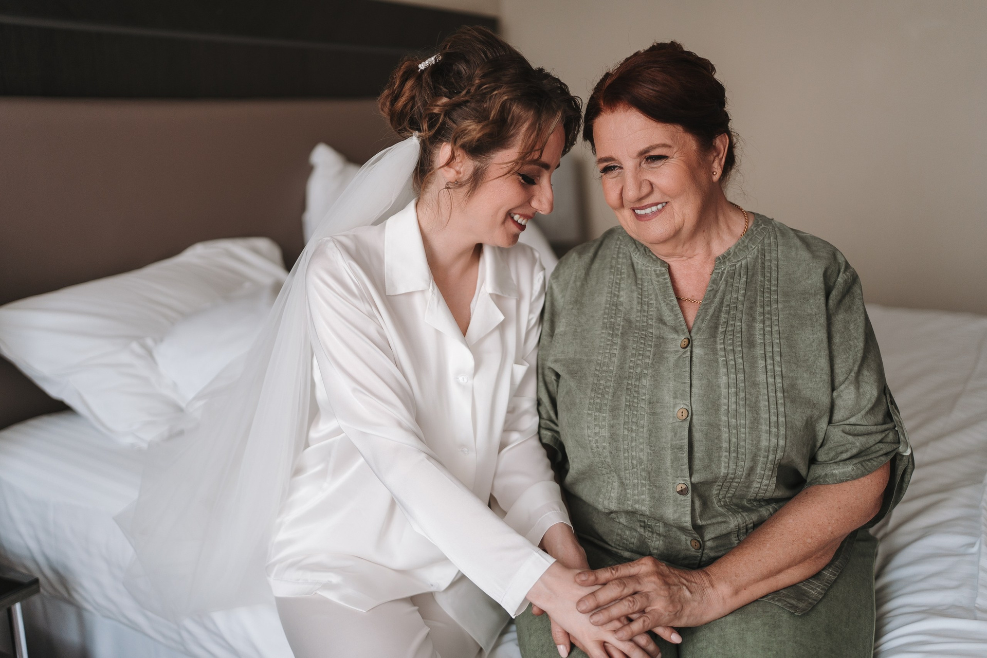 Начали мы с утра невесты и жениха в Sheraton. Снимали сборы в номере и коридорах отеля — получилось много атмосферных кадров. Отдельно сделали нежные фотографии невесты с мамой, затем — совместные сборы пары. После этого прошла первая встреча, и мы немного поснимались в лобби отеля.