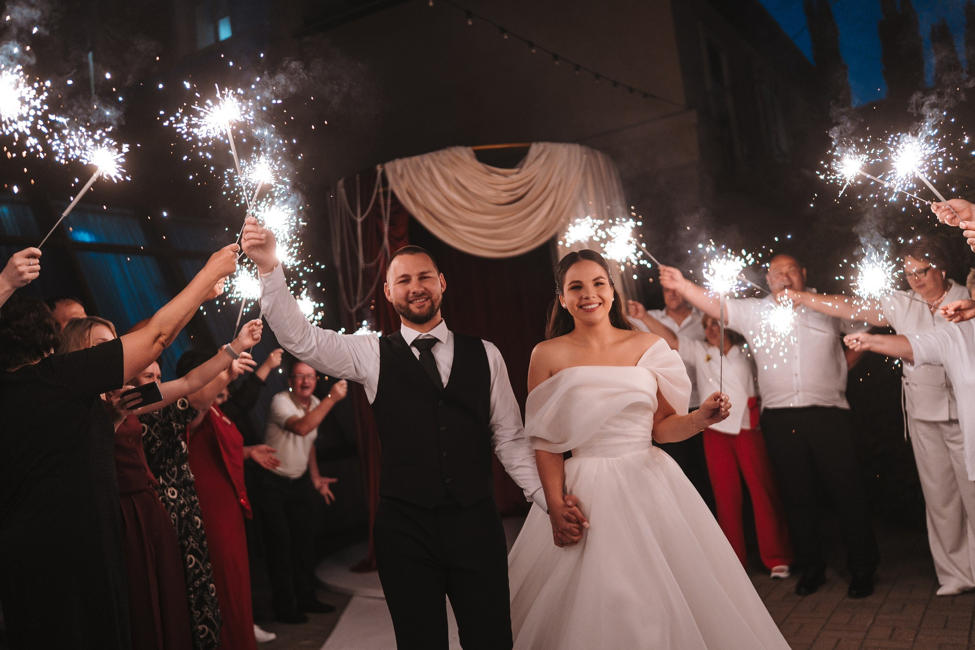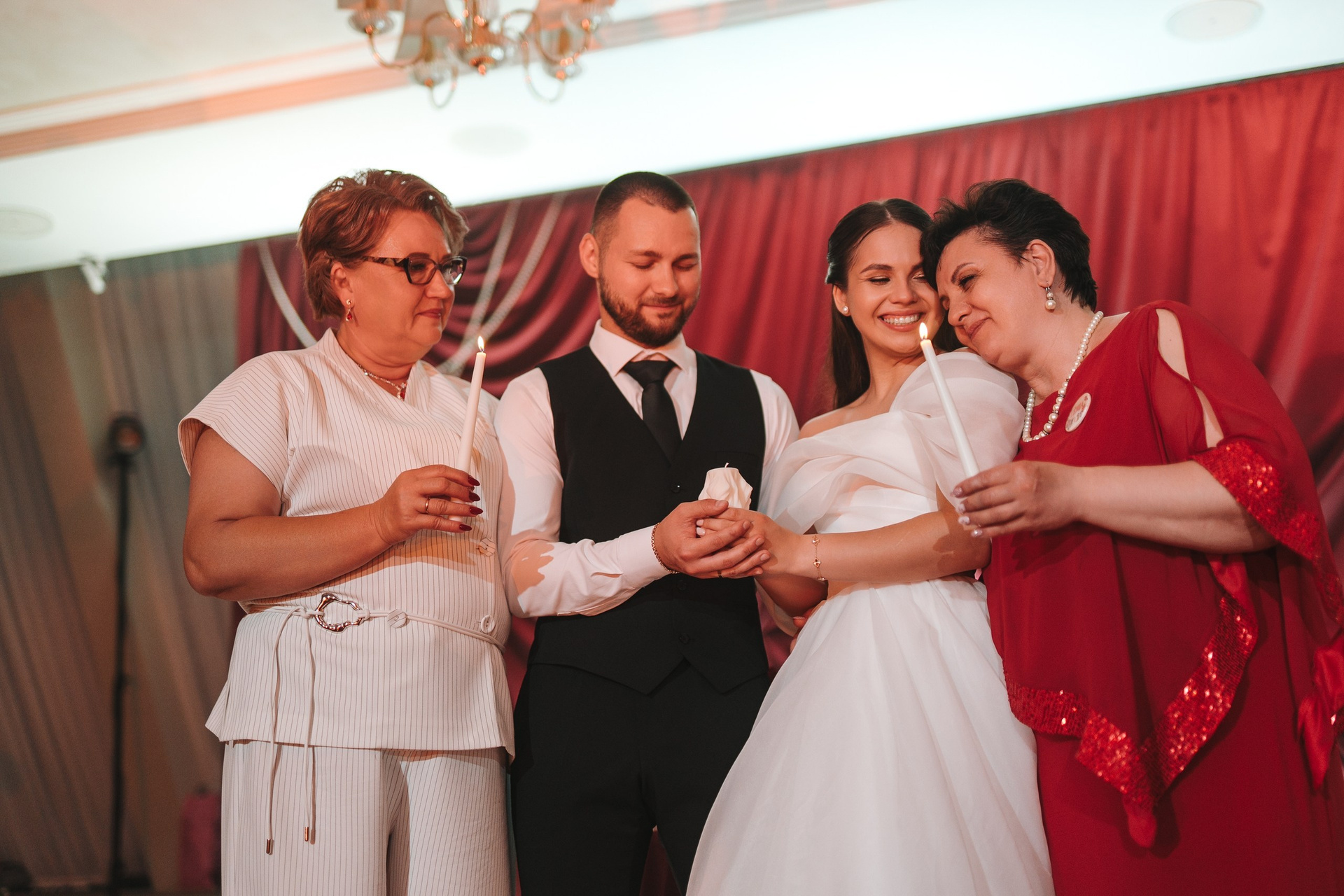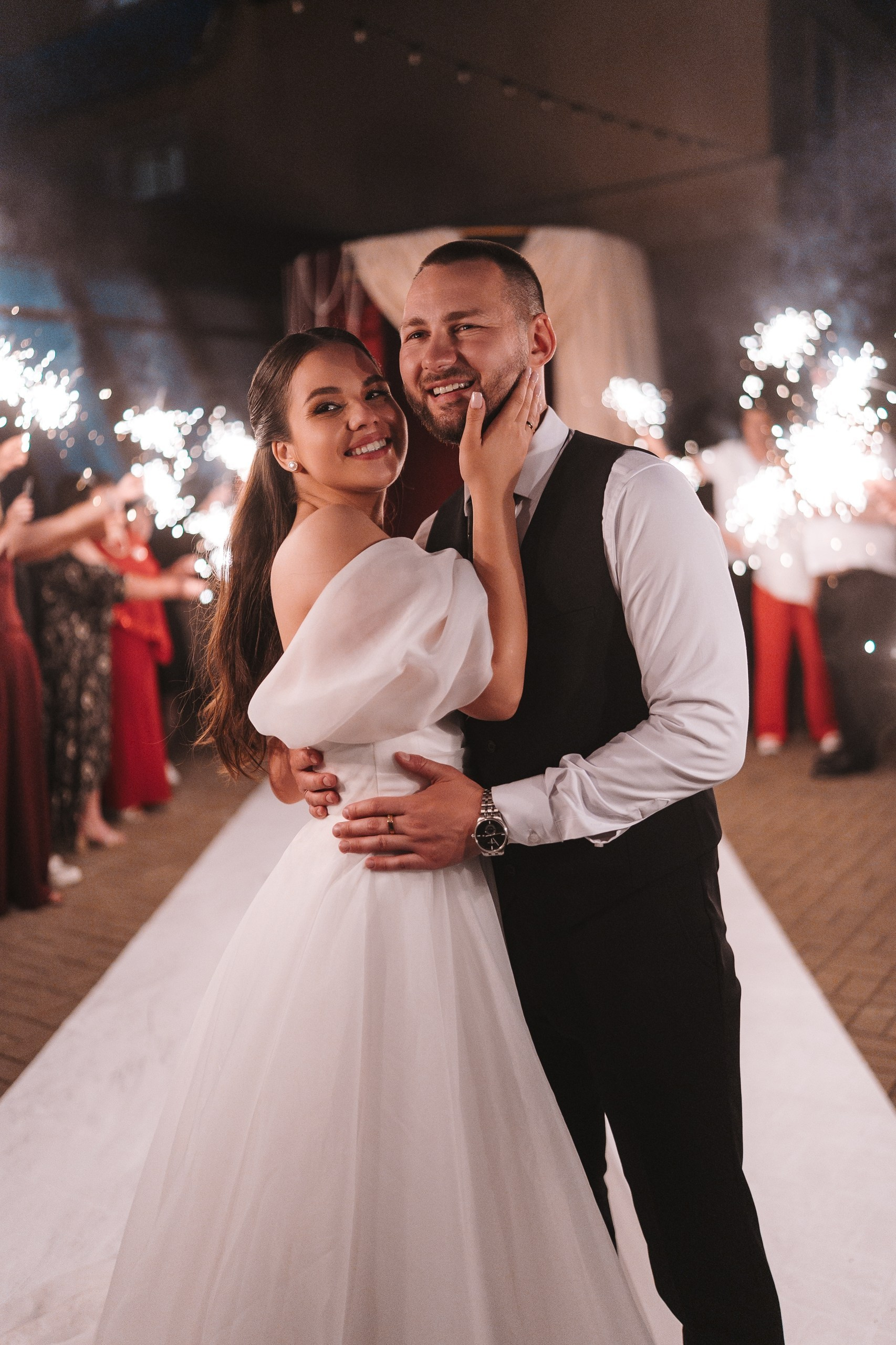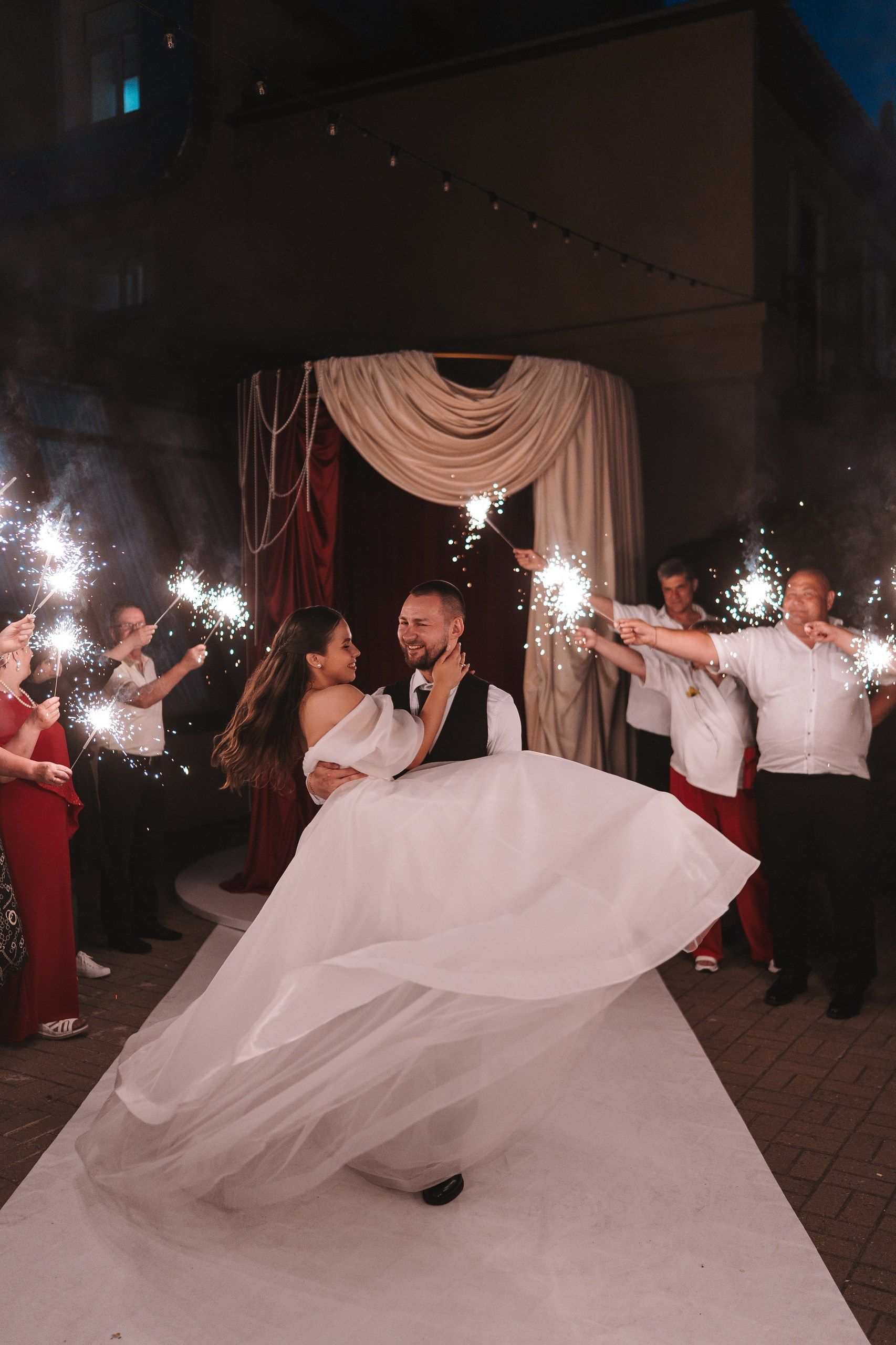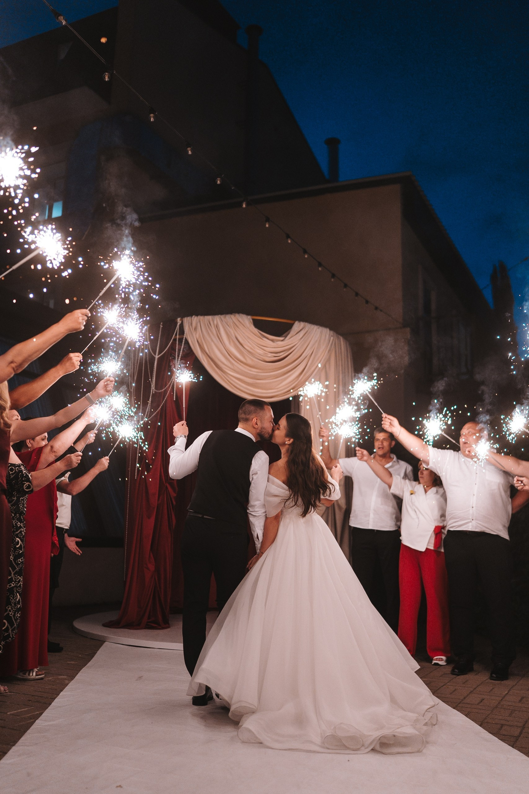 Финал вечера — торт, бенгальские огни, бросание букета, подвязка и семейный очаг. Классические свадебные традиции, но без перегруза — всё на эмоциях и в правильном темпе.