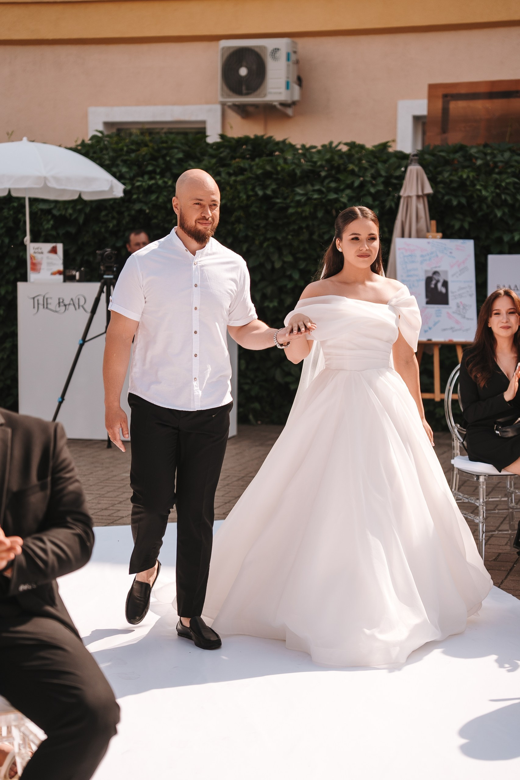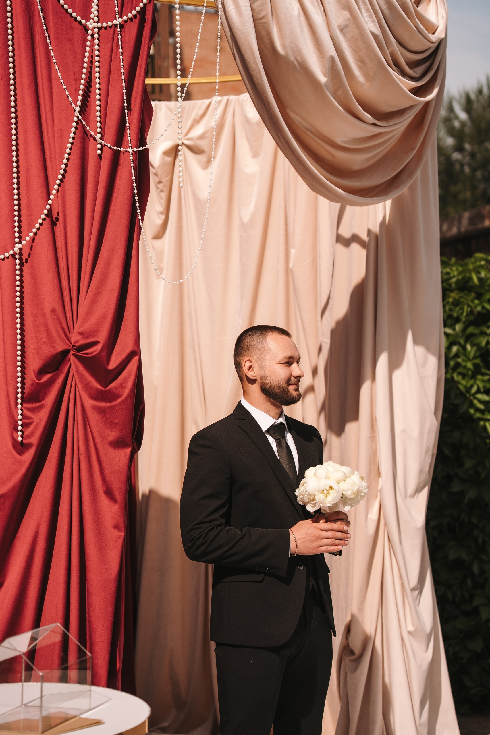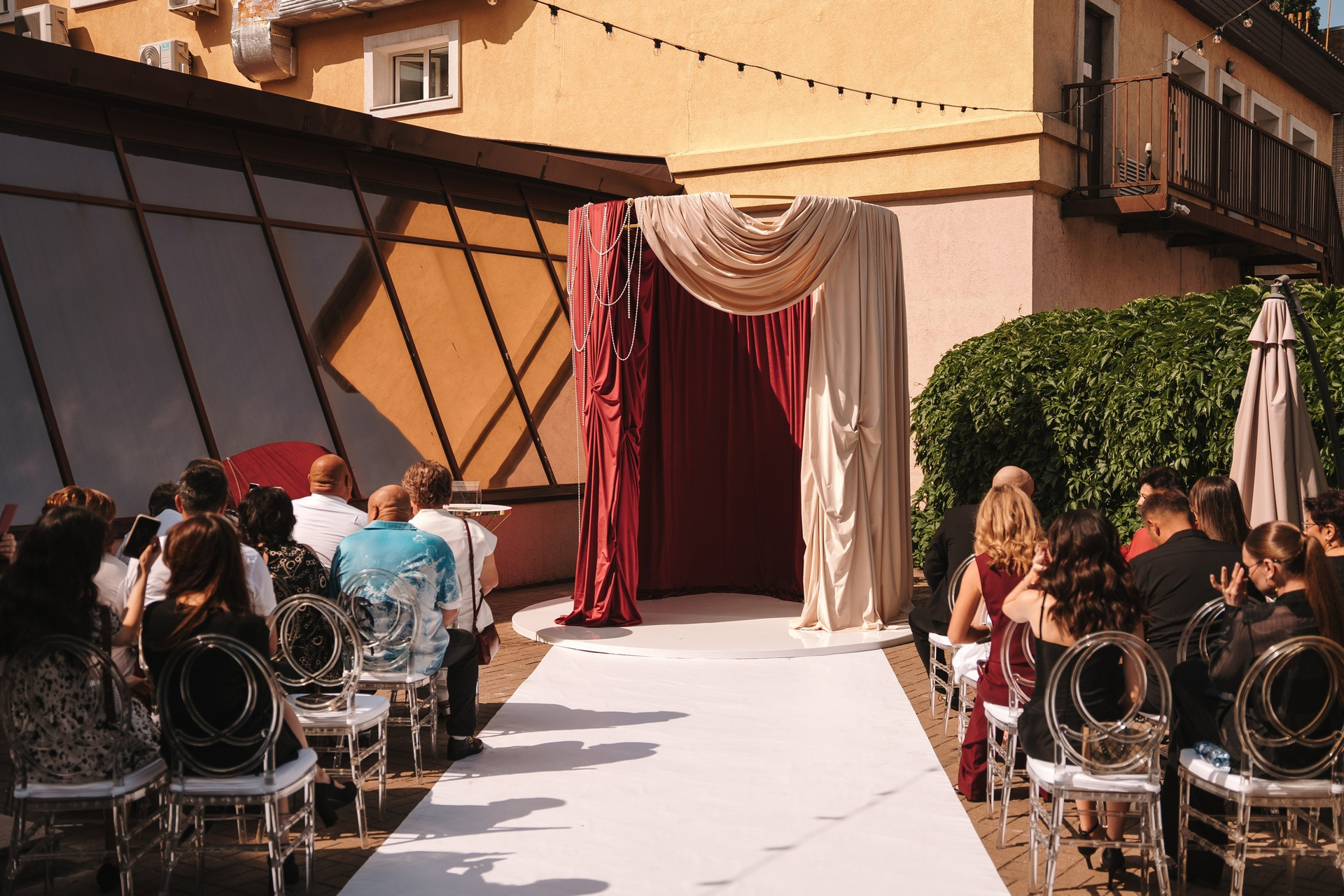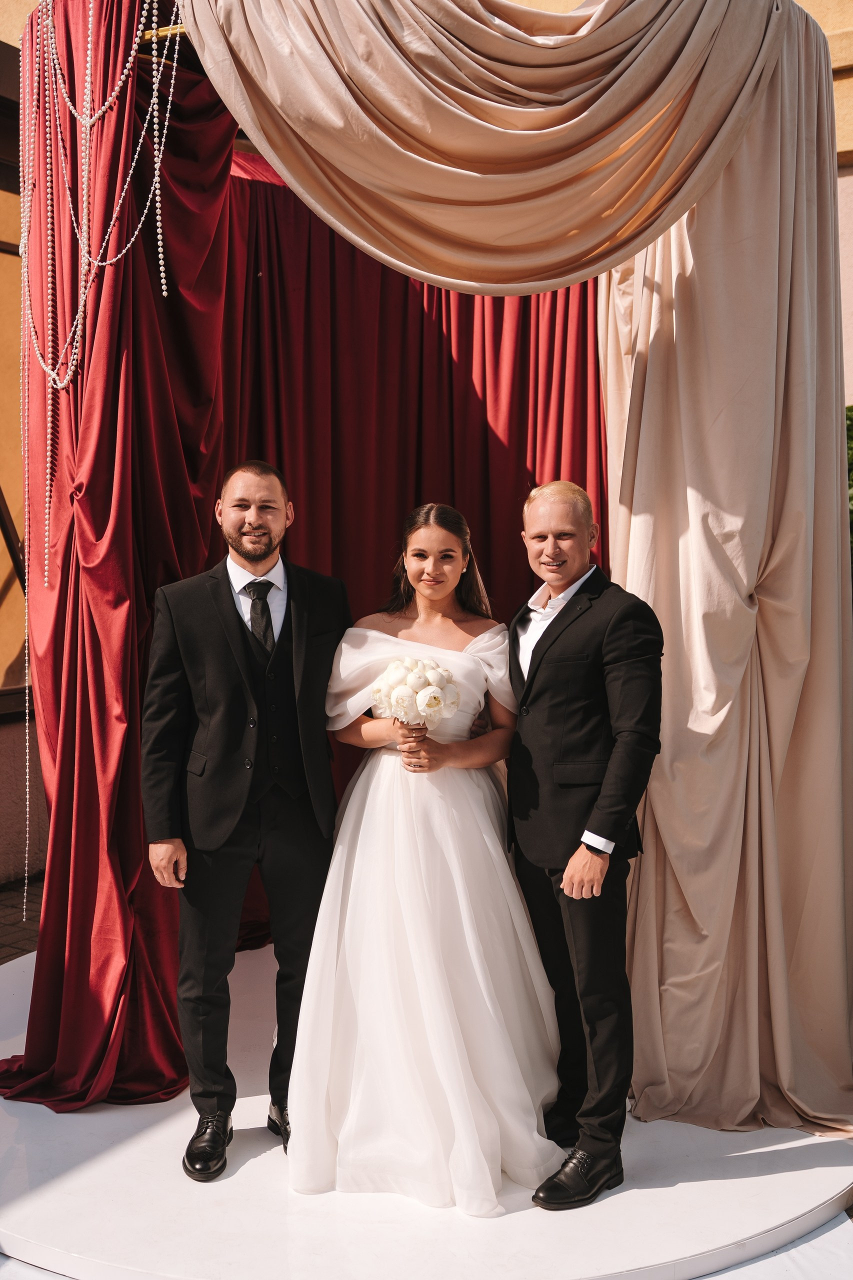 Выездная регистрация проходила на заднем дворе гостиницы — уютно, зелено, с красивым декором. Несмотря на сильную жару, всё прошло очень кайфово: был даже выездной бар с барменом, который готовил коктейли для гостей. Регистрация получилась лёгкой, тёплой и максимально живой.