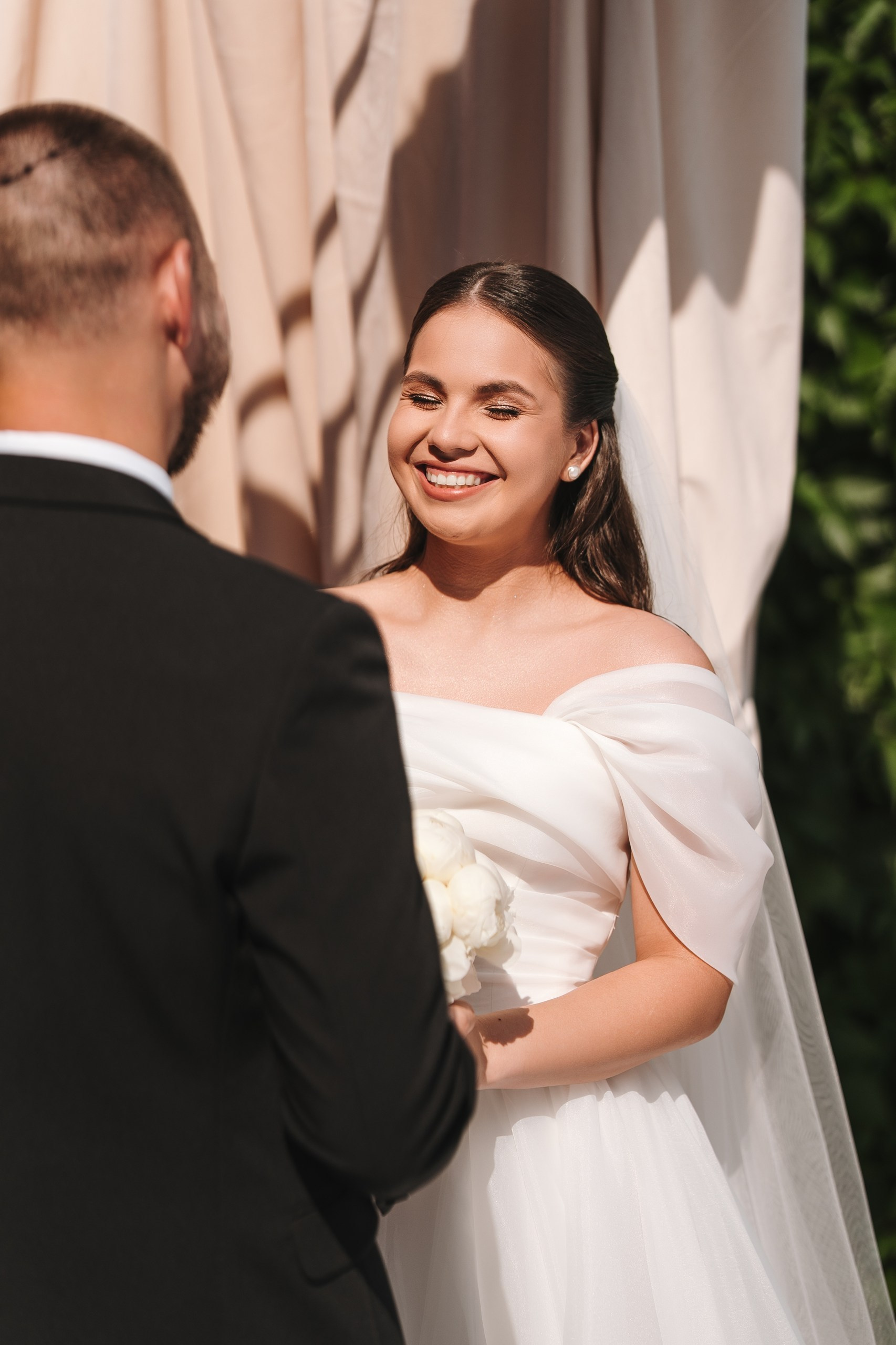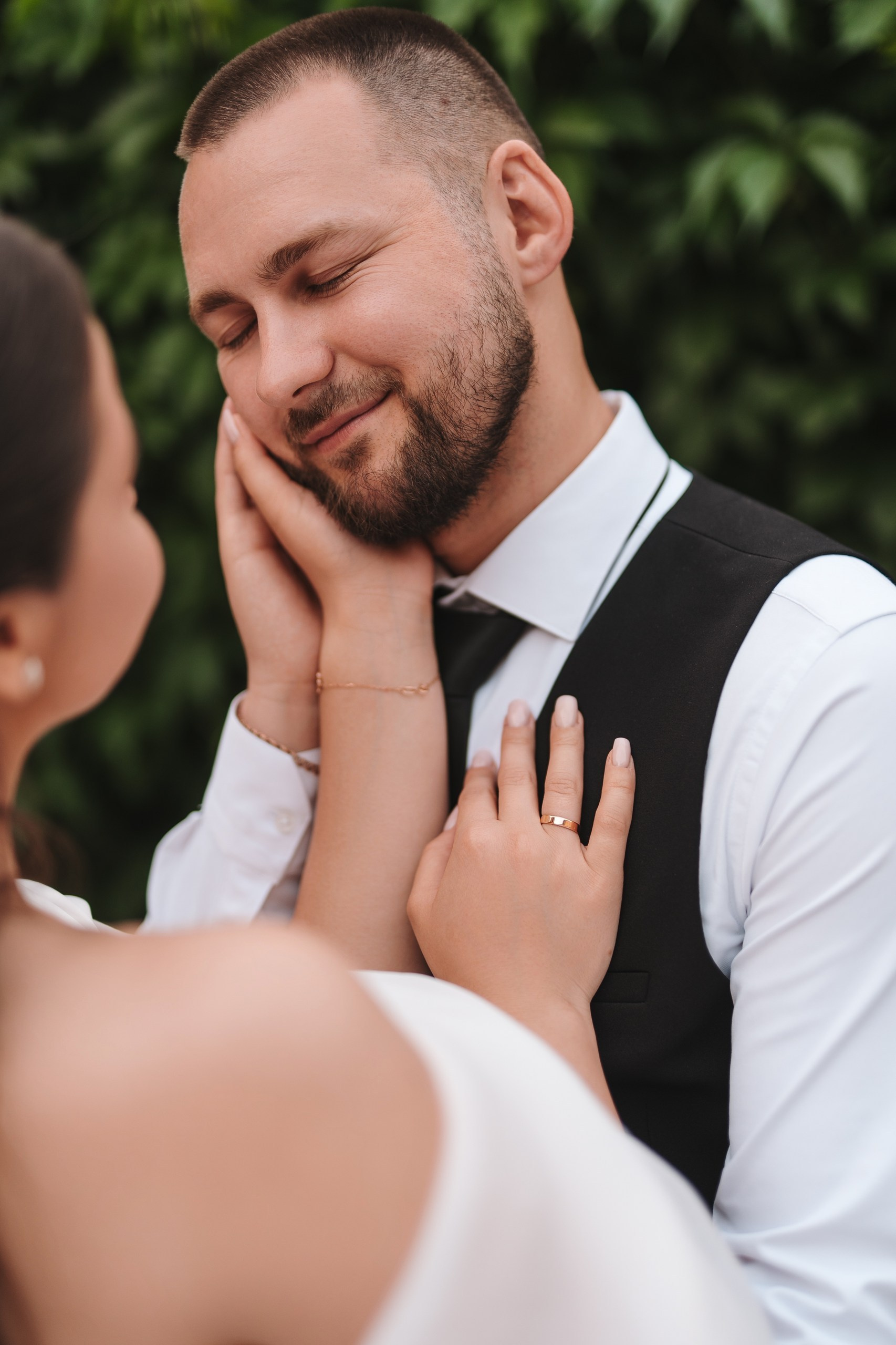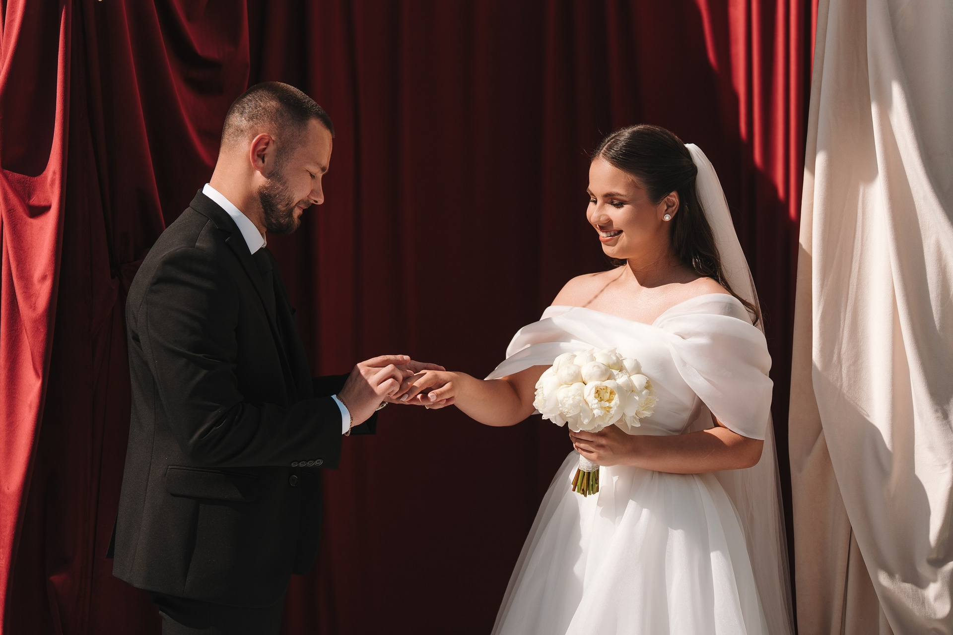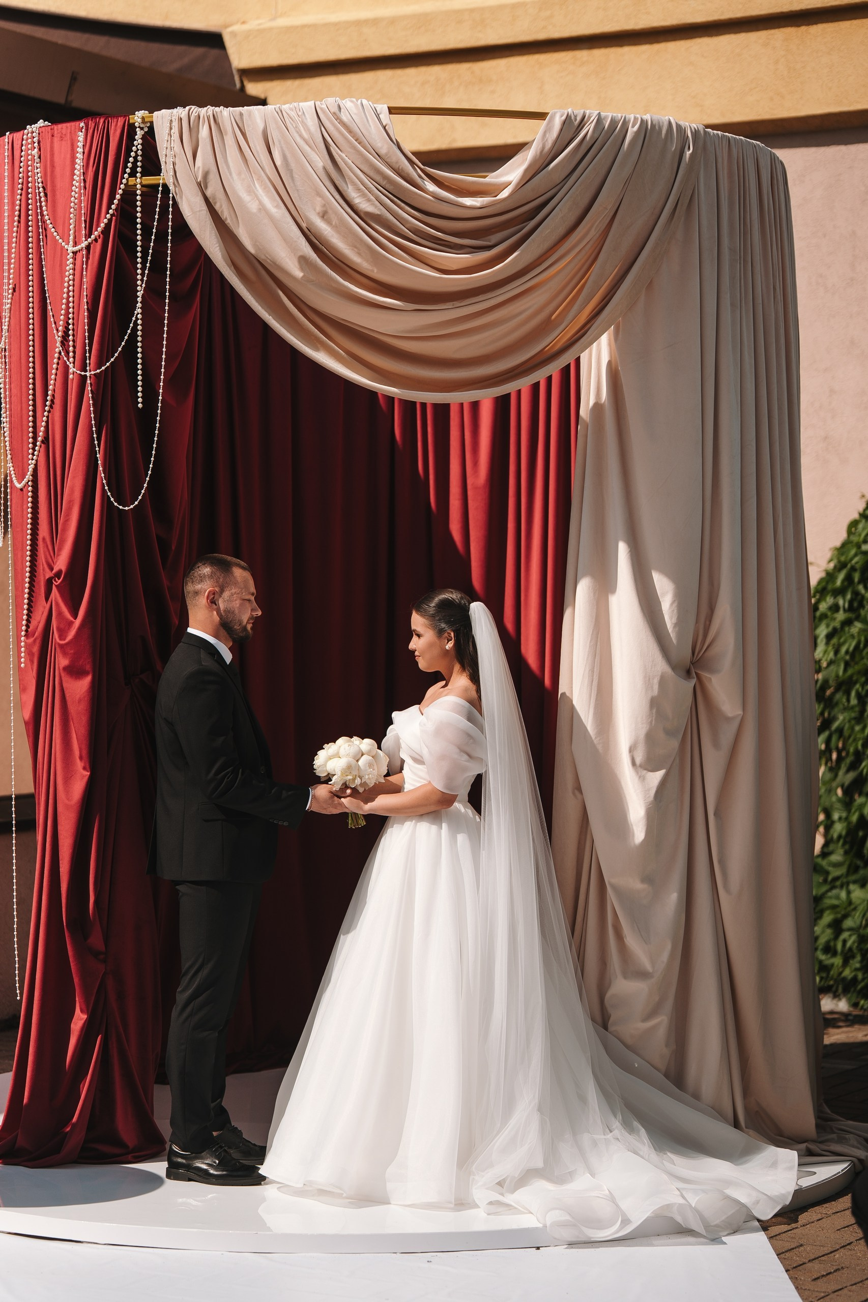Выездная регистрация проходила на заднем дворе гостиницы — уютно, зелено, с красивым декором. Несмотря на сильную жару, всё прошло очень кайфово: был даже выездной бар с барменом, который готовил коктейли для гостей. Регистрация получилась лёгкой, тёплой и максимально живой.
