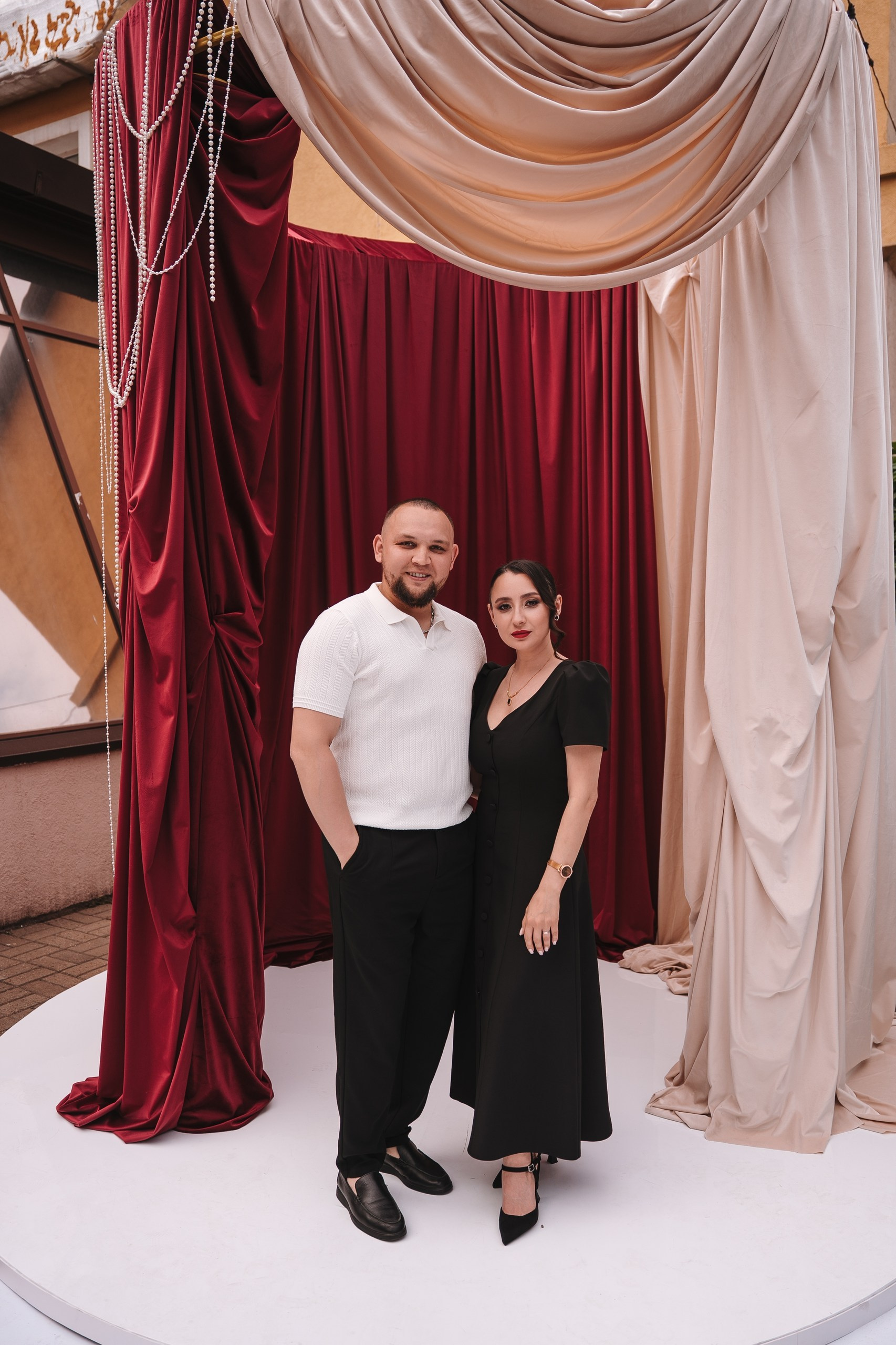 Когда жара немного спала, мы с Владиславом и Элиной вышли на улицу и сделали ещё несколько фотографий на фоне зоны выездной регистрации — уже в мягком вечернем свете. Это был отличный момент выдохнуть и спокойно побыть вдвоём.