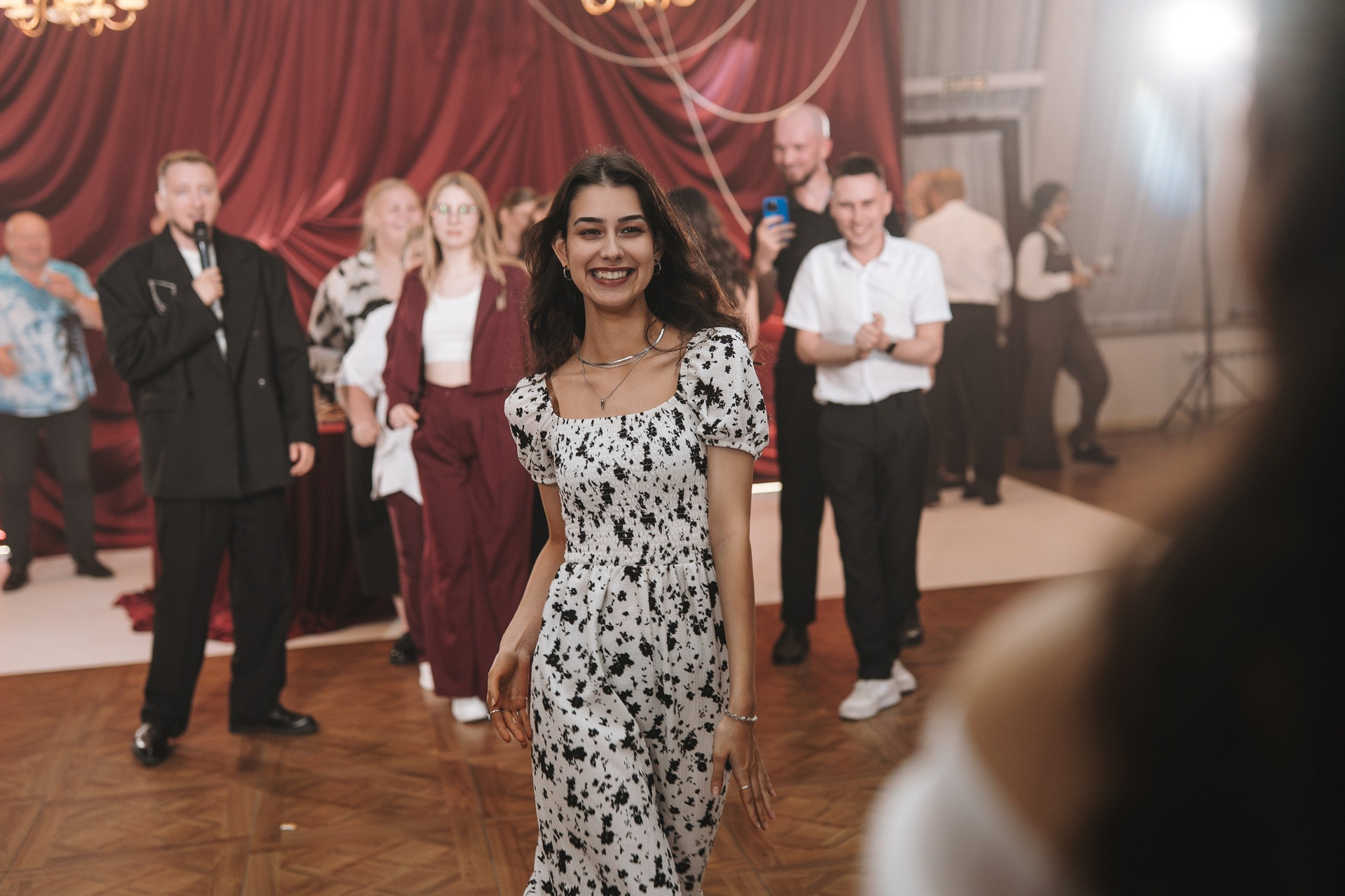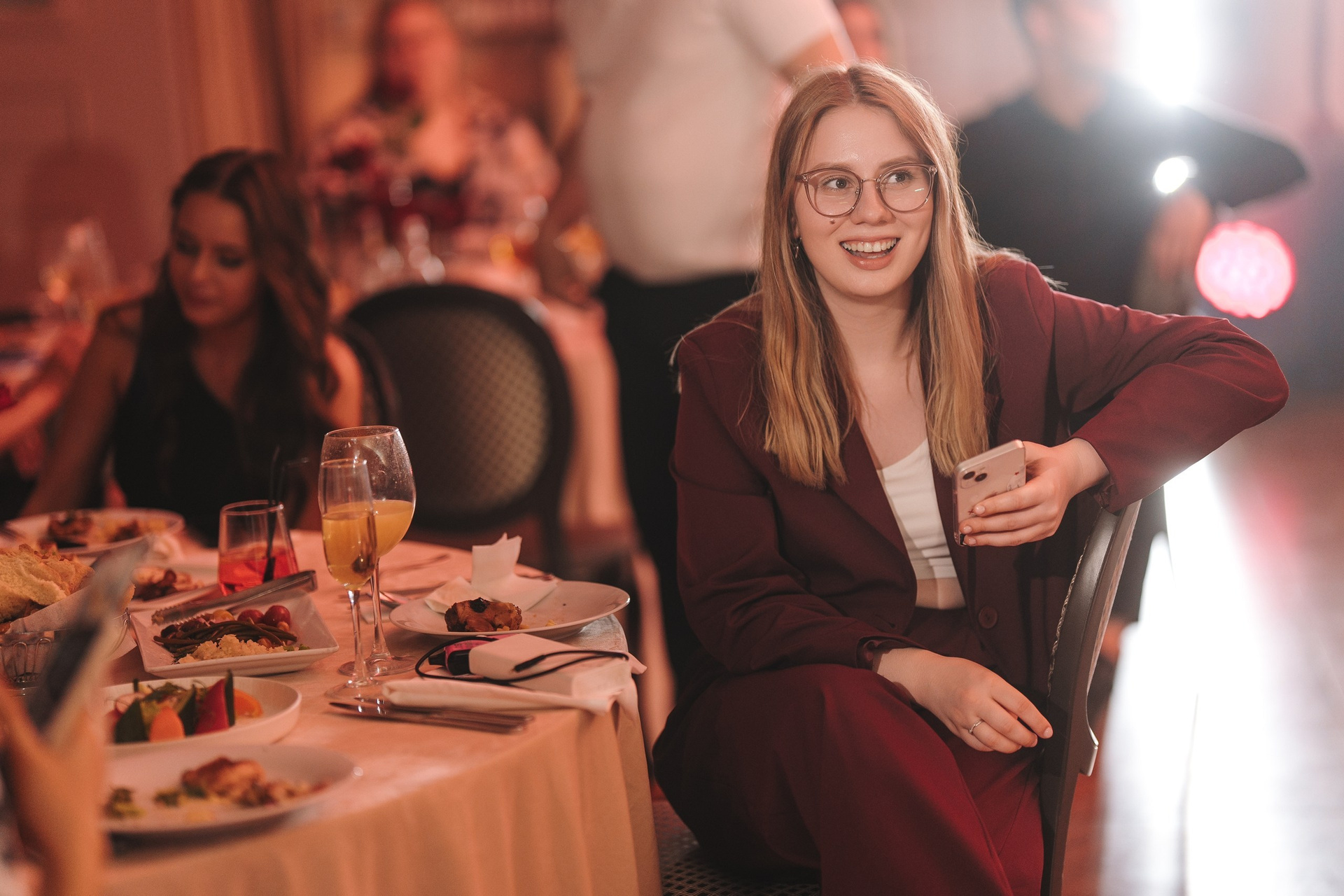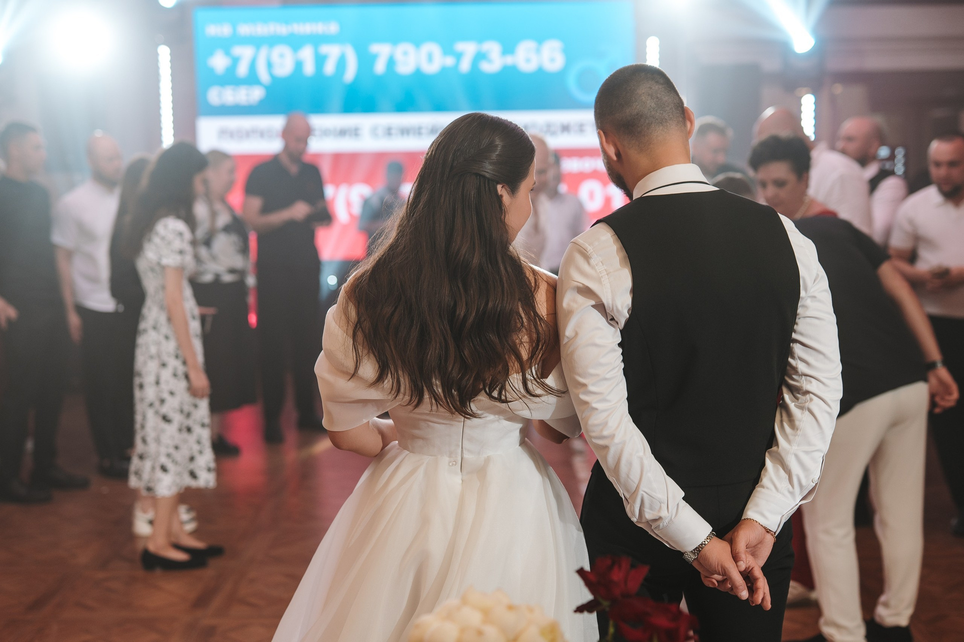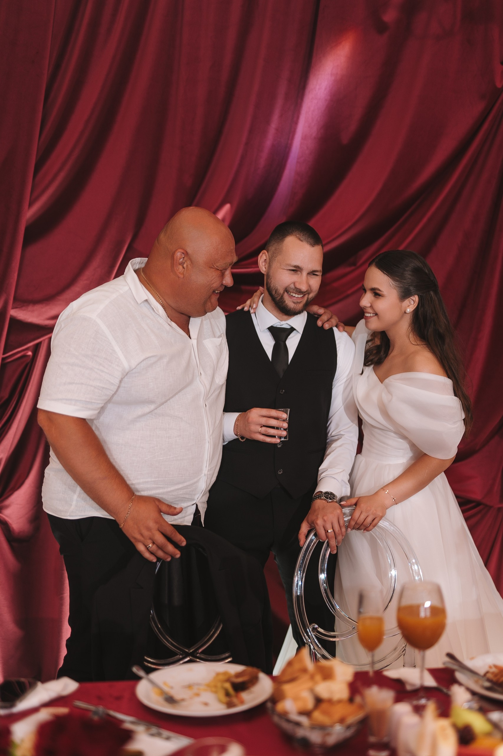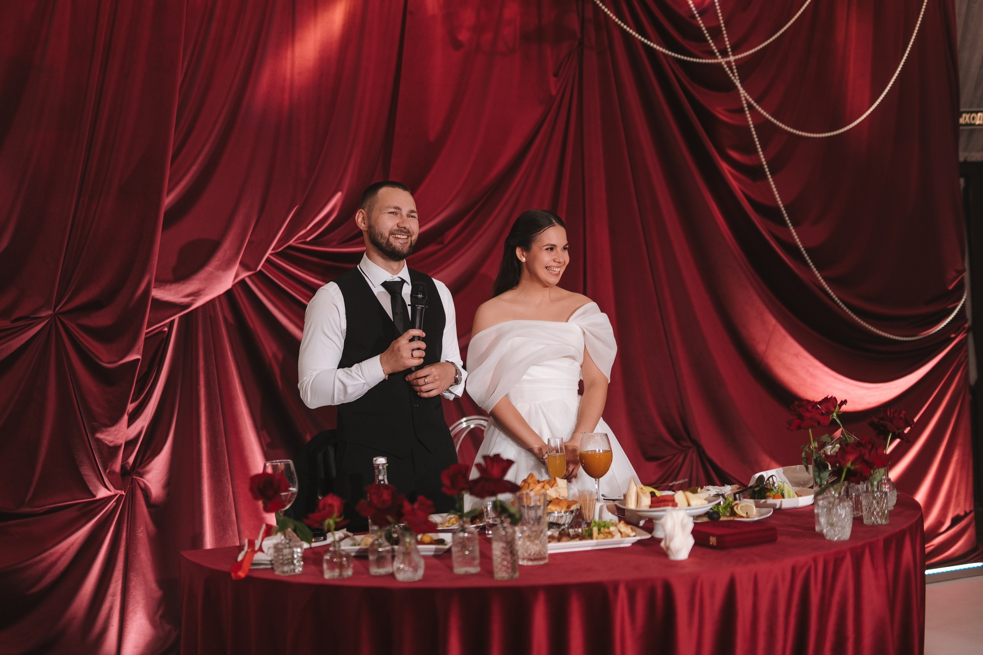 После церемонии мы поснимались с гостями и переместились в зал. Банкетный зал выглядел шикарно: тканевый бордовый декор, профессиональный свет, звук и экран от Korkesh — уровень сразу чувствовался. Вёл вечер Артём Ямбаев, всё шло динамично: тосты, традиции, конкурсы, танцы и постоянная движуха. За видео отвечал Салават Байдавлетов, он же Xroke Prod.