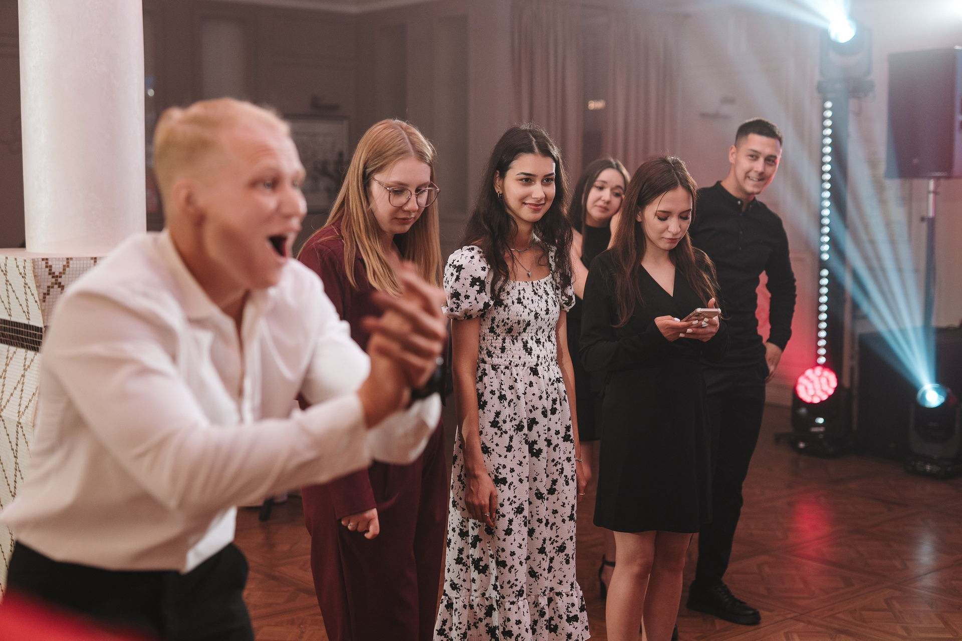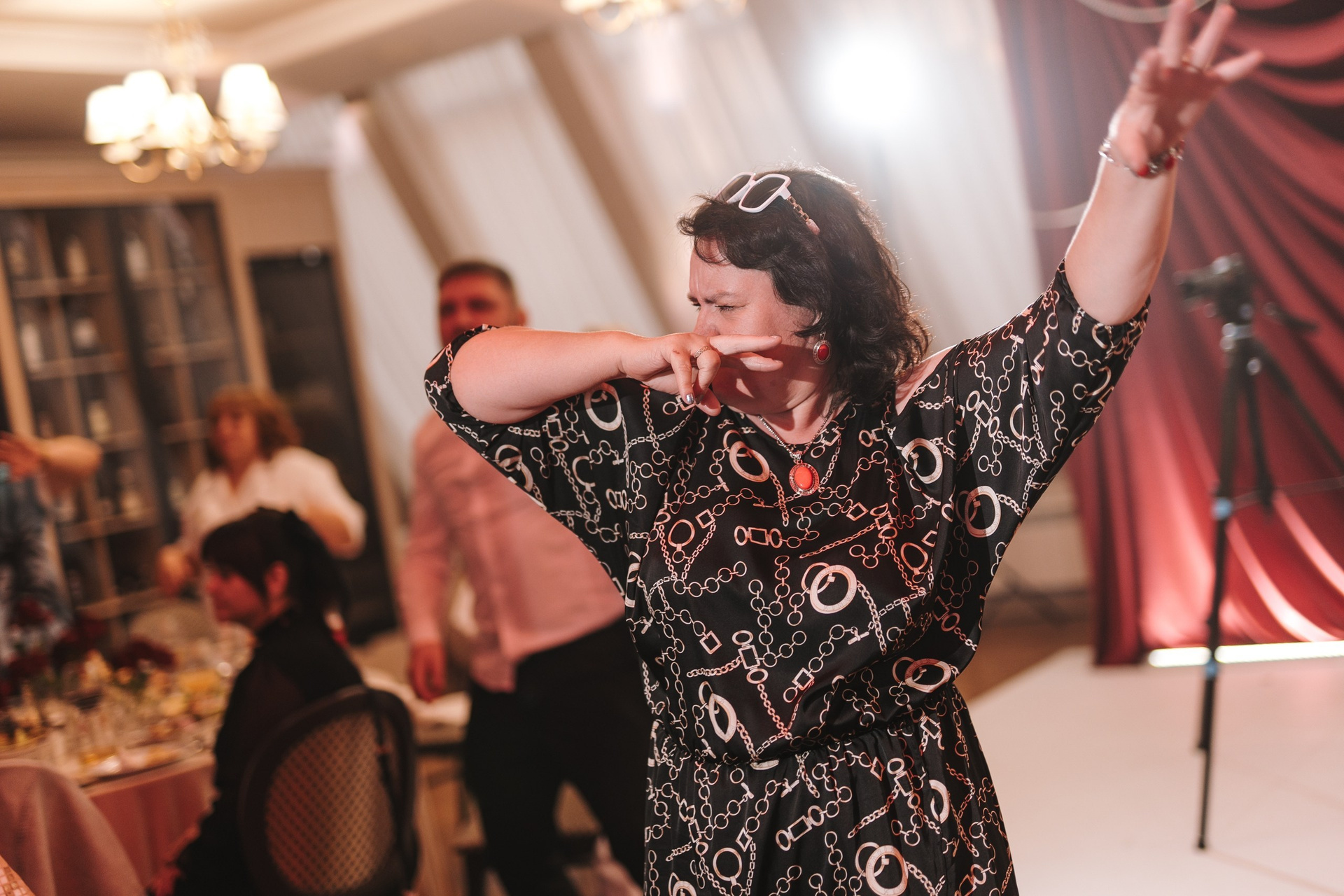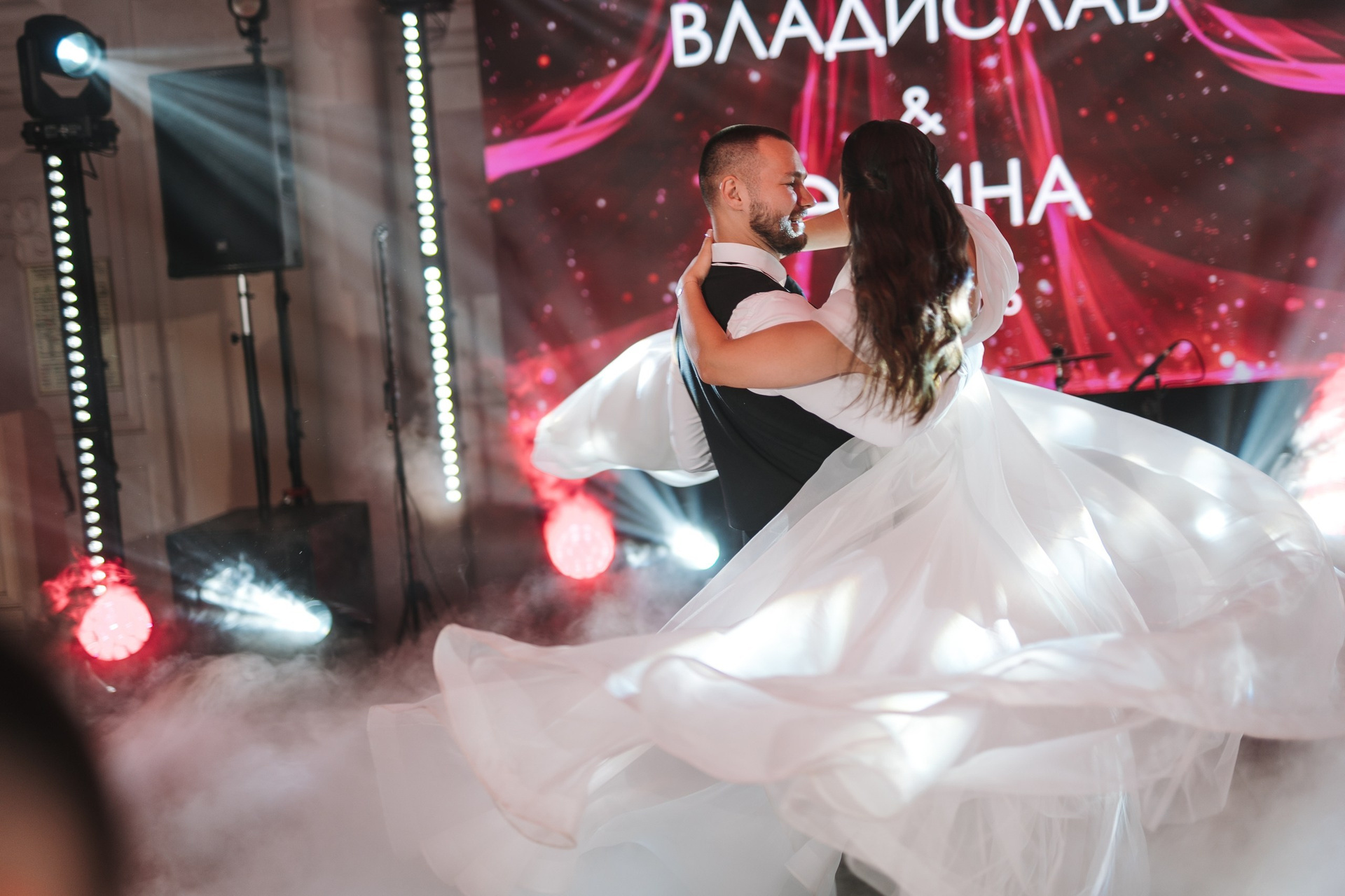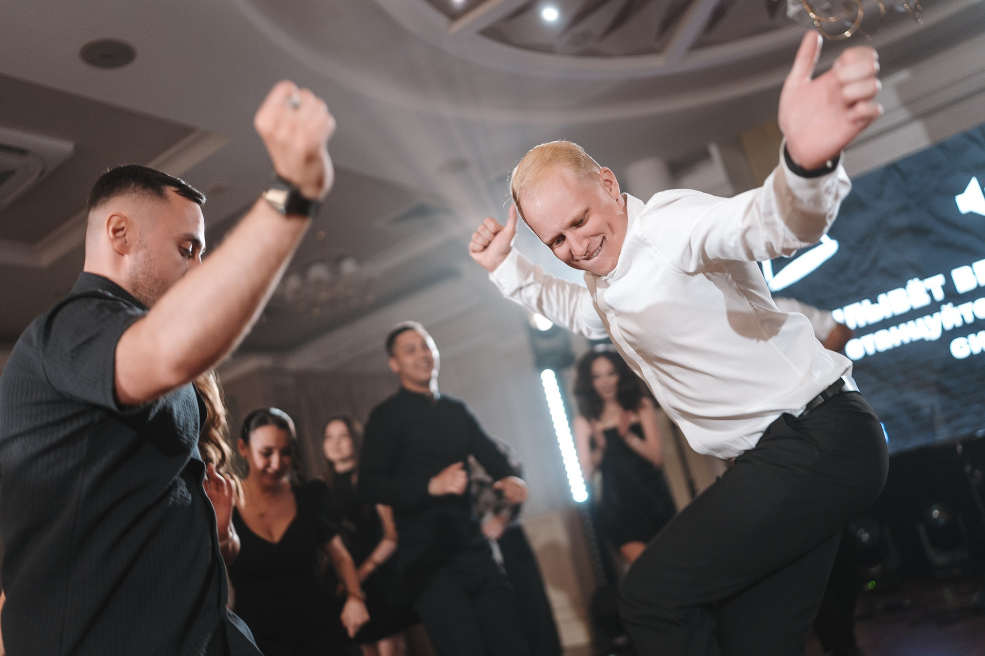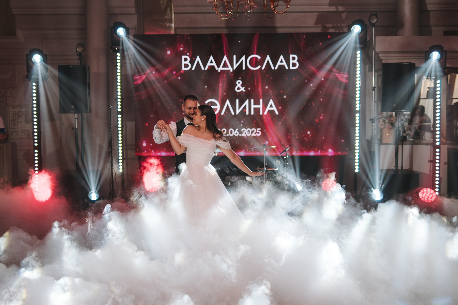 После церемонии мы поснимались с гостями и переместились в зал. Банкетный зал выглядел шикарно: тканевый бордовый декор, профессиональный свет, звук и экран от Korkesh — уровень сразу чувствовался. Вёл вечер Артём Ямбаев, всё шло динамично: тосты, традиции, конкурсы, танцы и постоянная движуха. За видео отвечал Салават Байдавлетов, он же Xroke Prod.