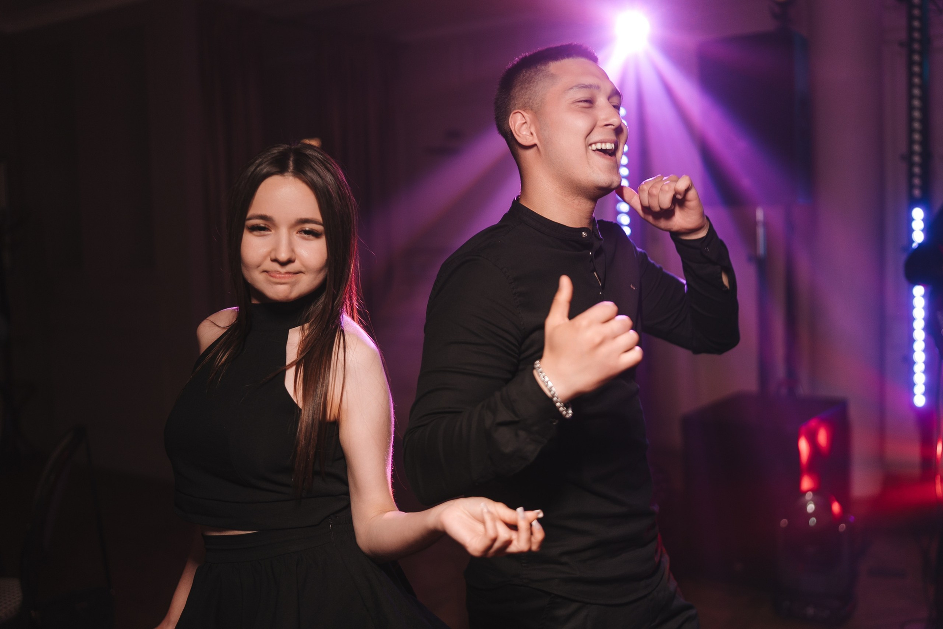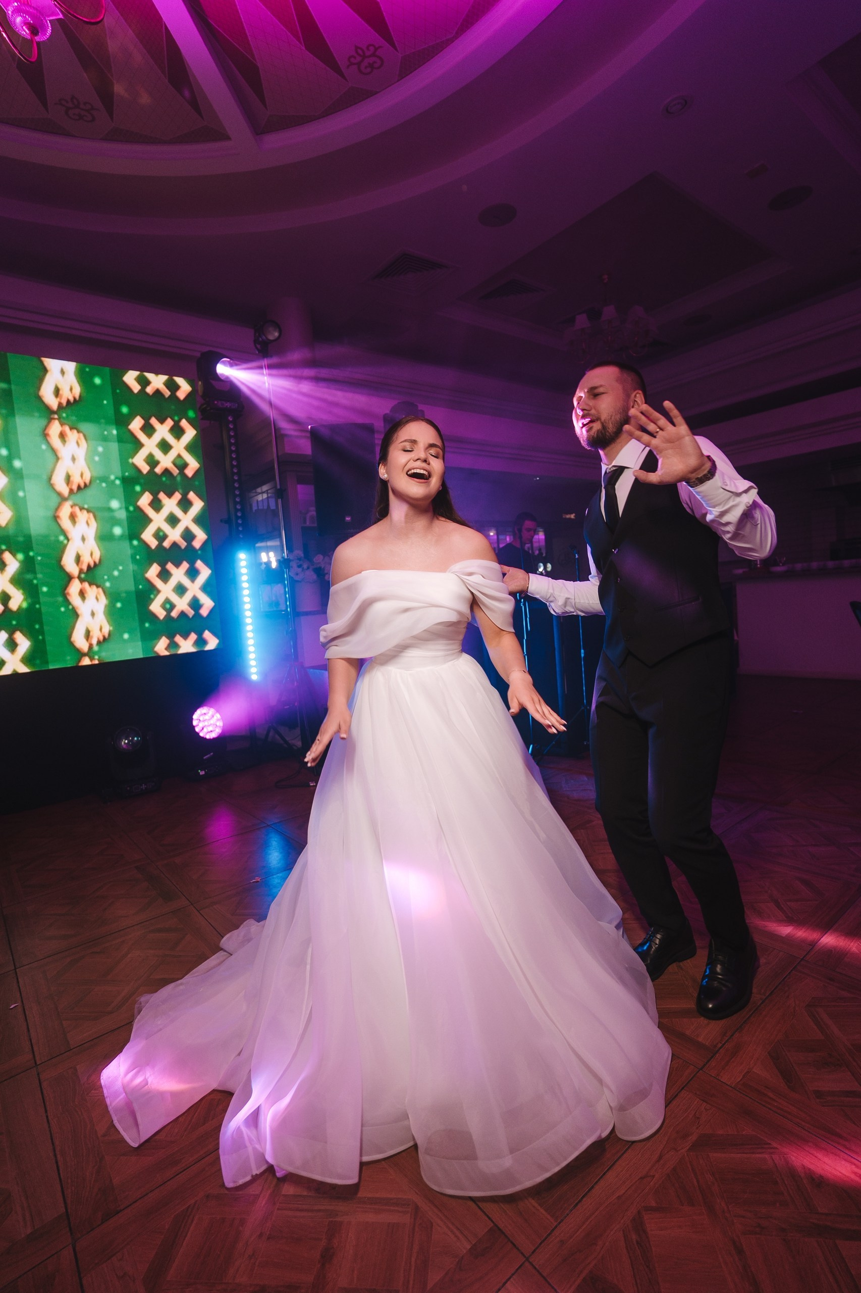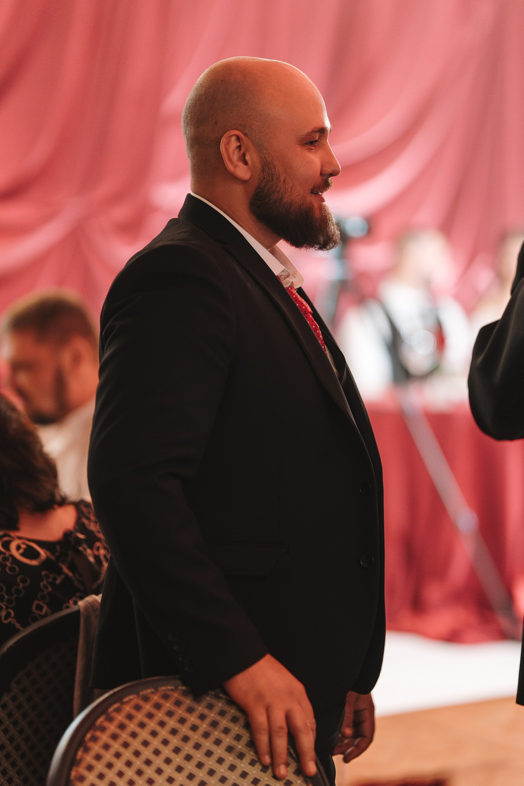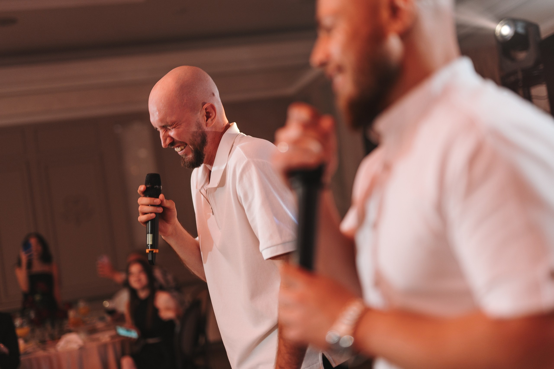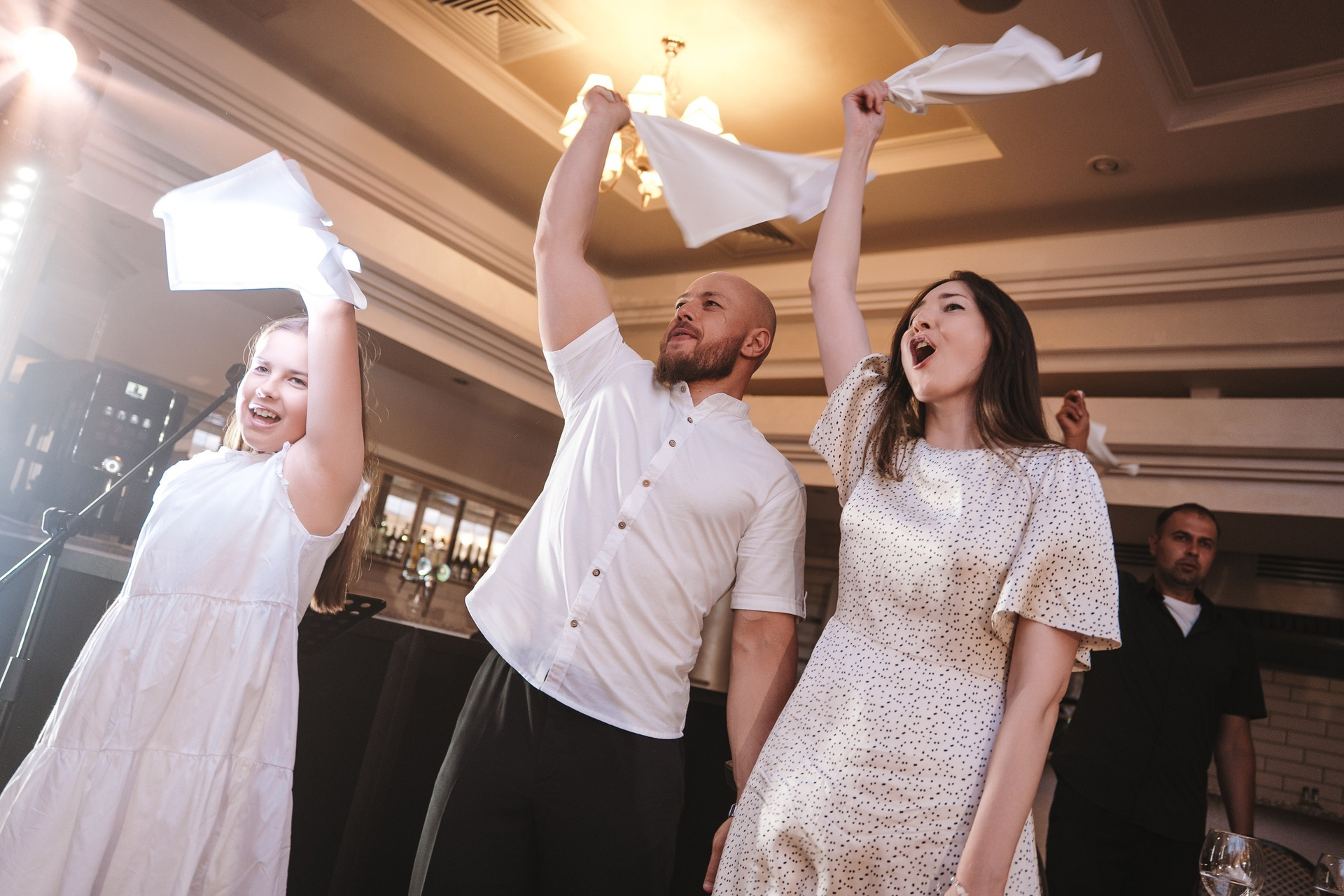 После церемонии мы поснимались с гостями и переместились в зал. Банкетный зал выглядел шикарно: тканевый бордовый декор, профессиональный свет, звук и экран от Korkesh — уровень сразу чувствовался. Вёл вечер Артём Ямбаев, всё шло динамично: тосты, традиции, конкурсы, танцы и постоянная движуха. За видео отвечал Салават Байдавлетов, он же Xroke Prod.
