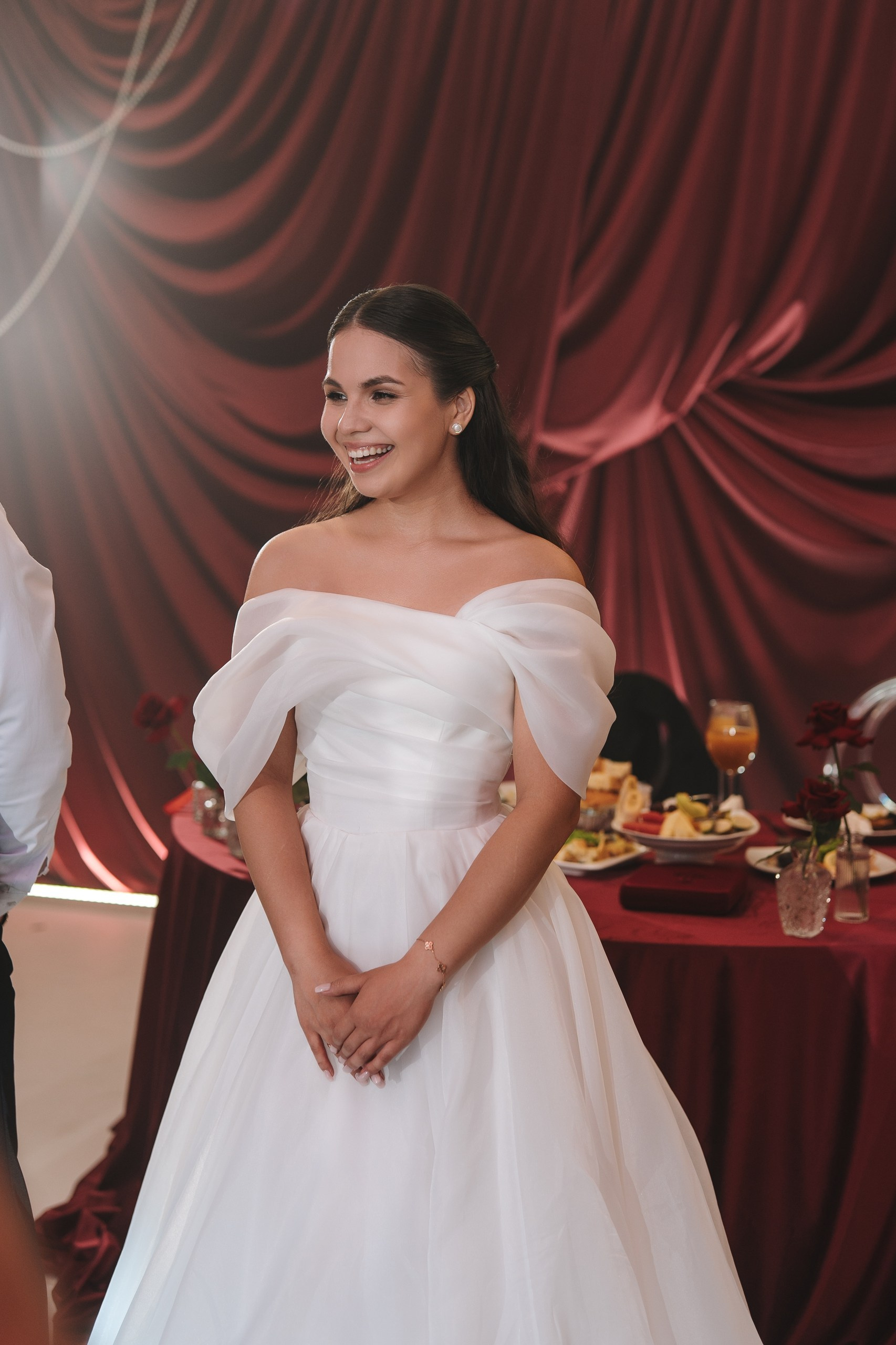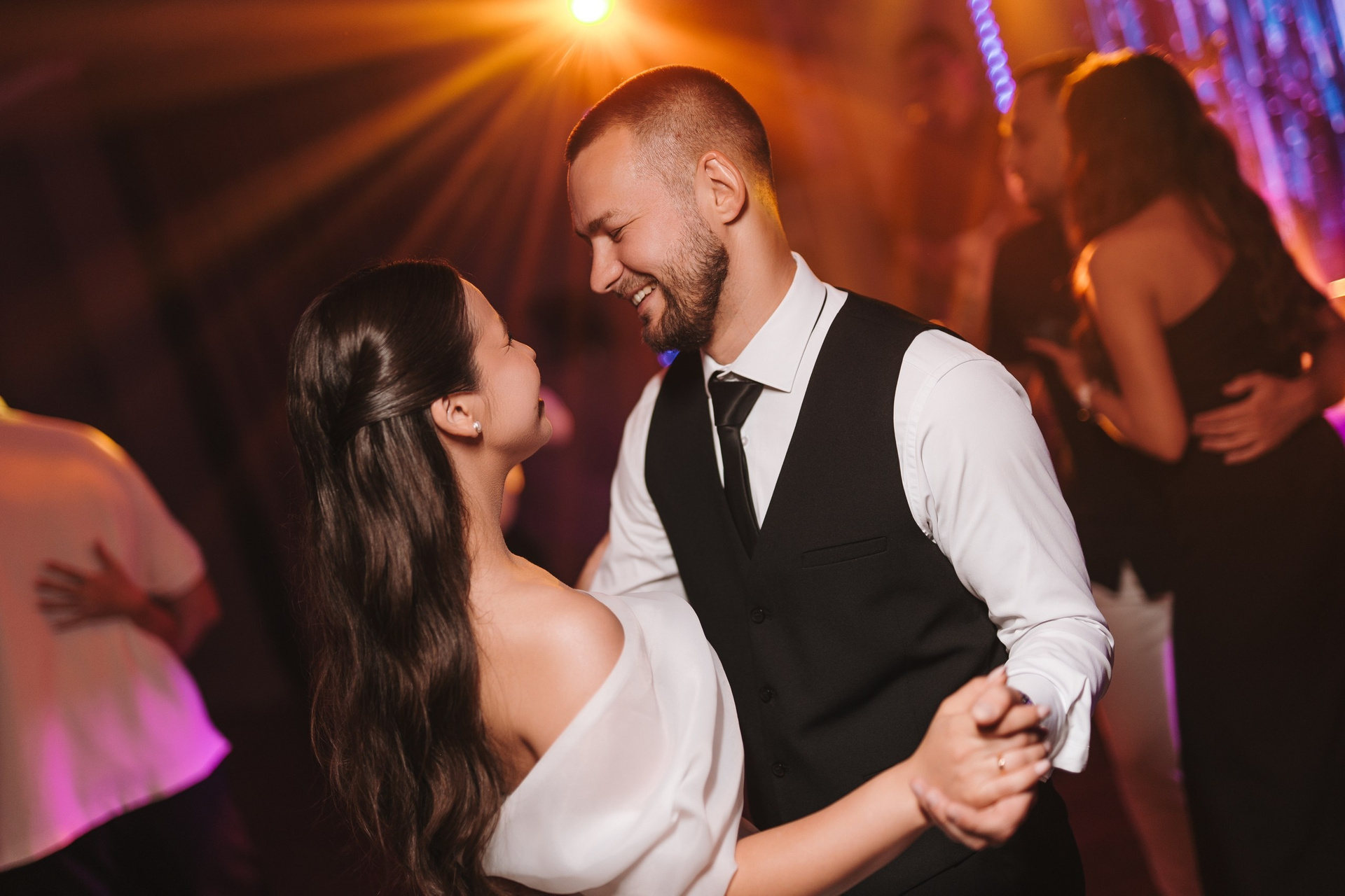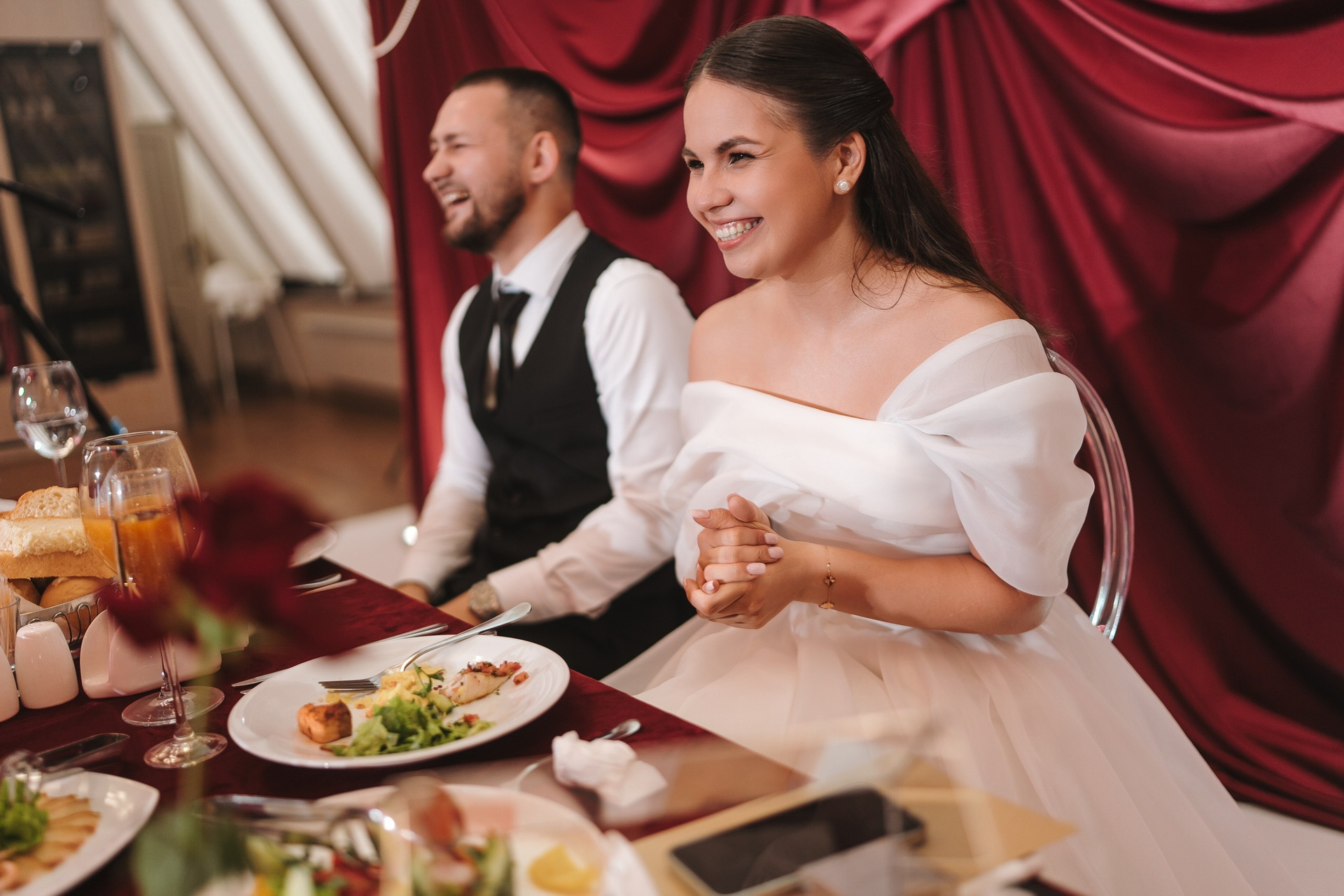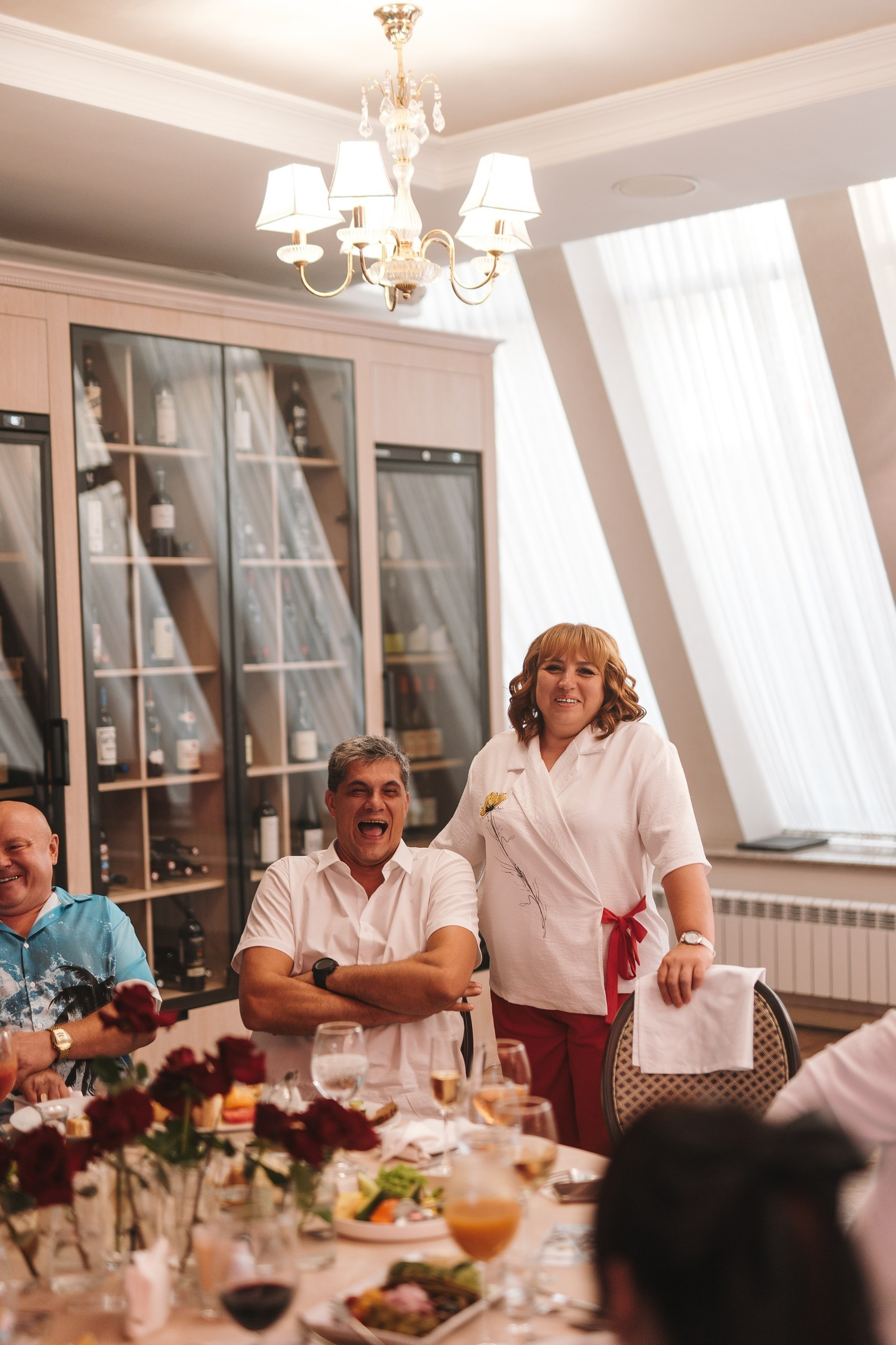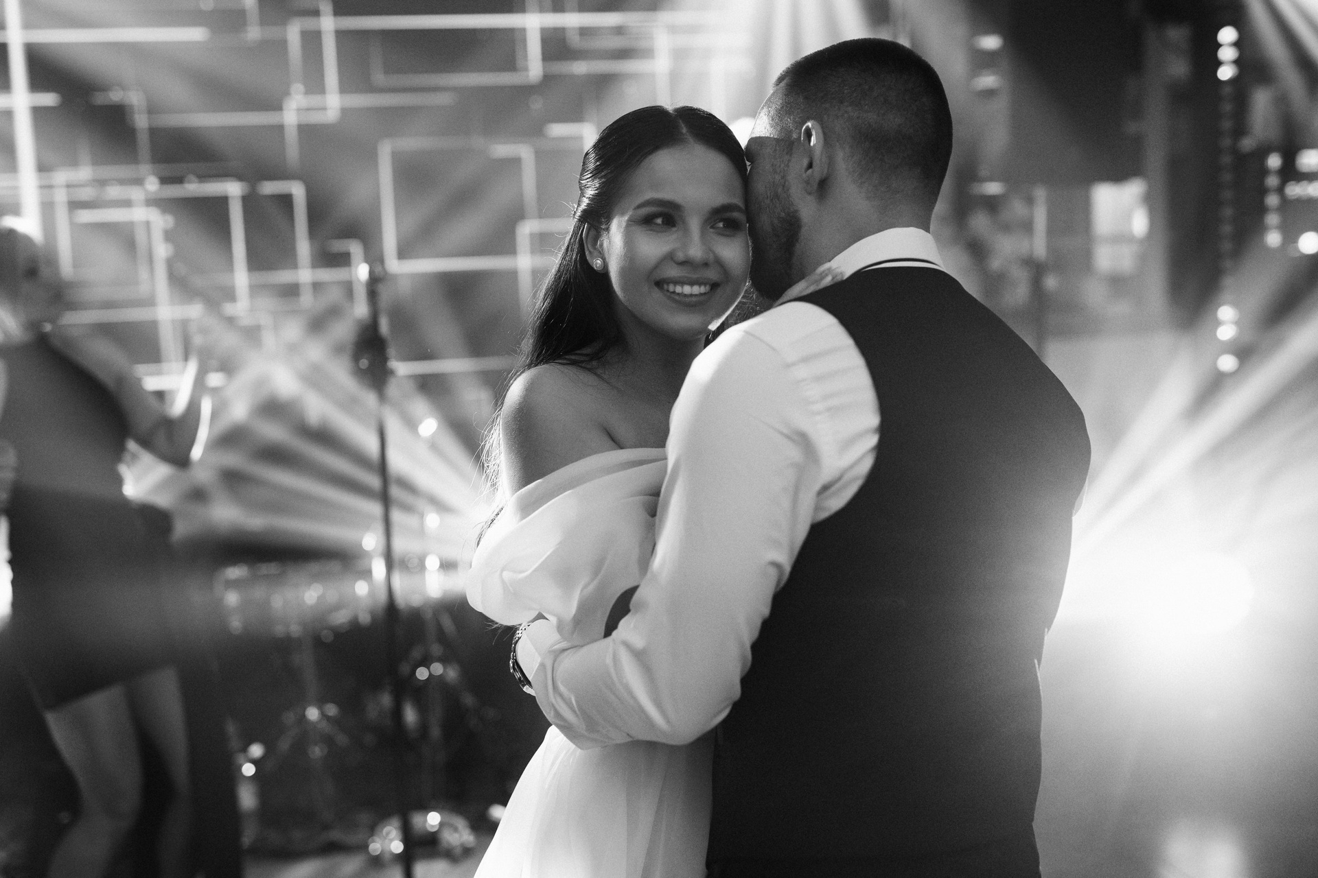 После церемонии мы поснимались с гостями и переместились в зал. Банкетный зал выглядел шикарно: тканевый бордовый декор, профессиональный свет, звук и экран от Korkesh — уровень сразу чувствовался. Вёл вечер Артём Ямбаев, всё шло динамично: тосты, традиции, конкурсы, танцы и постоянная движуха. За видео отвечал Салават Байдавлетов, он же Xroke Prod.