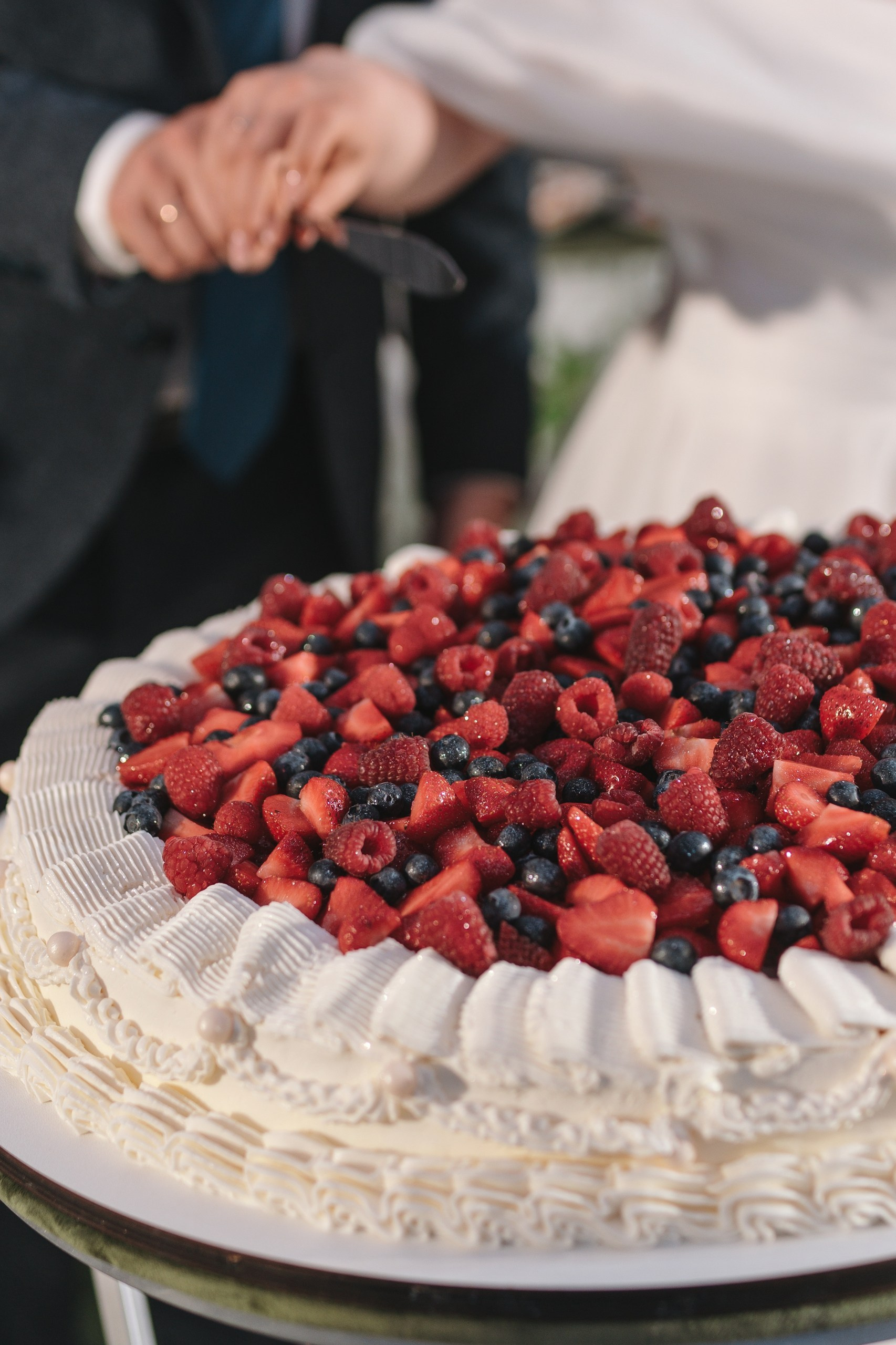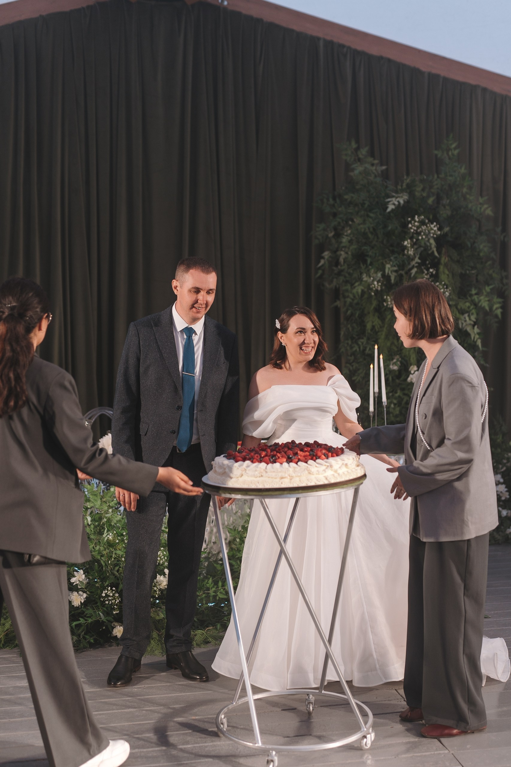 На закате мы снова вышли к зоне регистрации — свет был просто идеальный. Спокойные кадры вдвоём, фотографии с гостями, и обратно в зал. Финалом стал большой белый торт, украшенный ягодами — черника, ежевика, клубника, малина. Очень красиво и свежо, причём ребята украшали его сами. Потом были ответные слова, бенгальские огни, и под конец Андрей Огнев спел «Сансару». Очень тёплое и эмоциональное завершение дня.