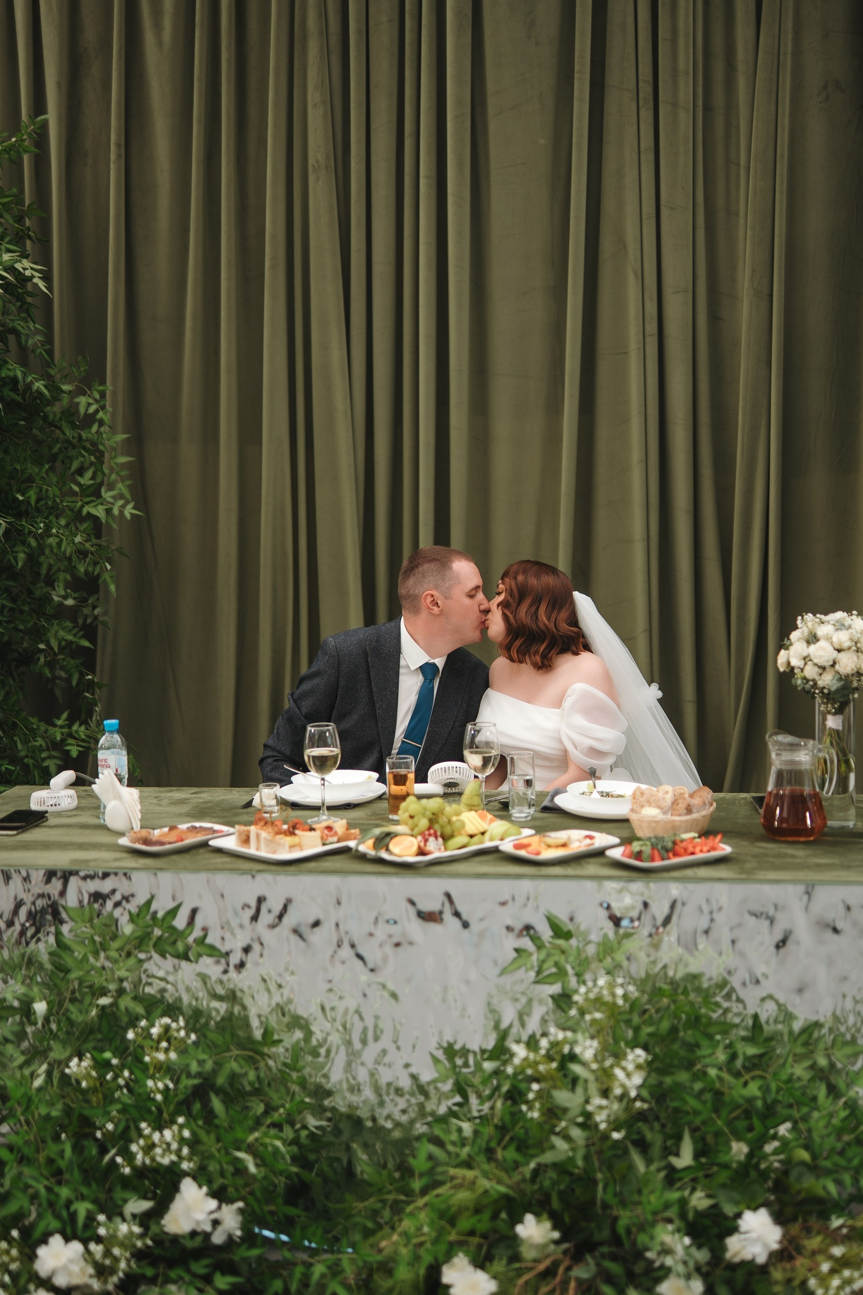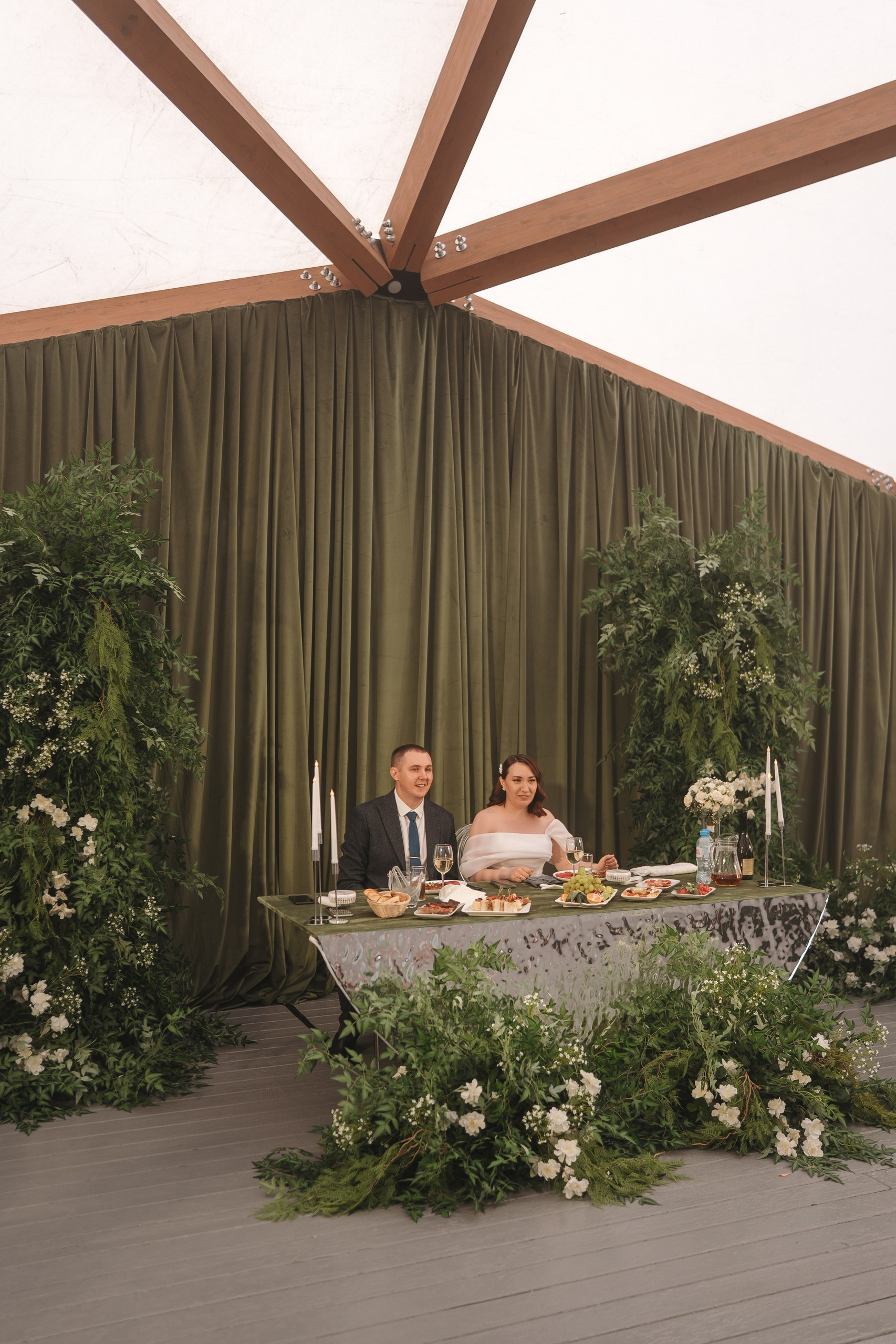 Дальше мы поехали в Хотим Едим. Большой шатёр, природа, зелень вокруг — сразу ощущение праздника и простора. До приезда гостей мы успели сделать небольшую фотосессию, а потом отправили ребят отдохнуть. Было действительно жарко, а жених — в плотном костюме, поэтому никаких подвигов: комфорт важнее всего. Позже я спокойно поснимал их у шатра, в лесу, у озера, сделал кадры у зоны выездной регистрации и немного — в зале у президиума.