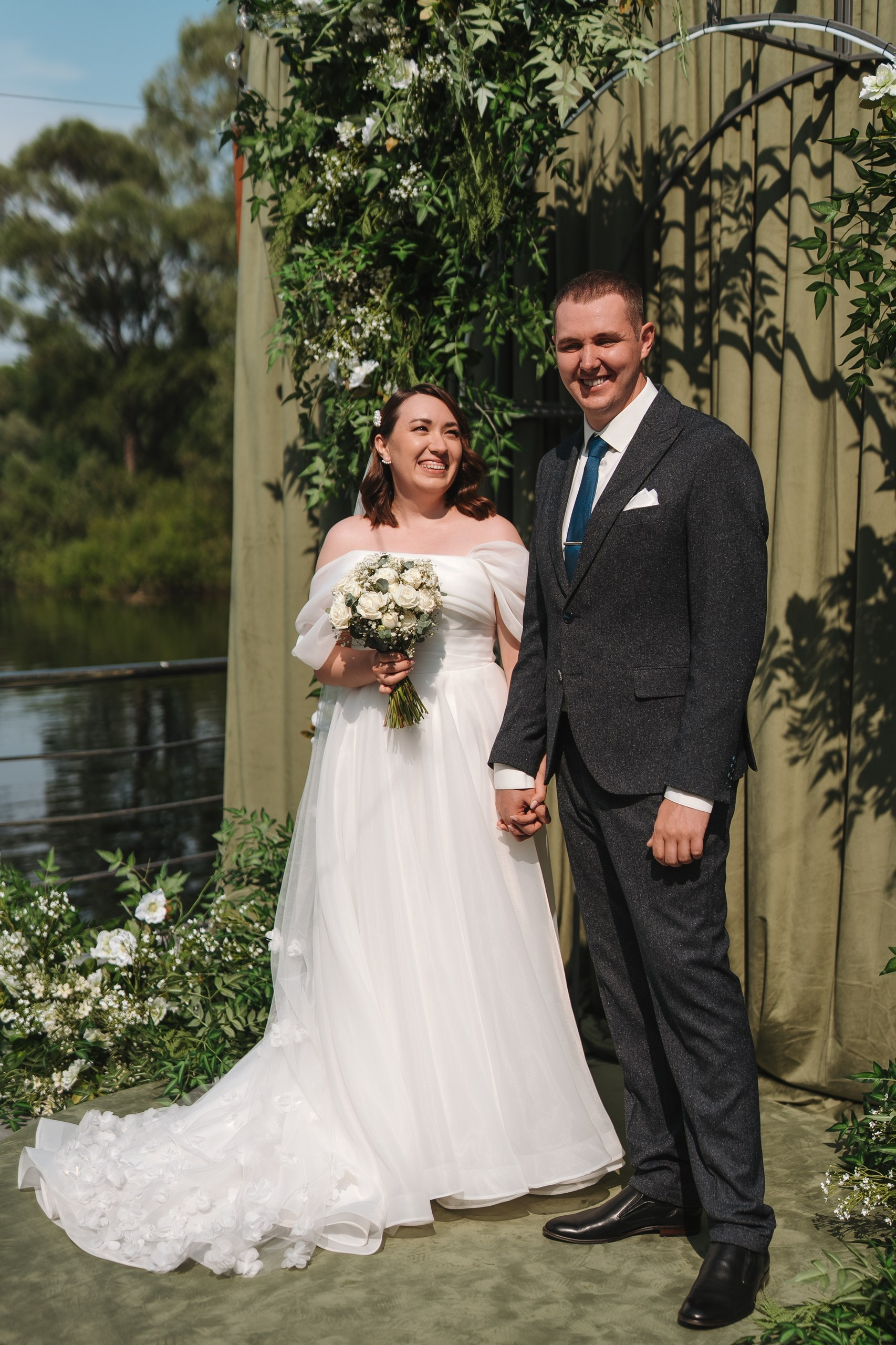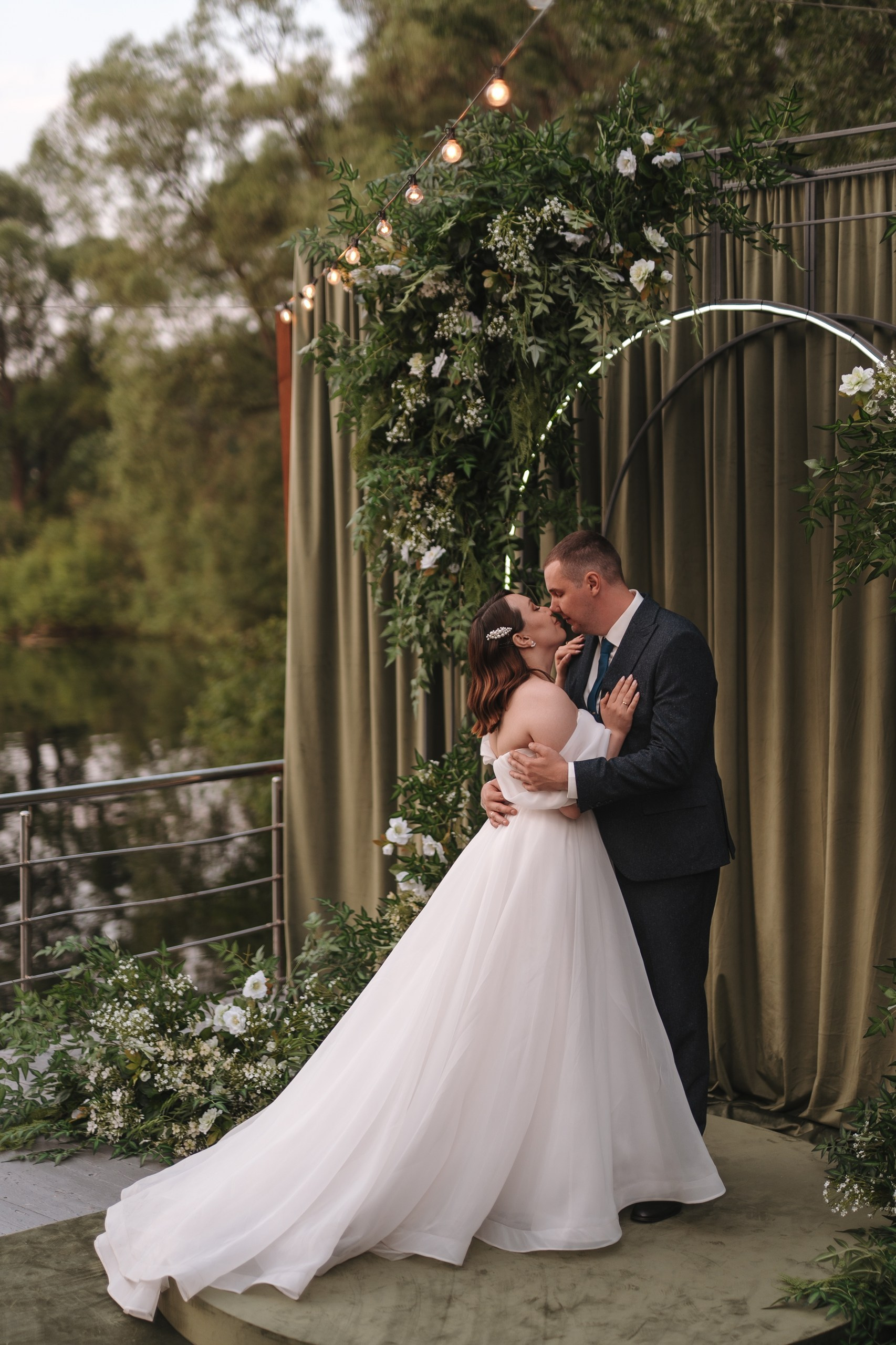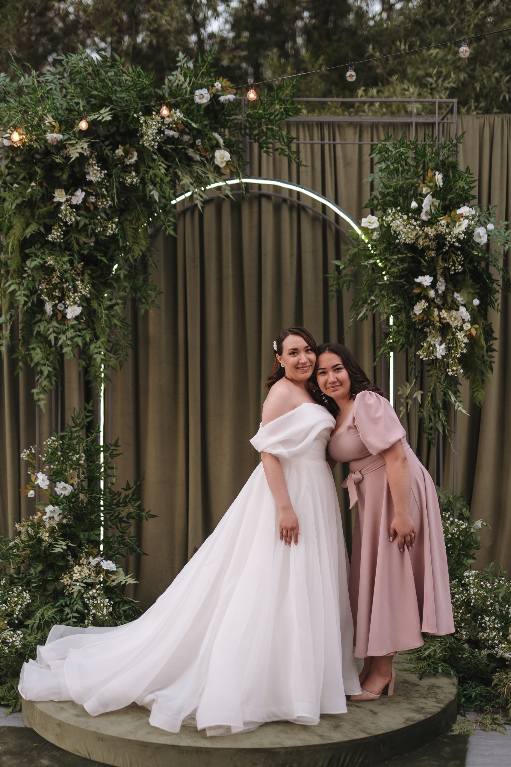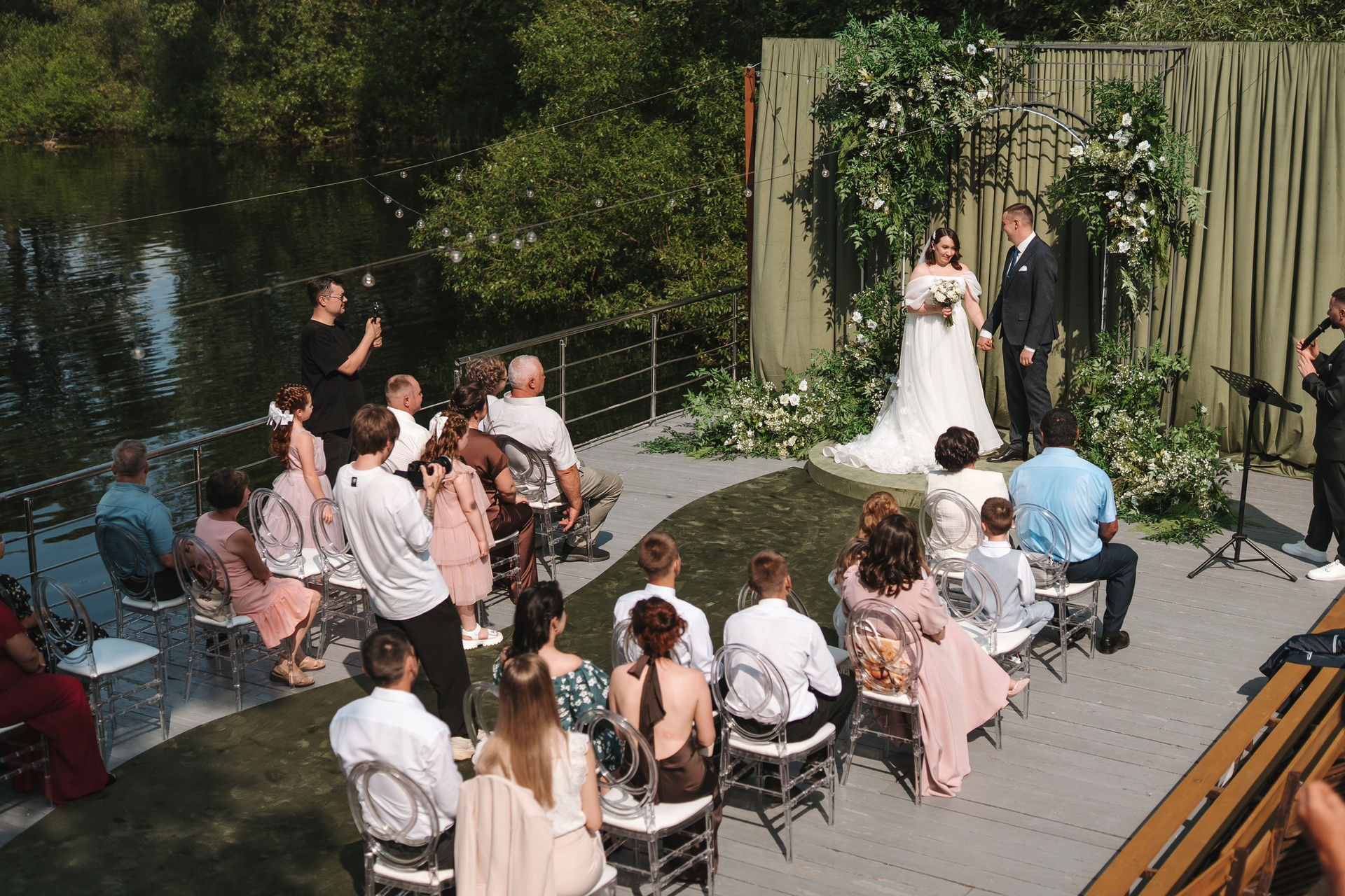 Выездная церемония получилась очень трогательной. Всё было готово: декор, стулья, звук. Первым вышел жених, затем невеста — дальше обмен кольцами, аплодисменты и фотографии с гостями. Был момент с солнцем — оно светило прямо в лица, было жарко, но перенести регистрацию было невозможно из-за декора. Мы всё сделали спокойно и быстро, сохранив главное — эмоции этого момента.