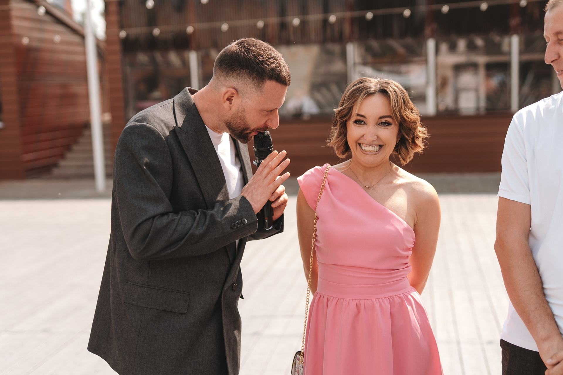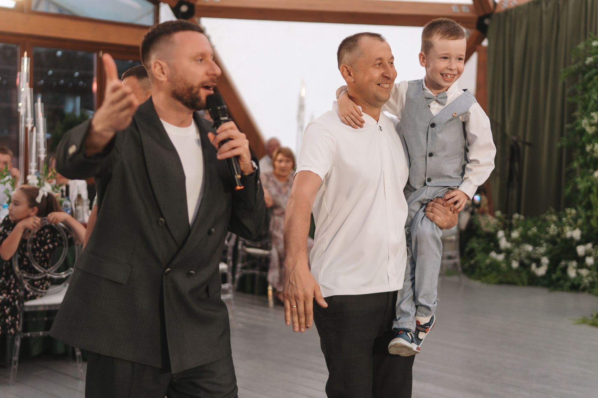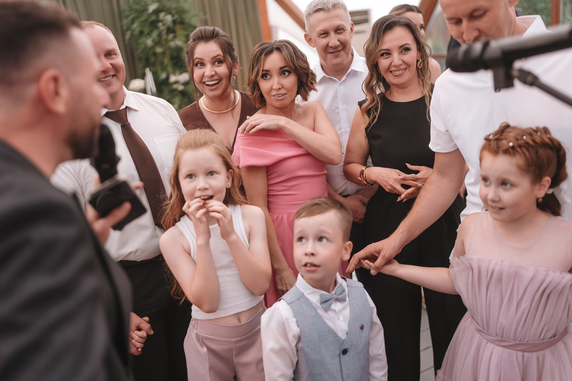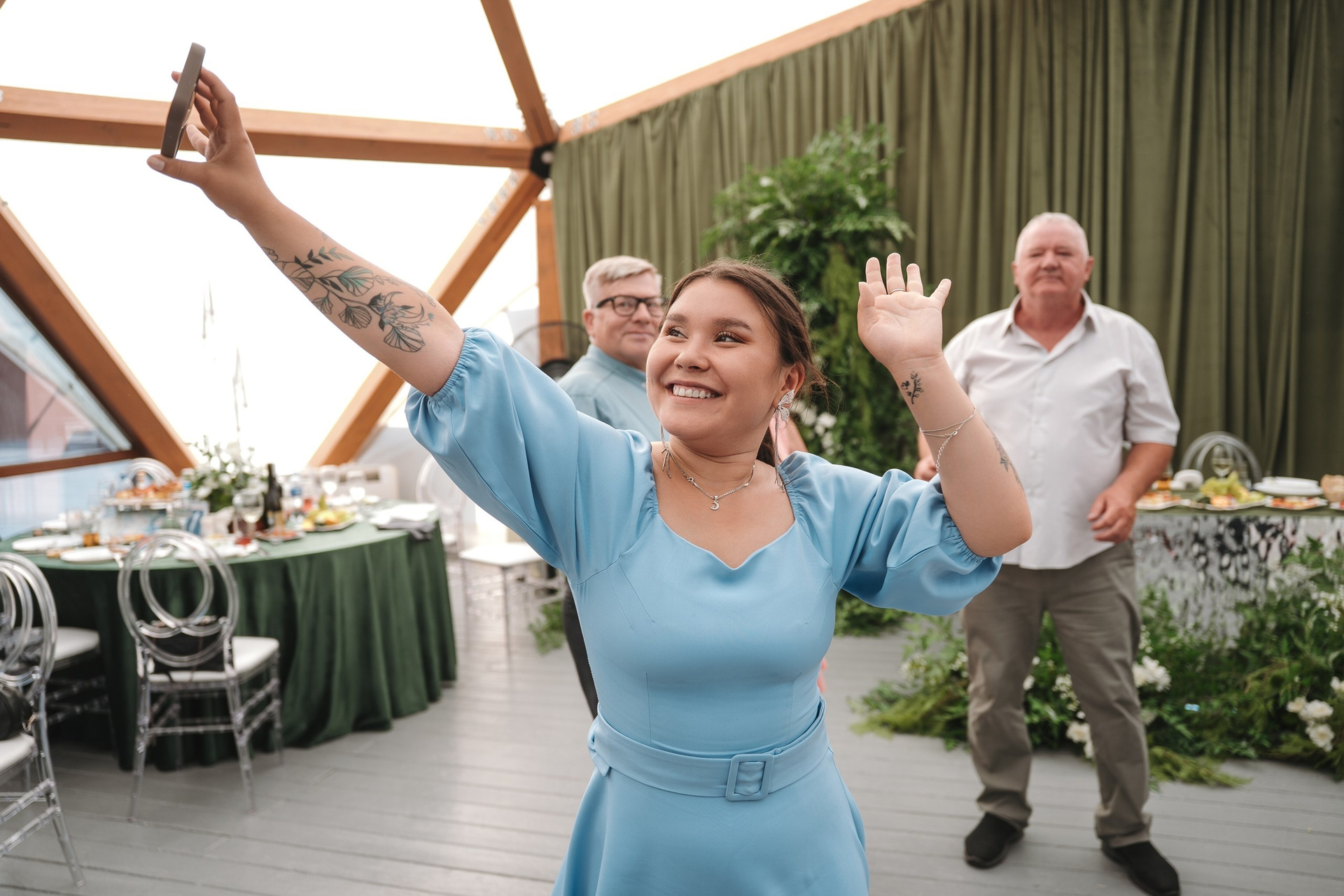 После церемонии начался банкет. Здесь уже была настоящая свадьба в полном смысле слова: танцы, радость, смех, красивые кадры, конкурсы, караоке. Во время пауз я снова снимал гостей — и в движении, и отдельно. Очень красивый первый танец, тёплые выступления от гостей. Работала кавер-группа WagWang Feelings — живо, энергично и очень по-летнему.