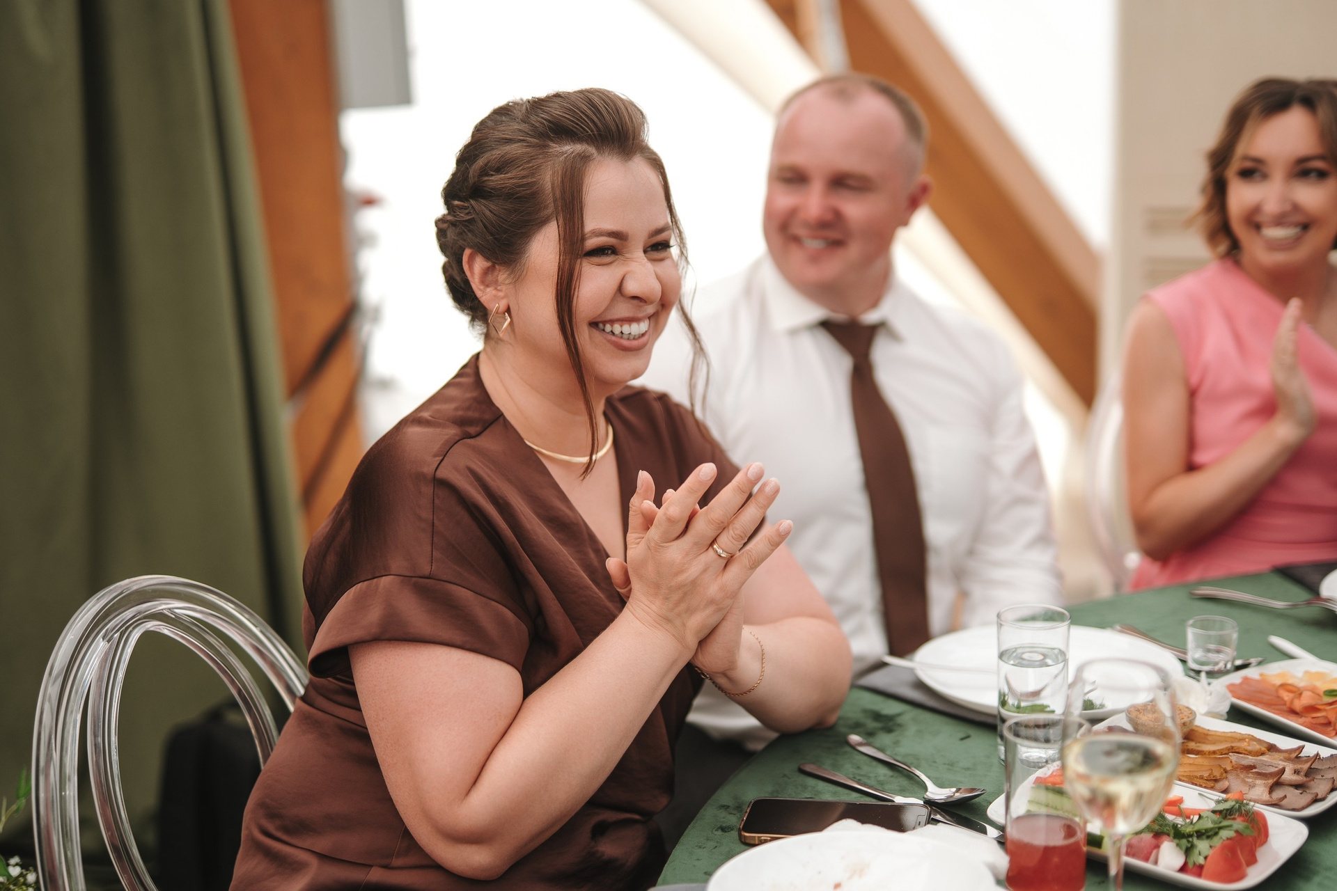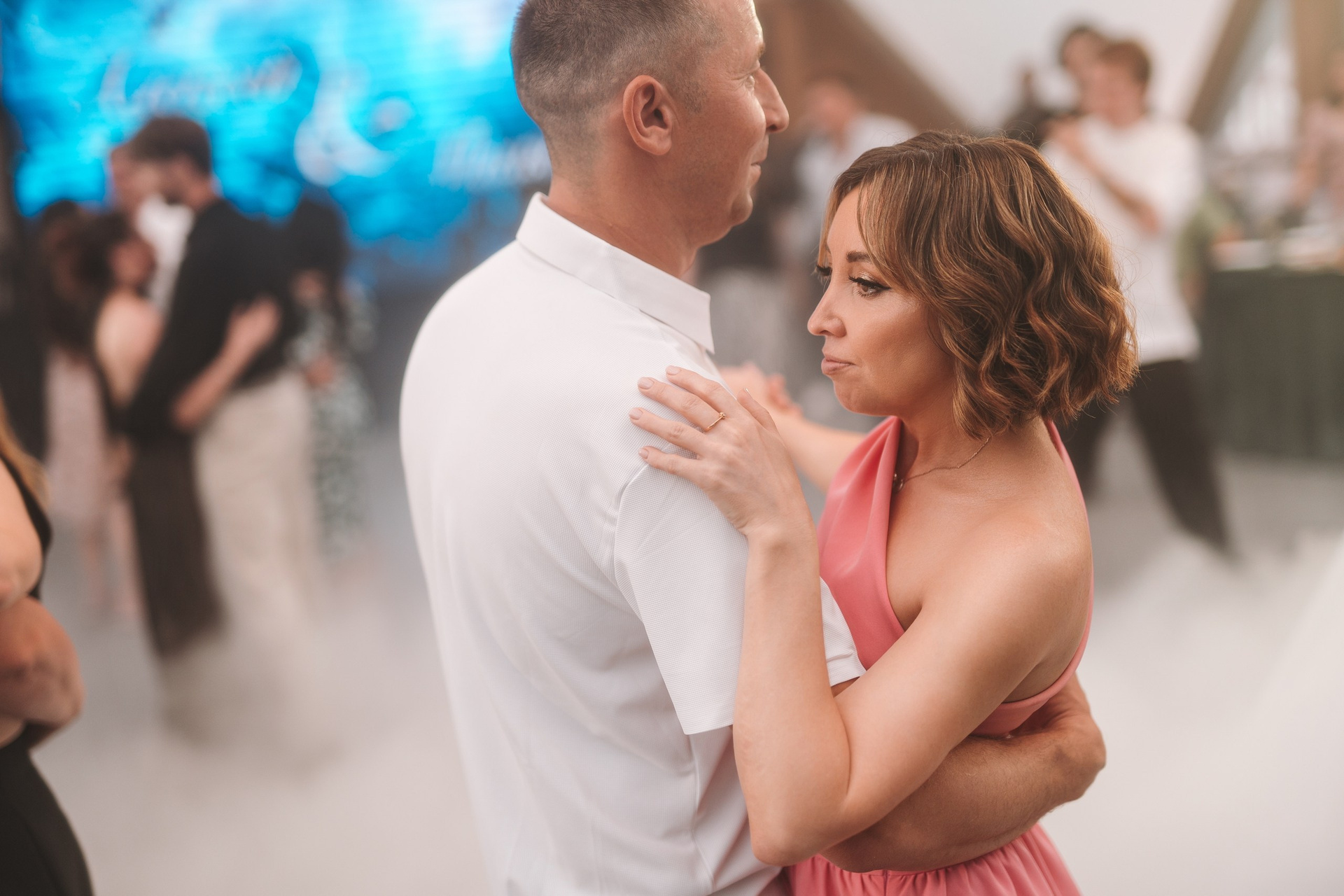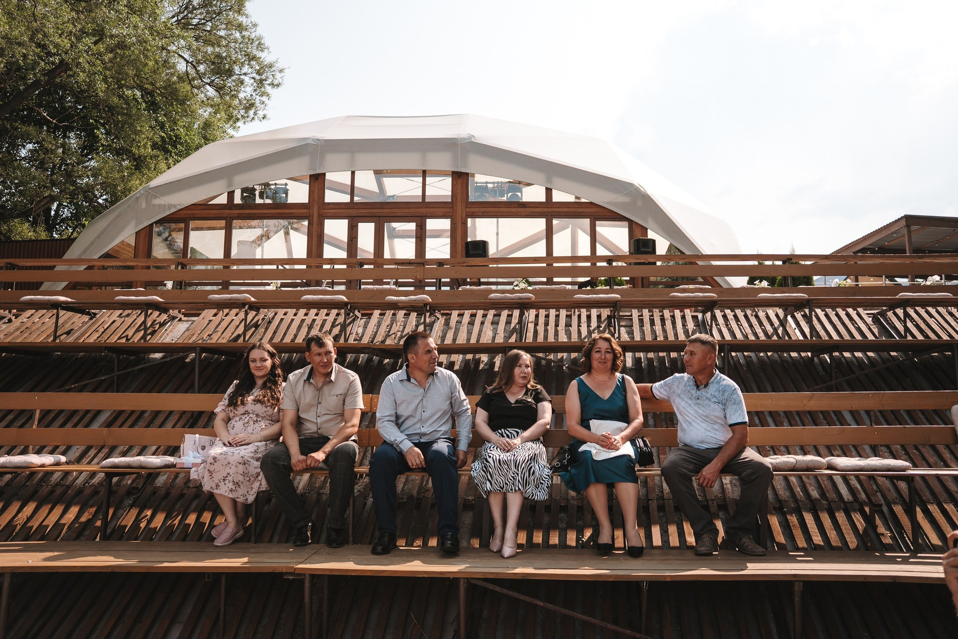 После церемонии начался банкет. Здесь уже была настоящая свадьба в полном смысле слова: танцы, радость, смех, красивые кадры, конкурсы, караоке. Во время пауз я снова снимал гостей — и в движении, и отдельно. Очень красивый первый танец, тёплые выступления от гостей. Работала кавер-группа WagWang Feelings — живо, энергично и очень по-летнему.