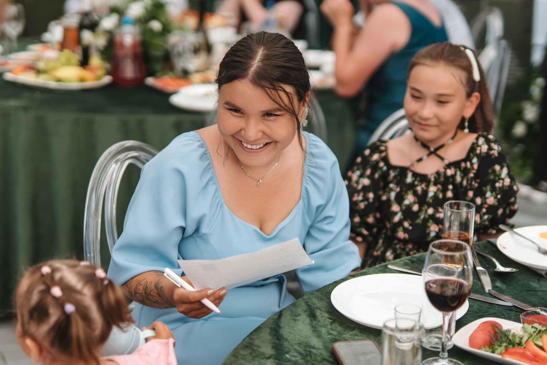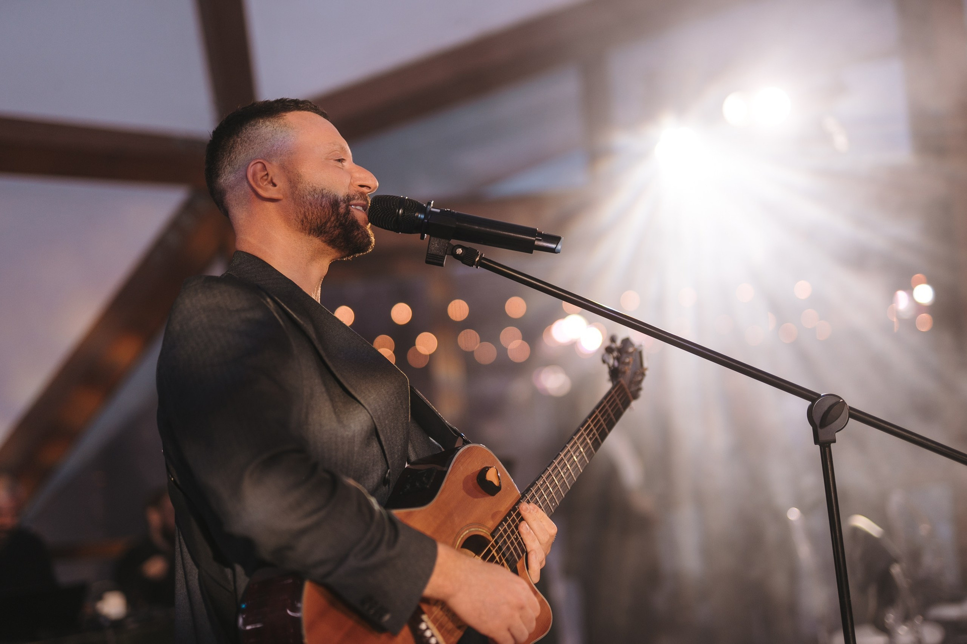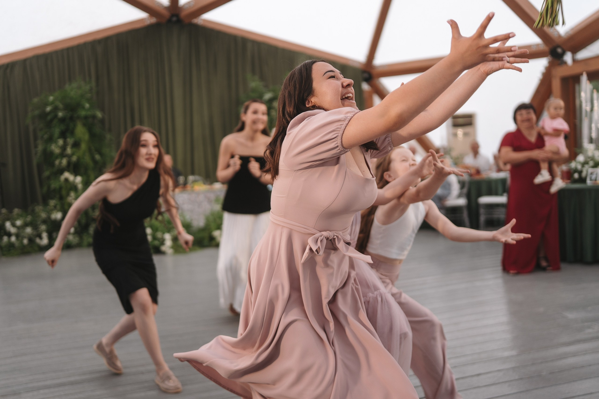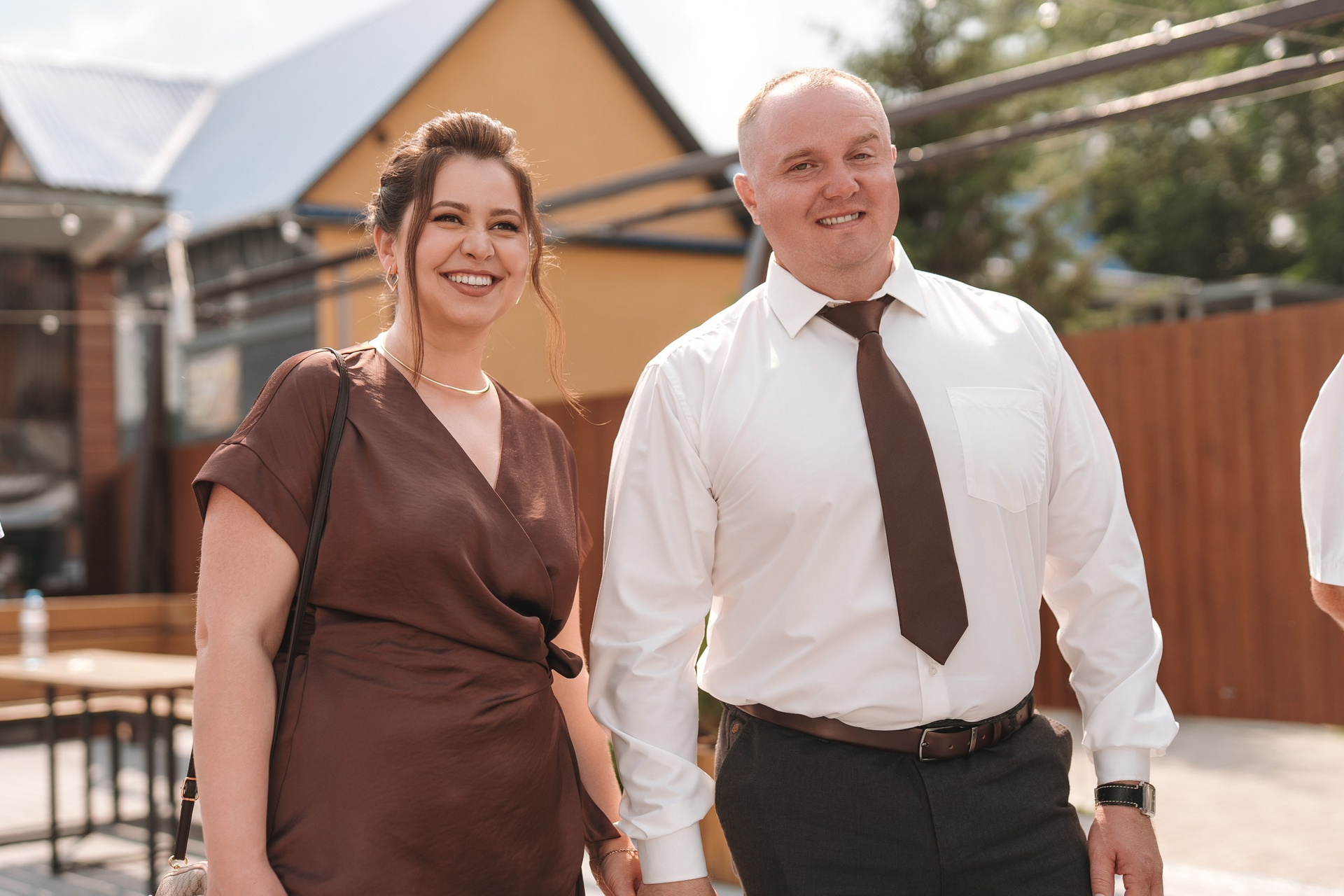 После церемонии начался банкет. Здесь уже была настоящая свадьба в полном смысле слова: танцы, радость, смех, красивые кадры, конкурсы, караоке. Во время пауз я снова снимал гостей — и в движении, и отдельно. Очень красивый первый танец, тёплые выступления от гостей. Работала кавер-группа WagWang Feelings — живо, энергично и очень по-летнему.