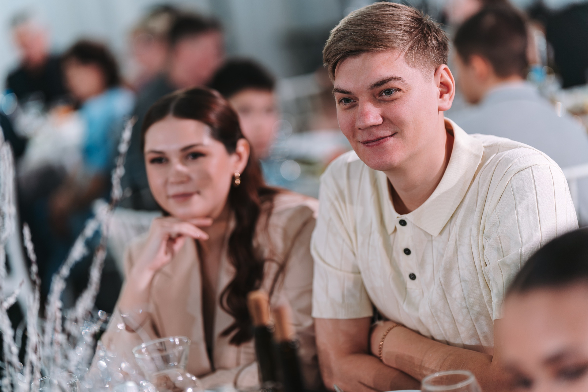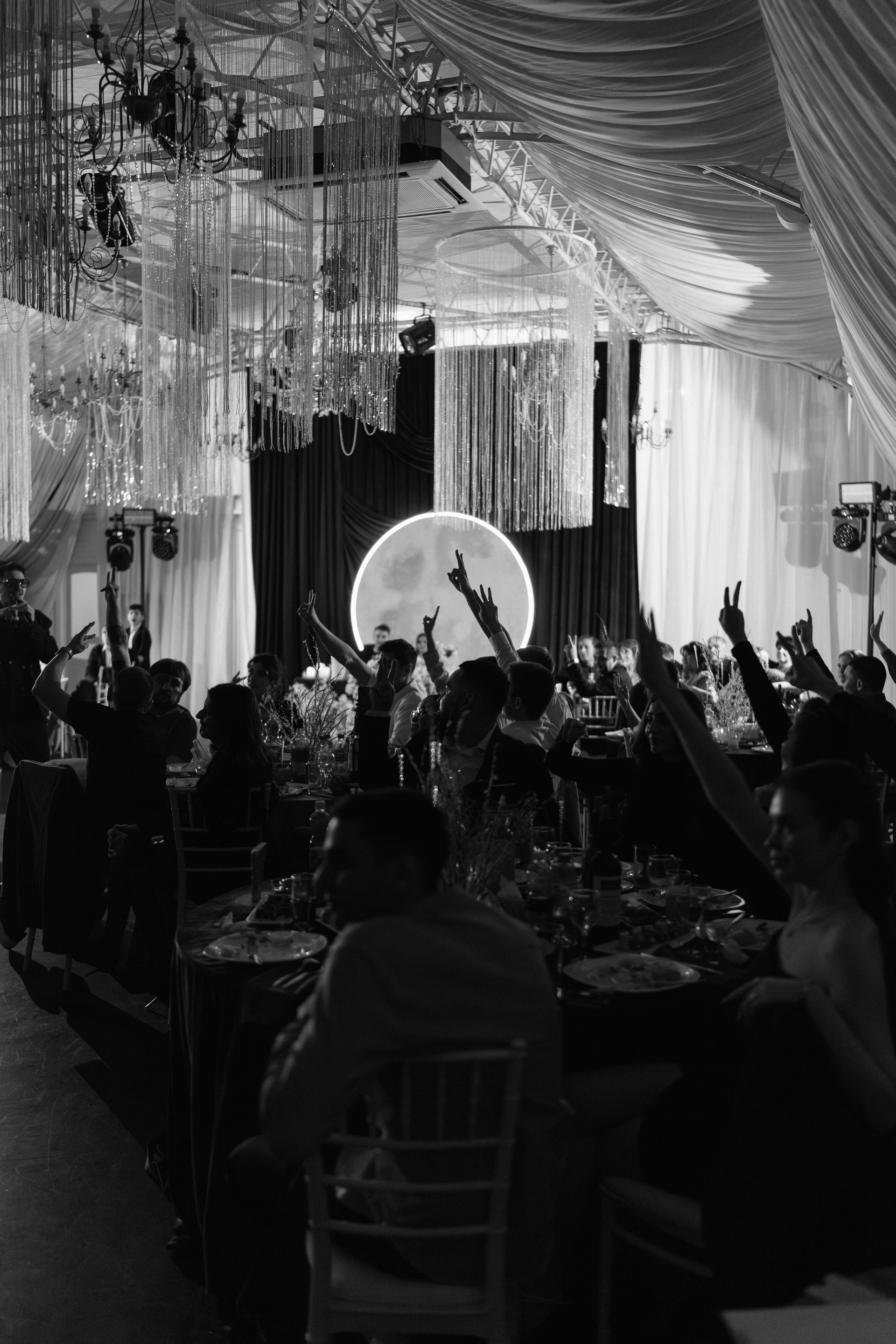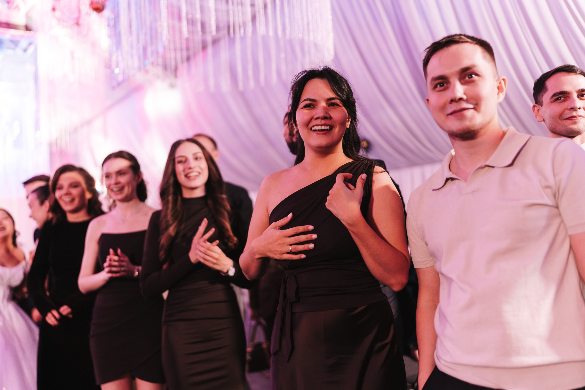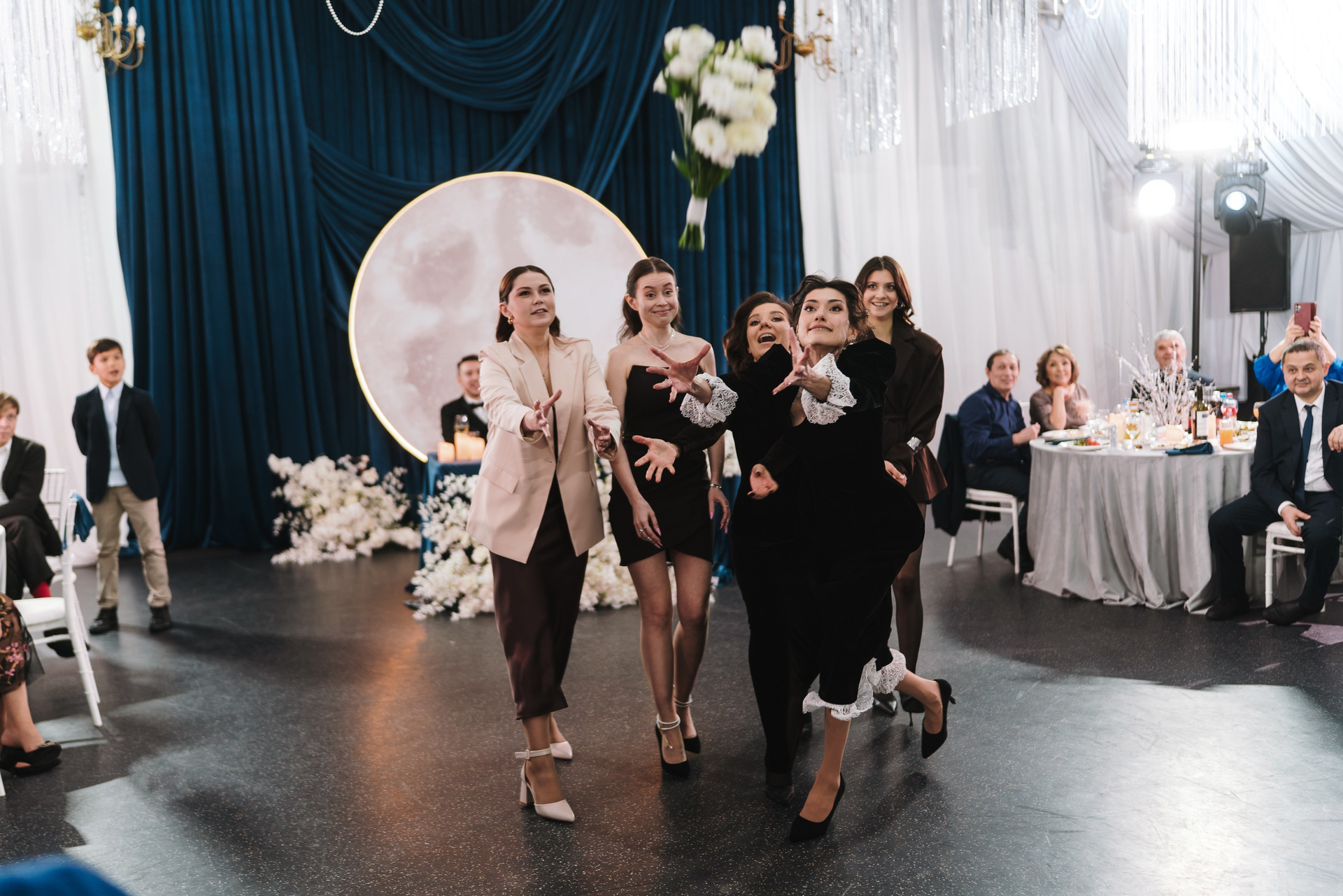 Первый танец молодых получился особенно эффектным: густой дым, аккуратно выстроенный свет, насыщенные цвета — всё выглядело очень кинематографично. Было много тостов, интерактивов, танцев и хорошей движухи, но без хаоса. Световая работа на протяжении всего вечера держала уровень, зал смотрелся дорого и цельно.