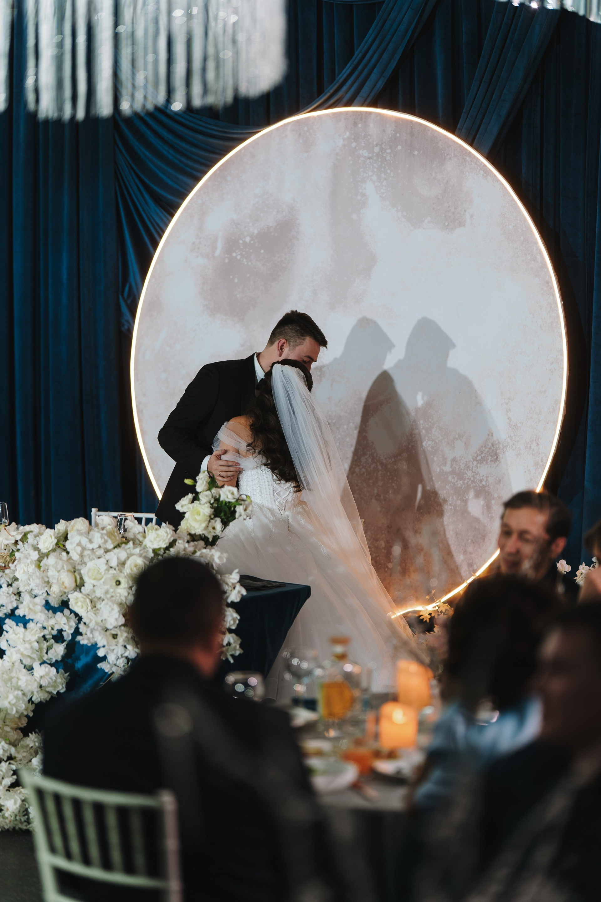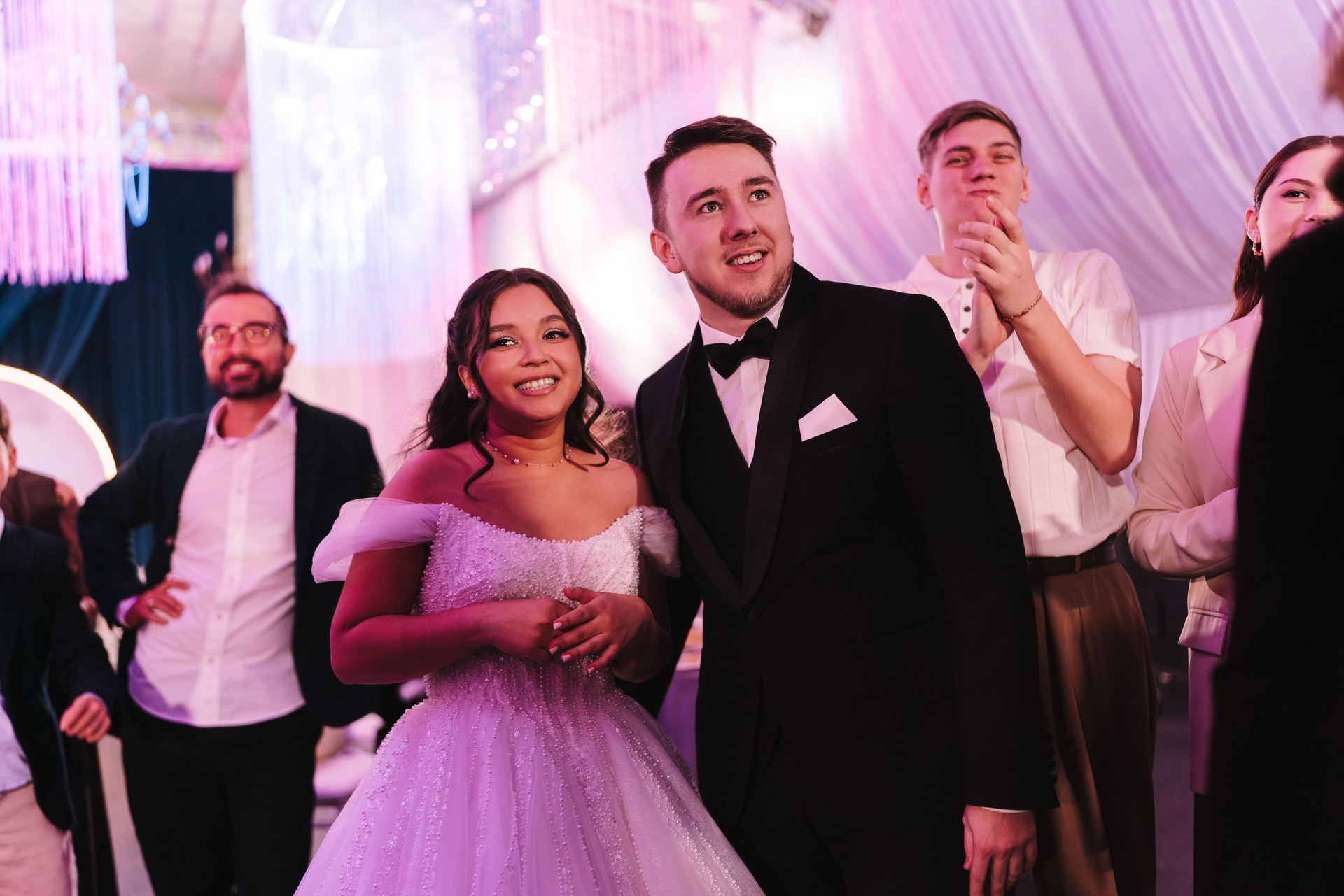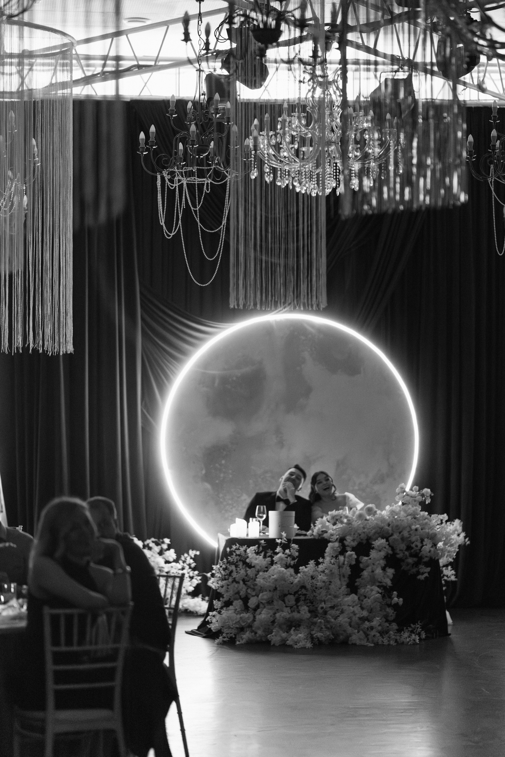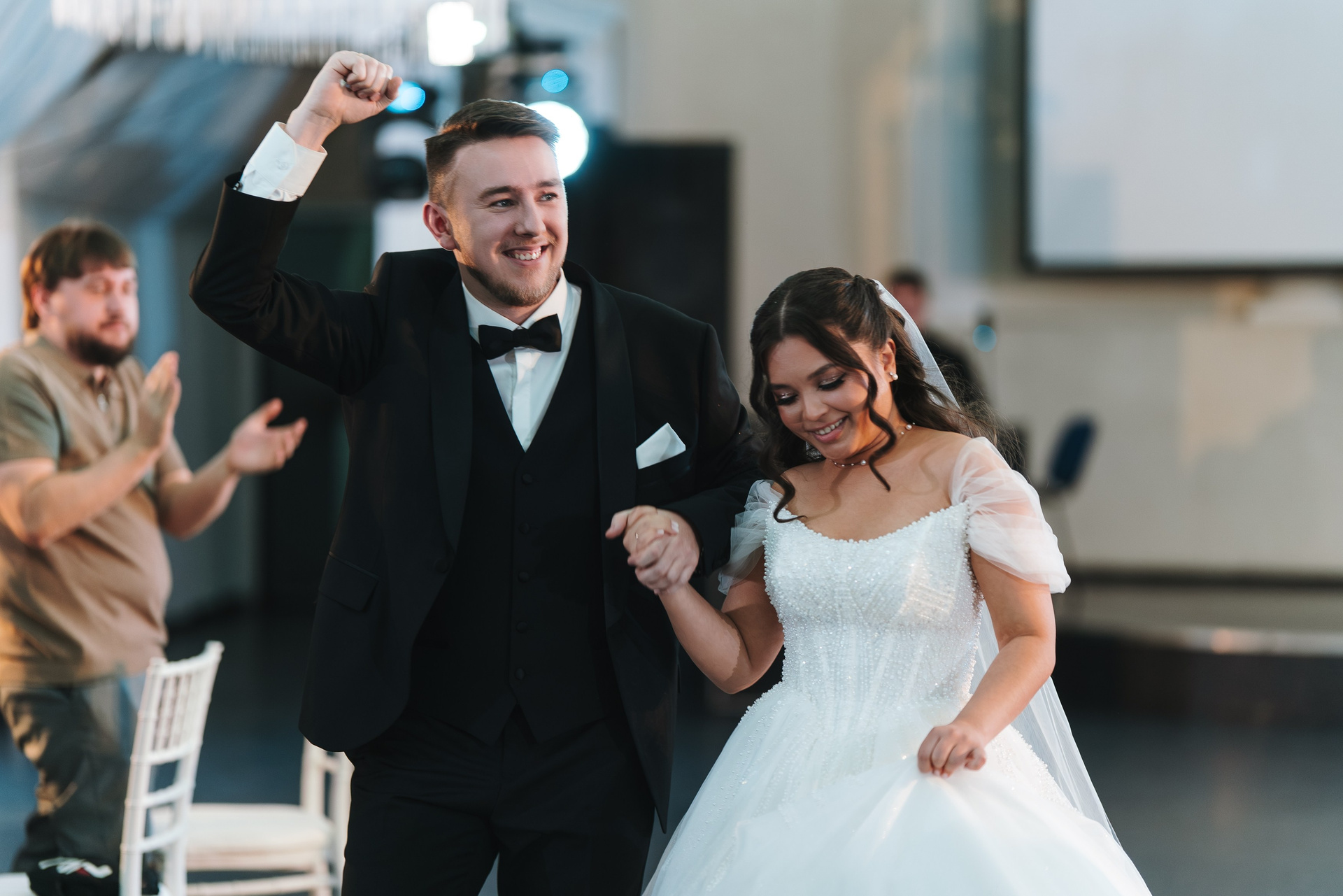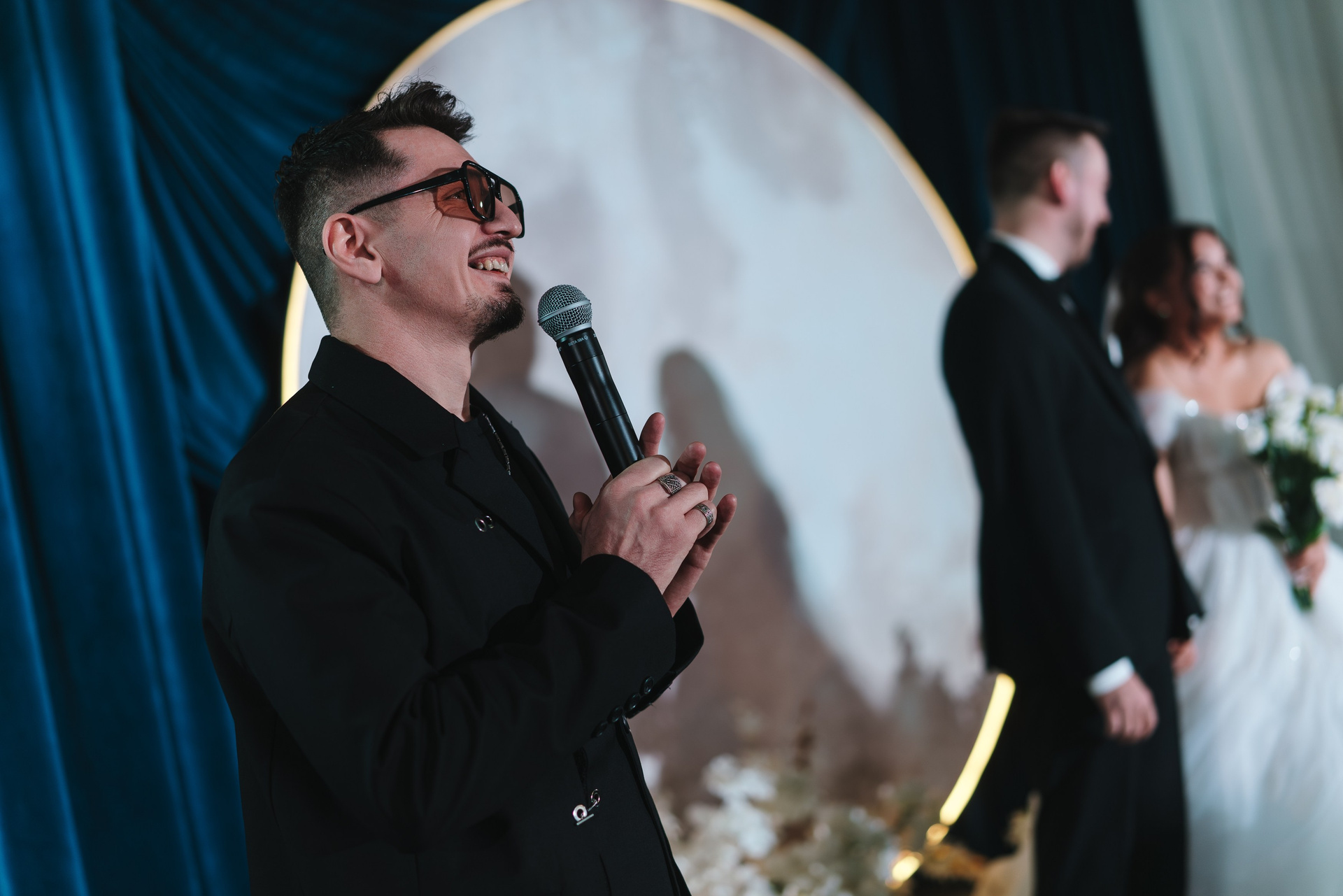 Первый танец молодых получился особенно эффектным: густой дым, аккуратно выстроенный свет, насыщенные цвета — всё выглядело очень кинематографично. Было много тостов, интерактивов, танцев и хорошей движухи, но без хаоса. Световая работа на протяжении всего вечера держала уровень, зал смотрелся дорого и цельно.