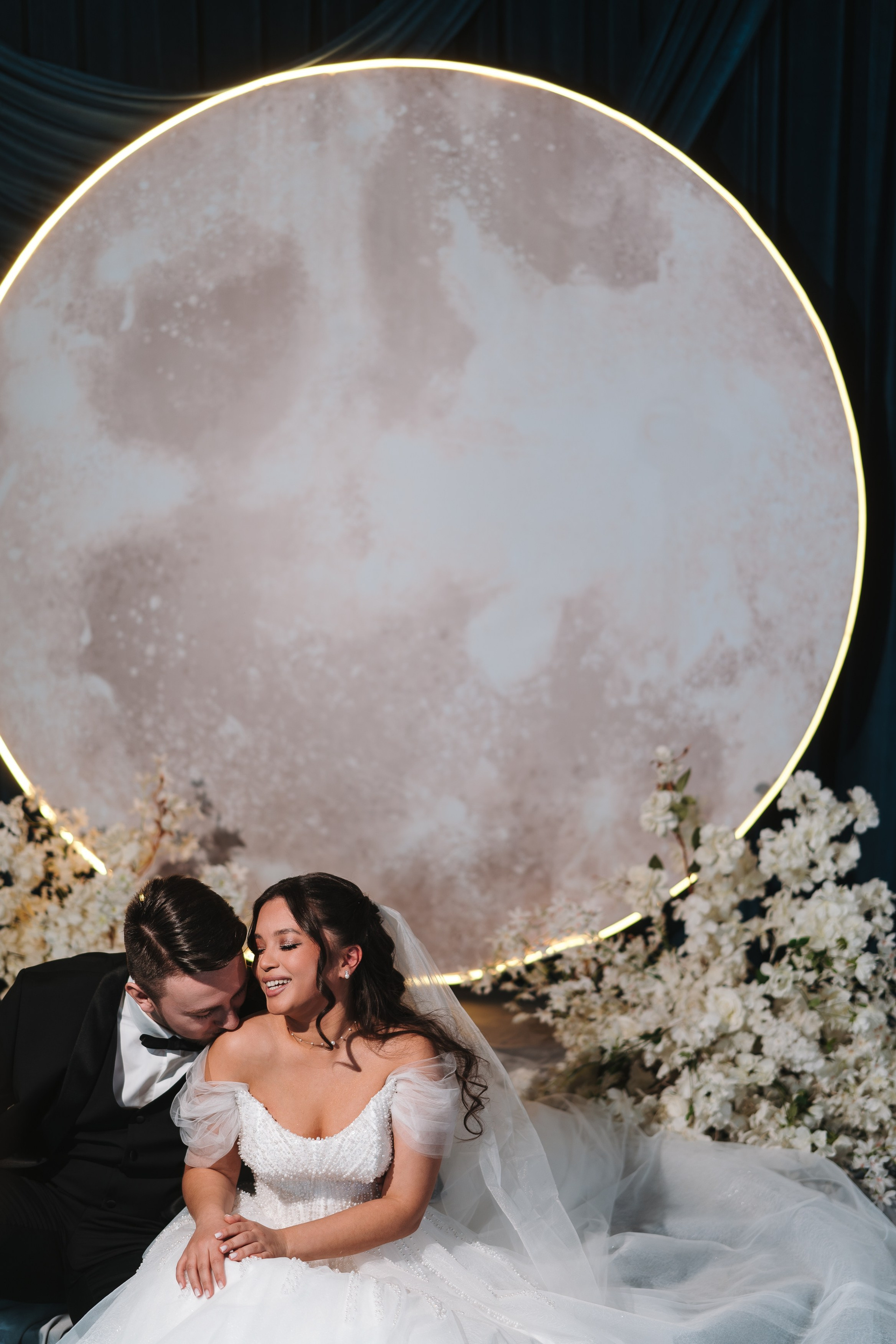 Зимой такая съёмка — идеальное решение. Когда не хочется выходить на улицу, но при этом хочется индивидуальности. Если ехать в фотостудию — интерьер будет примерно таким же, как у сотен других пар. А здесь декор сделан под конкретную пару, под их свадьбу, под их формат. Он уникален хотя бы потому, что существует только в этот день.